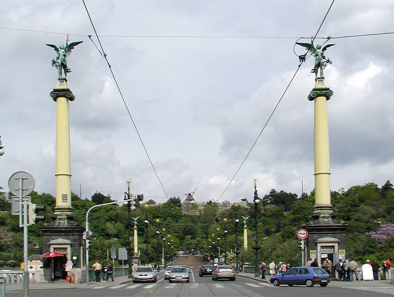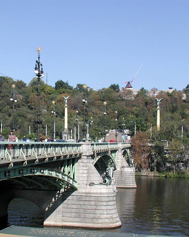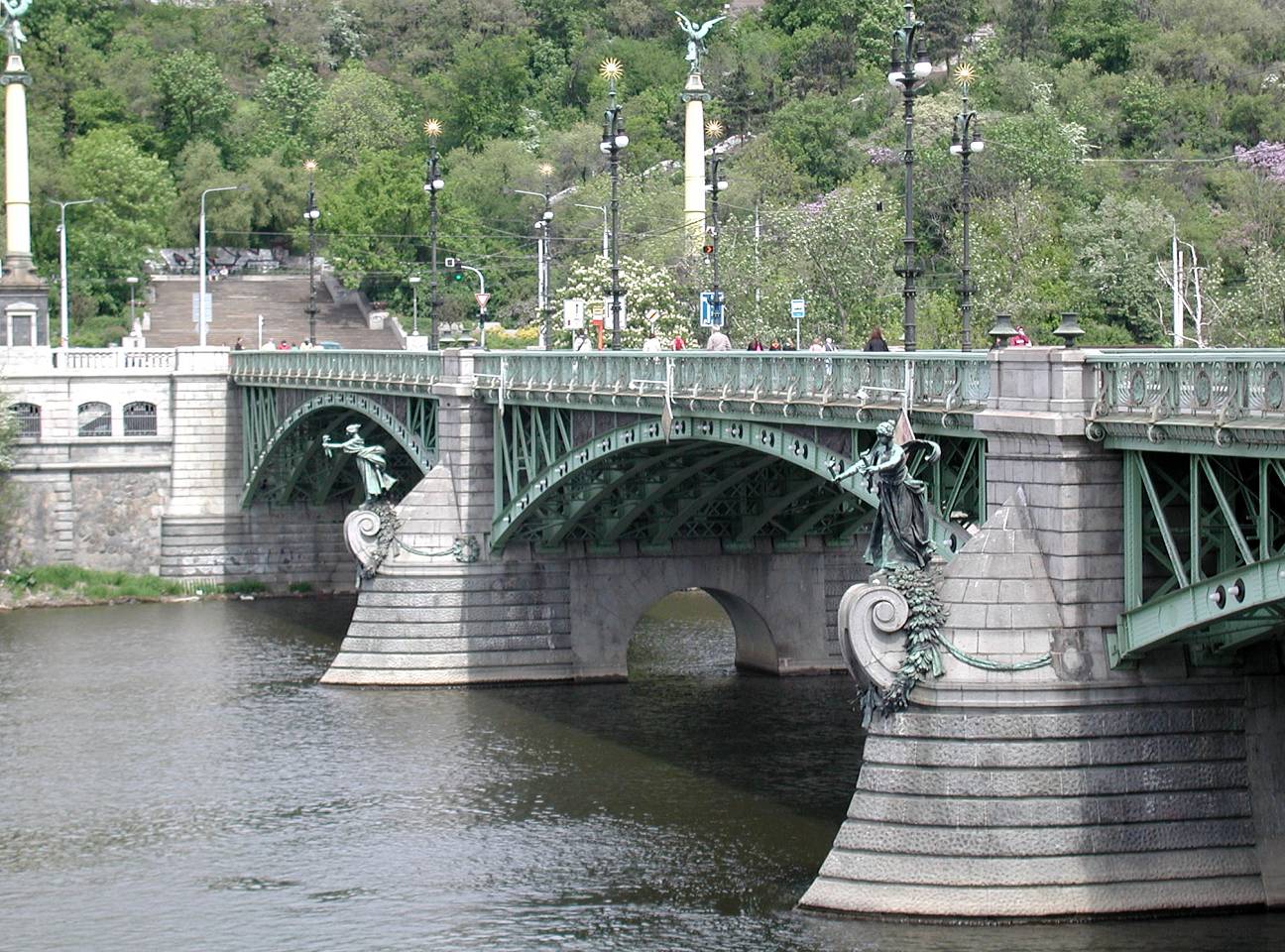 Die Grundsteinlegung war am 17.4.1907 in Anwesenheit von Kaiser Franz Josef I. Die Stahlbögen (48, 53, 59m) errichteten drei Prager Brücken-Baufirmen. Es war ein Verdienst von Jan Koula (tschechischer Architekt und Maler), daß die Brücke die erste Vertreterin des Sezessionsstils (Jugendstils) und damit eine der schönsten Brücken Prags wurde. Die Gehsteige waren mit dreifarbigen Mosaiksteinen mit Schachbrett- und Fischchen-Abbildungen ausgelegt. Die Fahrbahn wurde mit 13 cm hohen Holzstäbchen aus dem australischen Hartholz Jarrah gepflastert und hielt bis 1961!