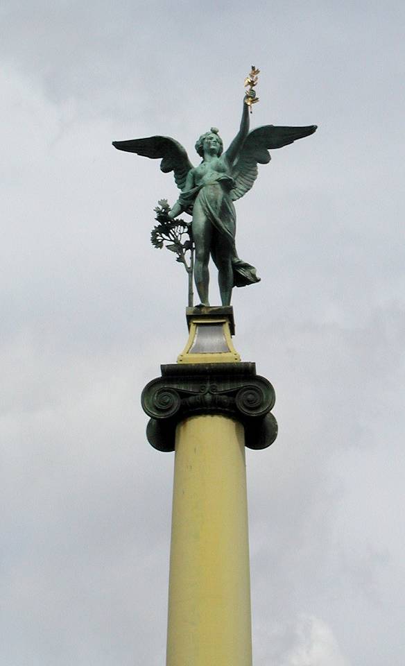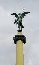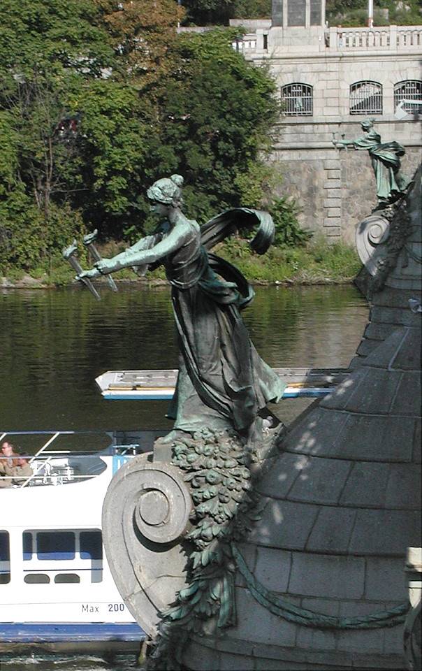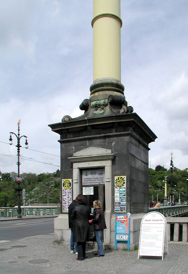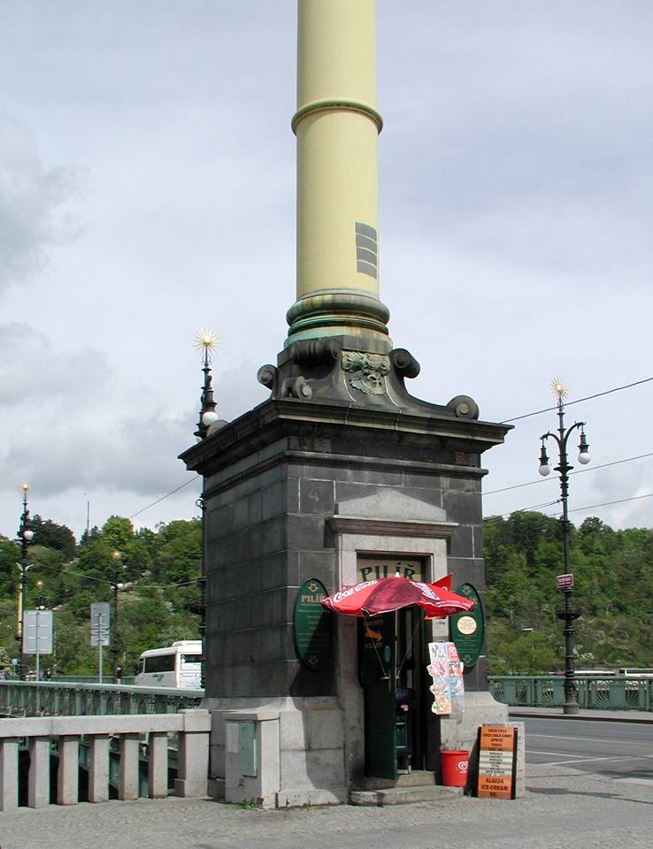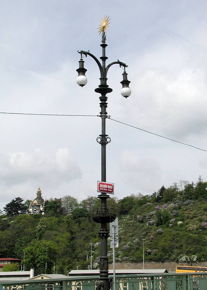 An den beiden Brückenenden stehen jeweils zwei 17,5m hohe gusseiserne Säulen mit ca. 3 m hohen Bronzefiguren der Viktoria (Siegesgöttin) mit vergoldeten Zweigen des Bildhauers Antonín Popp. Die Säulen stehen auf den Dächern der früheren Mauthäuschen. Die Brückenpfeiler-Vorderseiten zieren Fackelhalter-Bronzestatuen von den Bildhauern L. Herzl und Karel Opatrný, auf den Rückseiten der Pfeiler sind sechsköpfige Wasserschlangen mit dem Prager Wappen vom Bildhauer Ludìk Wurzl zu sehen.