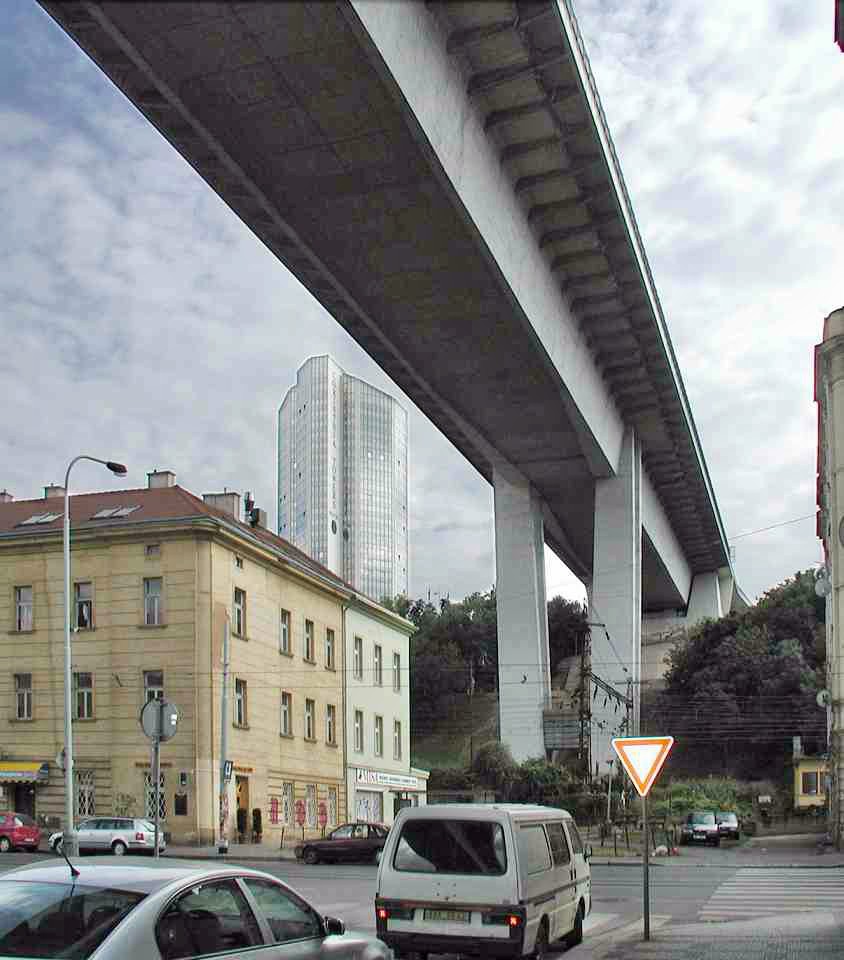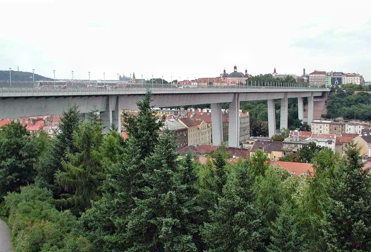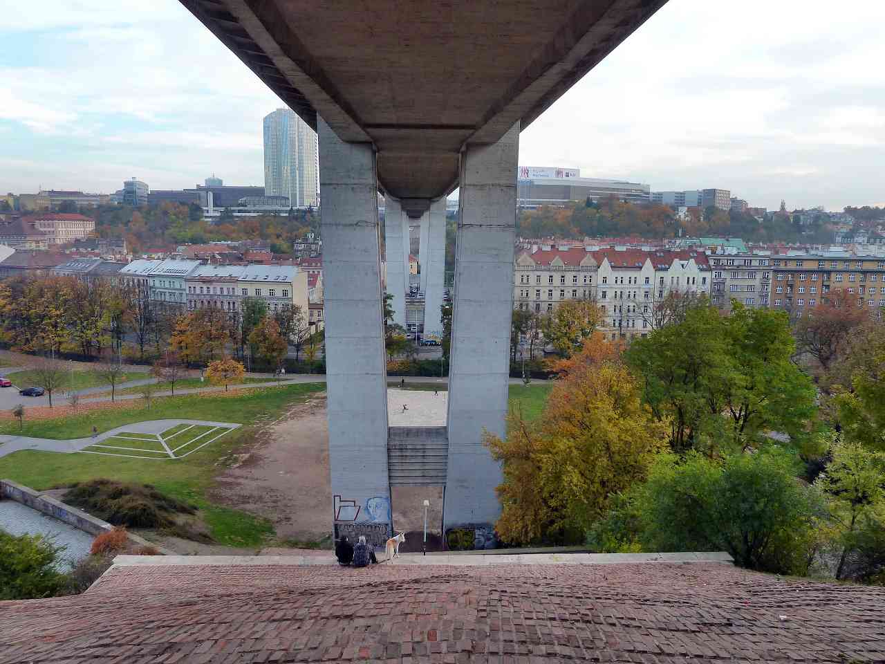 Die Brücke überspannt das Tal des Stadtviertels Nusle mit dem Bach Botič, von der Pankrác-Anhöhe mit dem Kongresszentrum und Hotel-Wolkenkratzern bis zur Neustadt.