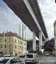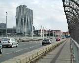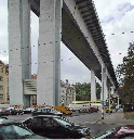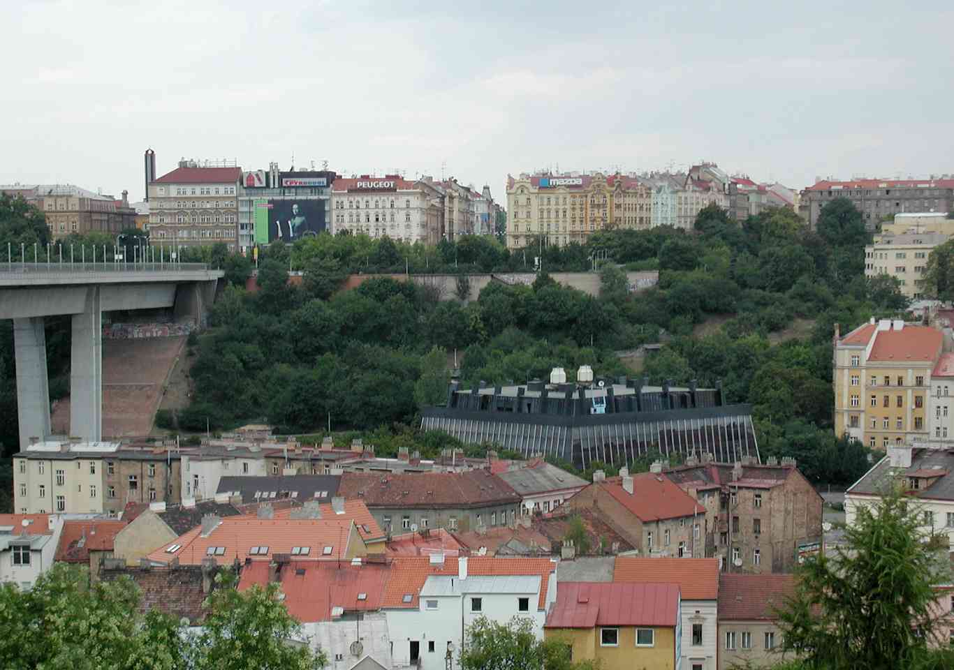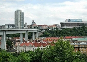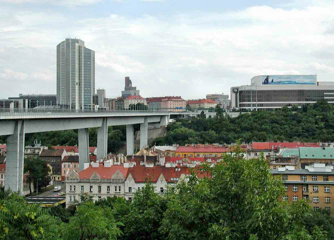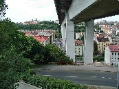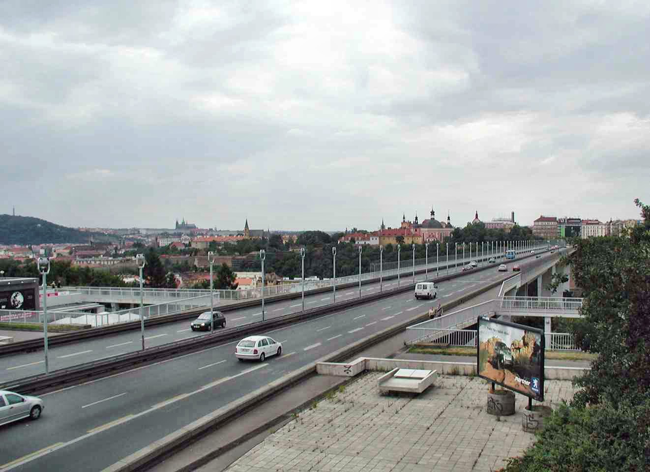 Die Brücke überspannt das Tal des Stadtviertels Nusle mit dem Bach Botič, von der Pankrác-Anhöhe mit dem Kongresszentrum und Hotel-Wolkenkratzern bis zur Neustadt.