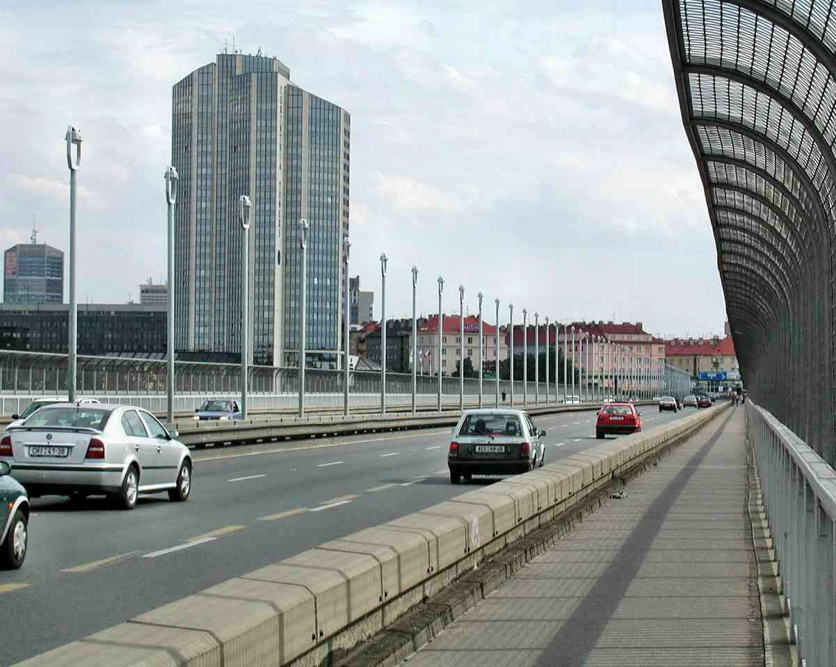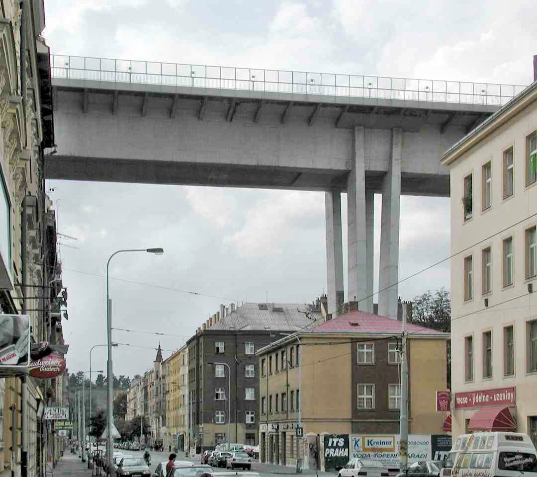 Erbaut wurde die Brücke zwischen 1965 und 1973. Sie ist 485m lang und 40m hoch. Unter der Fahrbahn im Brückenkörper – verstärkt durch einen 822 t schweren Stahlrost – verkehren die Züge der Prager Metro.