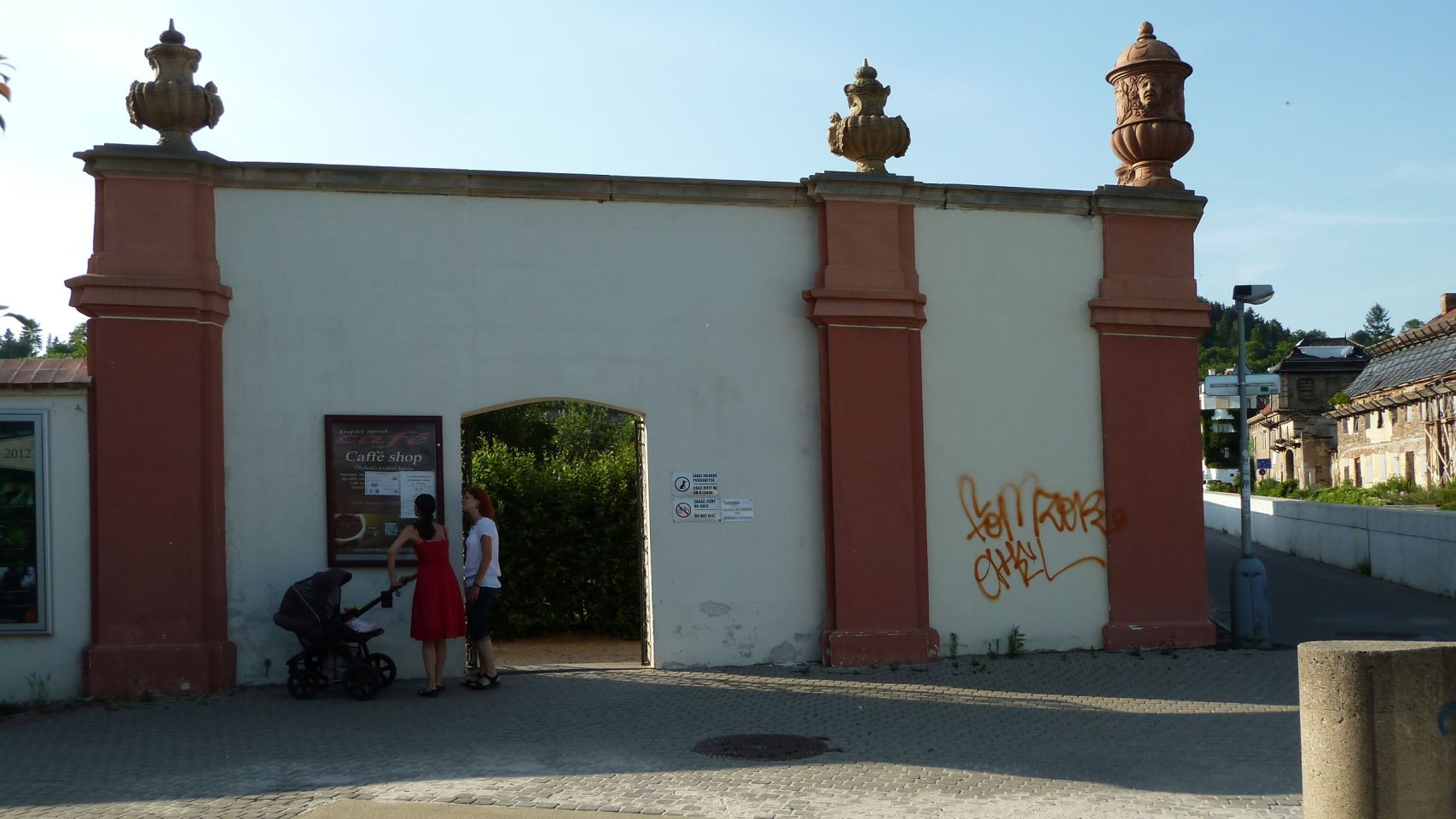 Gleich nach der Brücke stehen wir an der Gartenmauer-Ecke des Troja-Schlosses, einem der schönsten Barockschlösser des 17. Jahrhundert. Hier ist ein kleiner Eingang direkt in den Garten. Sollte der Eingang verschlossen sein, links an der Mauer entlang erreichen wir den Eingang zum Schloß-Garten und gegenüber auch den Eingang zum Tiergarten, dem Prager ZOO.