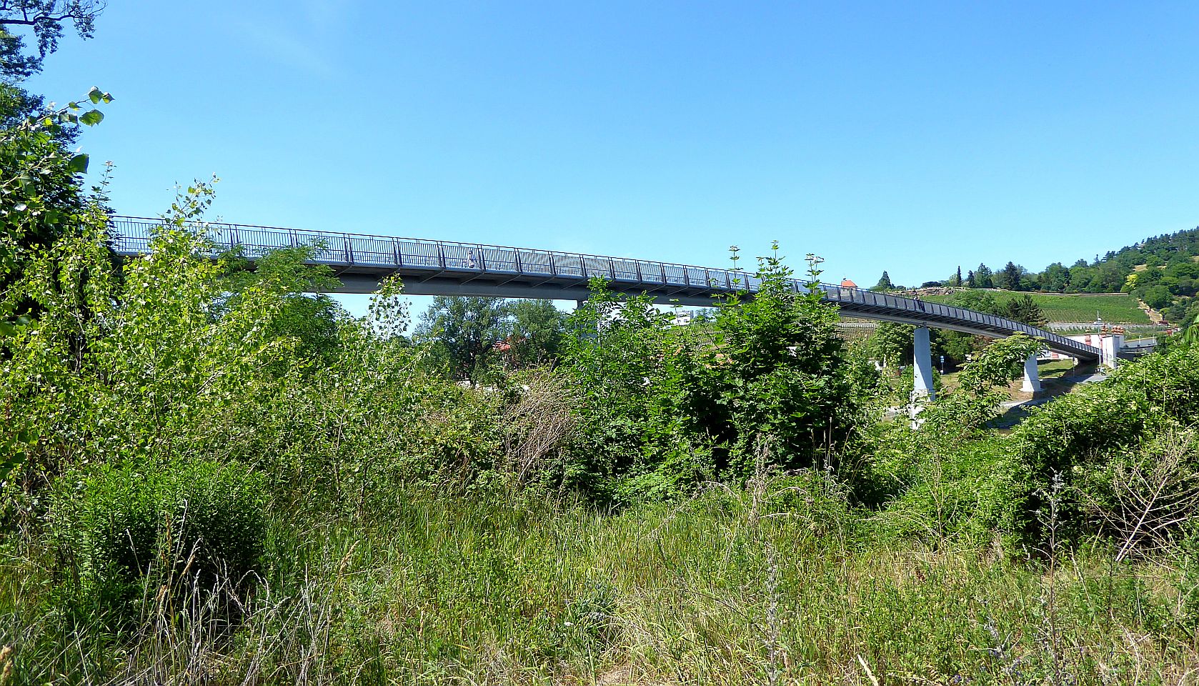 Seit dem 7.Juli 1984, besticht die neue Brücke durch eine eigenartige Konstruktion aus einzelnen Segmenten, die auf Stahlseilen aufgehängt sind. Sogar das katastrophale Hochwasser 2002 hat sie überstanden. Sie ist 256 m lang und 3,8 m breit und hat eine Steigung von ca. 10 grad. Wenn auch nur für den Fußgängerverkehr bestimmt, erlaubt sie im Notfall auch die Überquerung von Krankenwagen und Feuerwehrfahrzeugen.