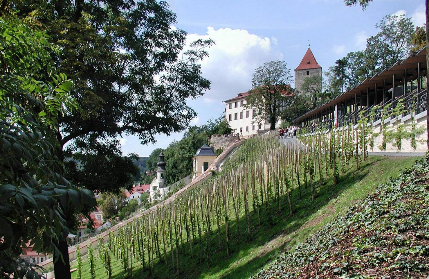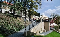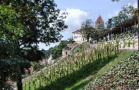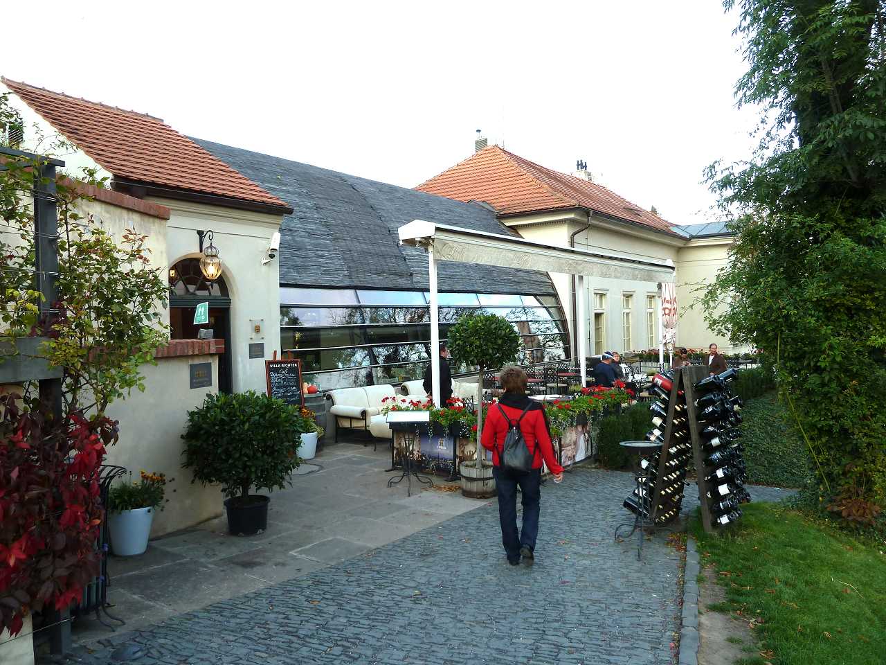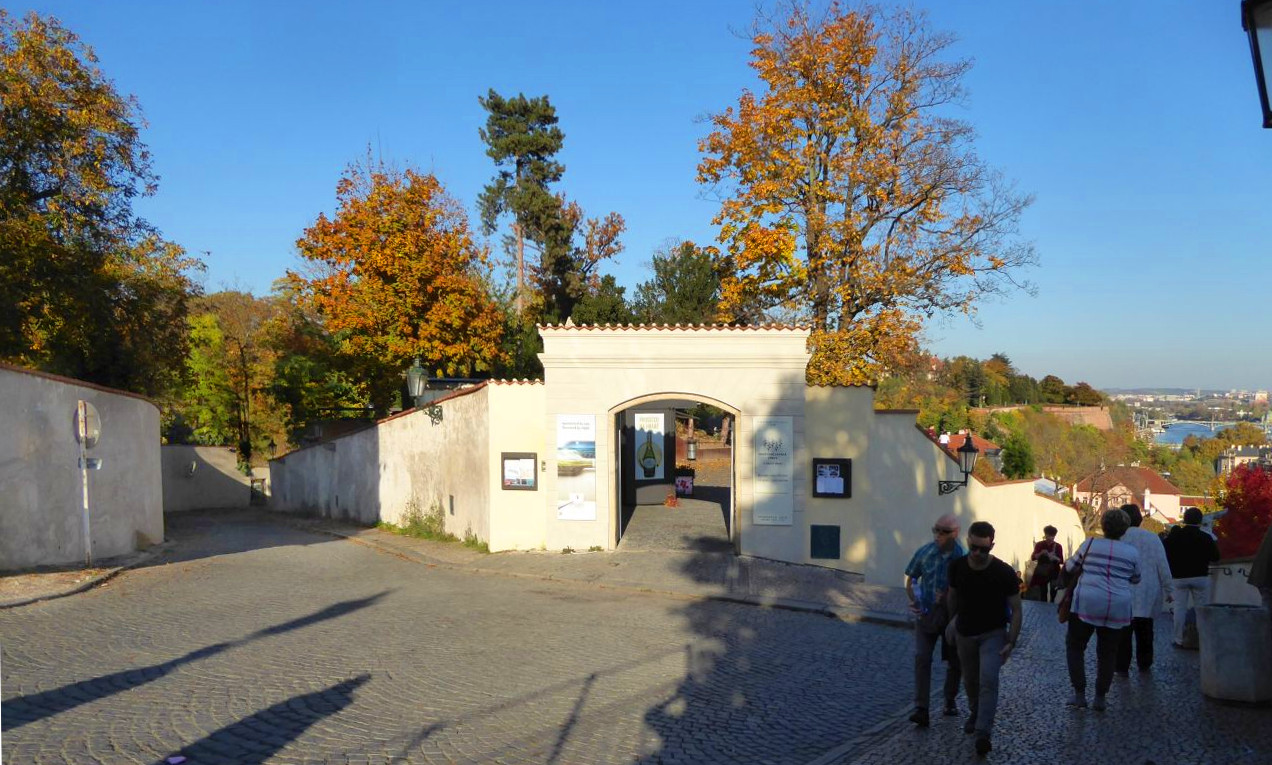Hier am Ende der alten Schloßstiege ist auch der Eingang zu der Weinberge des hl. Václav mit der Richter-Villa, die bewirtschaftet ist. Der Ausgang führt weiter unten wieder auf die Schloßstiege zurück und somit ist die Besichtigung der Weinberge durchaus eine lohnende Alternative für den Rückweg zur Metrostation.