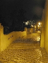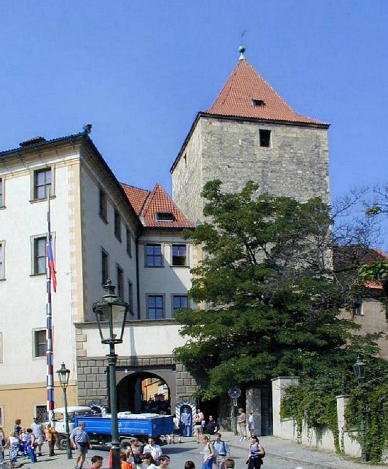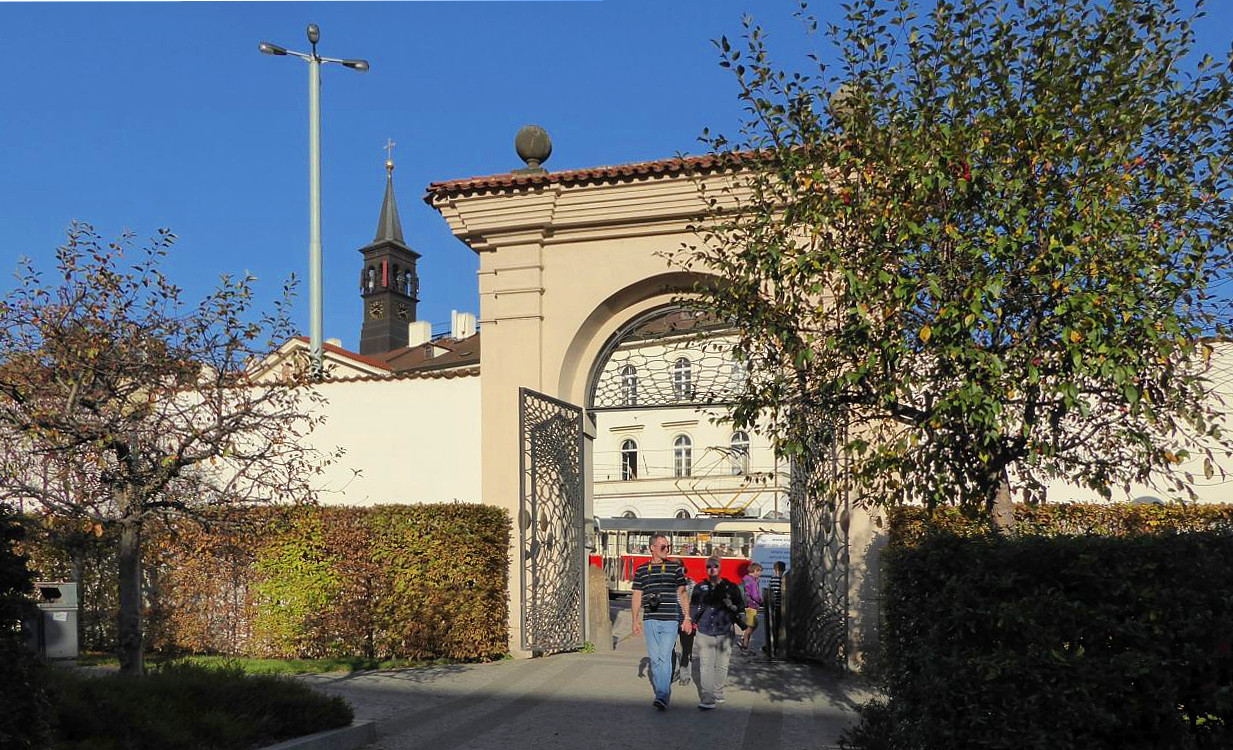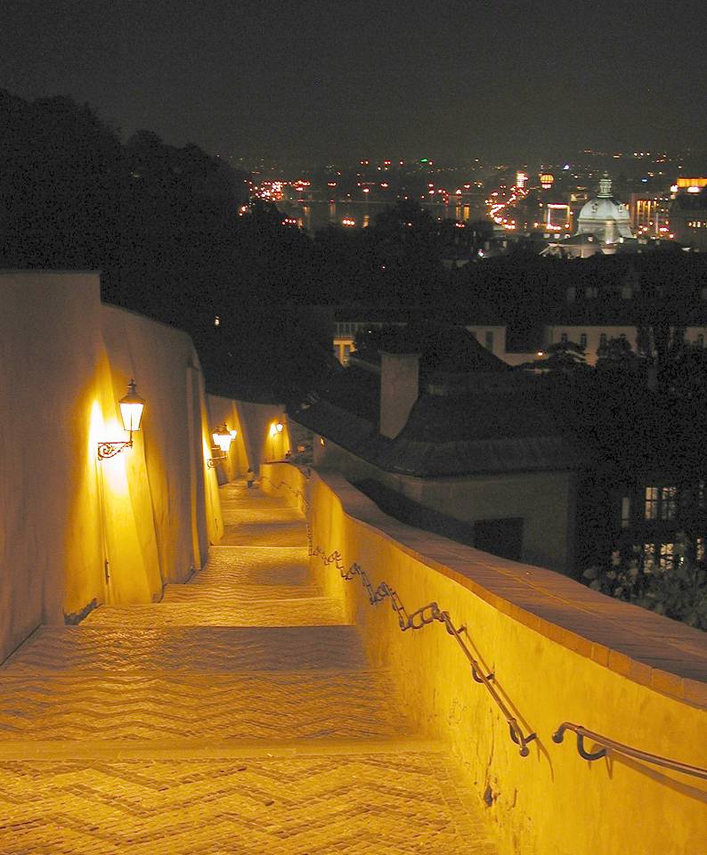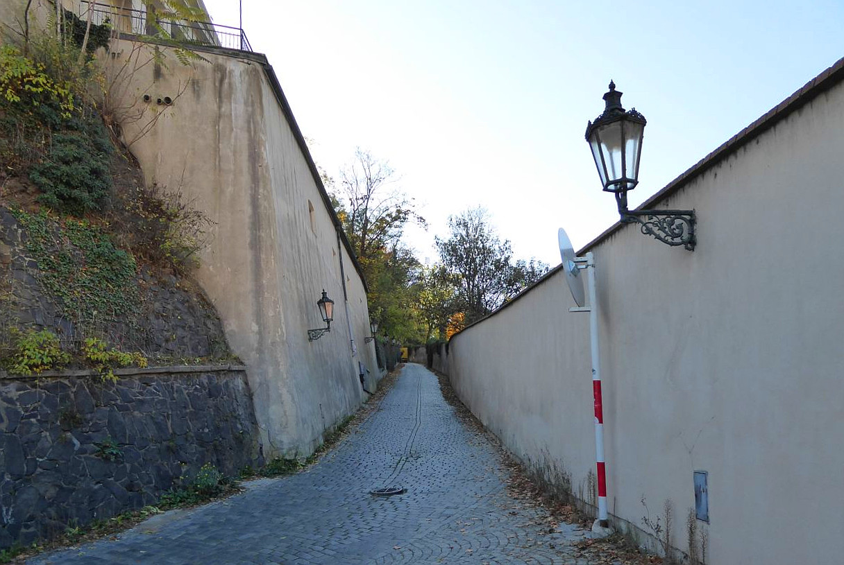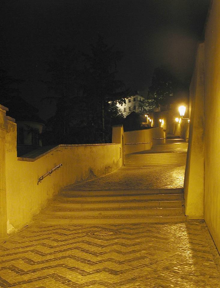Von der Metro-Station Malostránská durch die kleine Grünanlage kommt man zu der Alten Schloßstiege, die zum östlichen Eingang der Burg am Schwarzen Turm führt. Die Trasse steigt entlang der Hangmauer unterhalb der Weinberge des hl. Václav mit der Richter-Villa. Die Stiege wird an der Hangmauer gesäumt von verschidenen Andenkenständen und Straßenkünstlern.