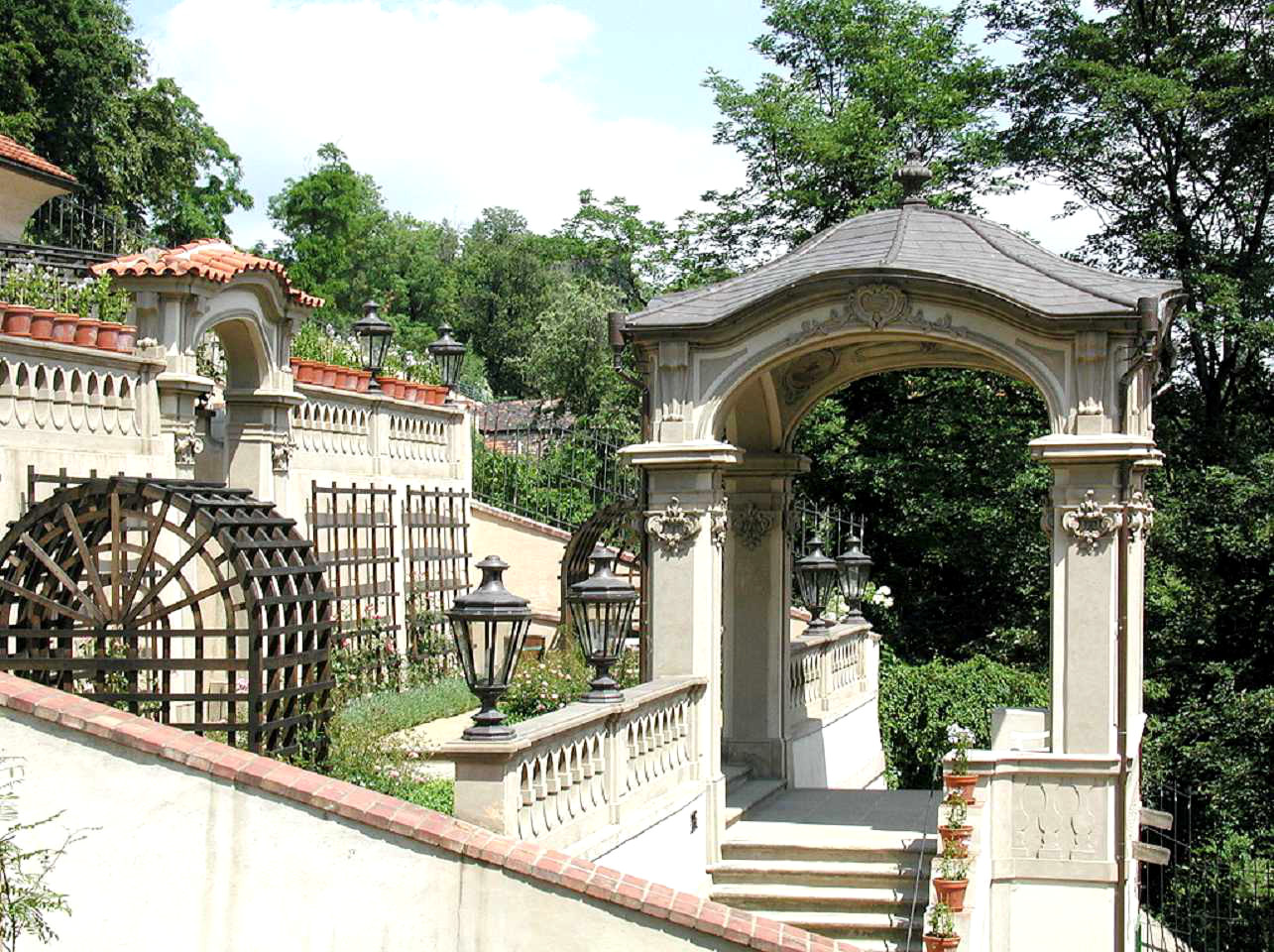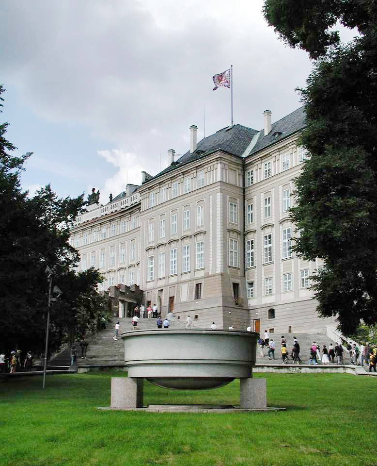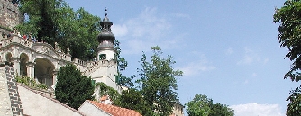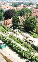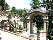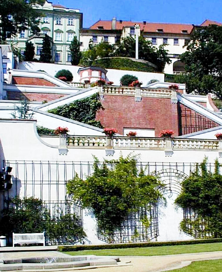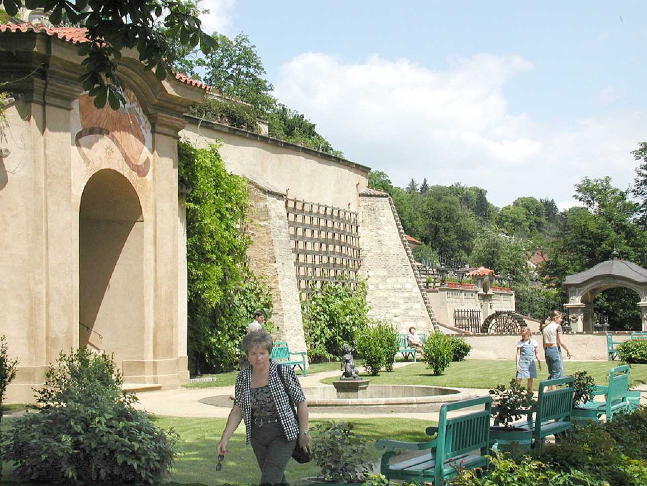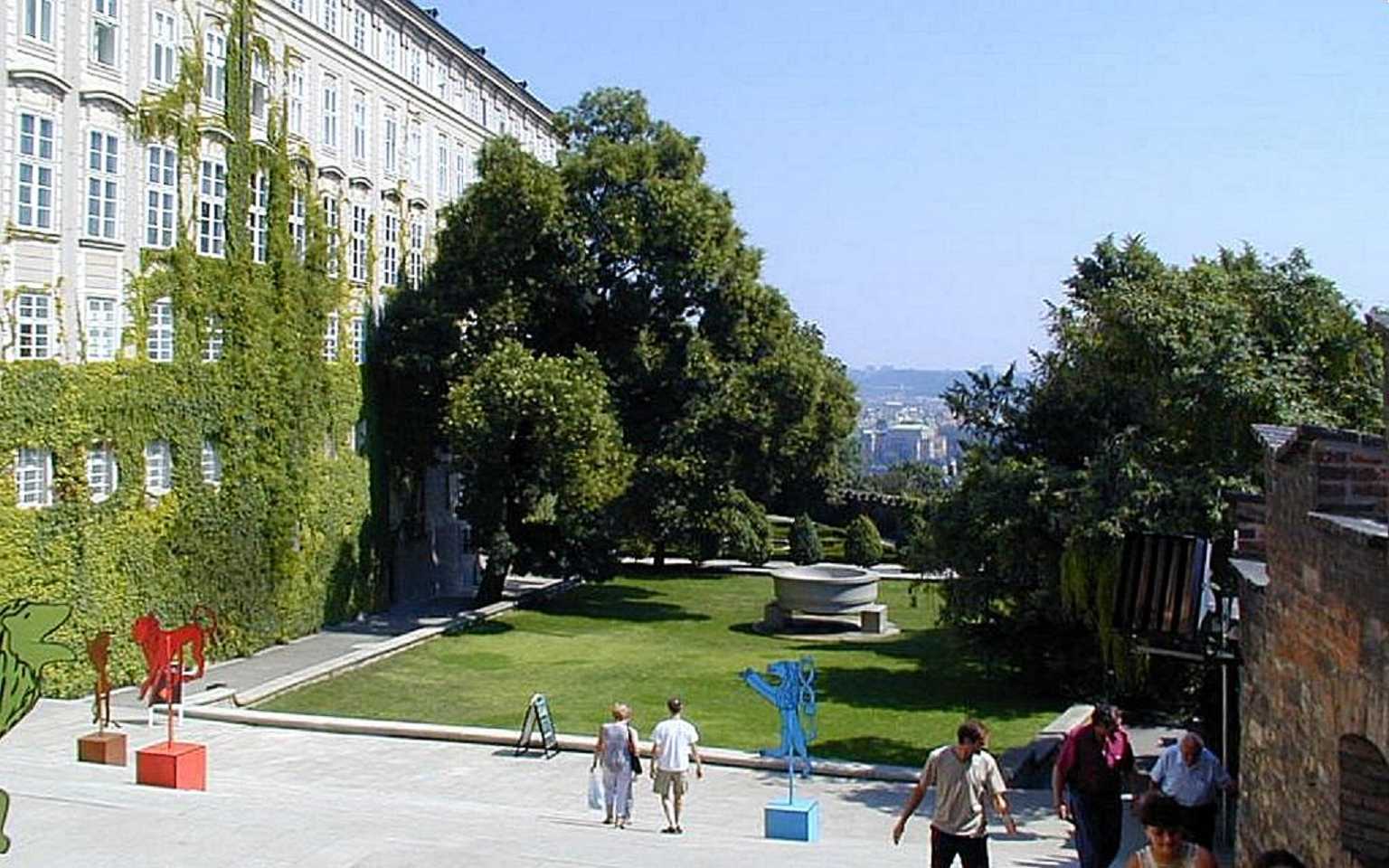 Übergangslos geht es zum Garten auf den Wallen, bzw. Wallgarten - Zahrada na Valech. Sie stammt bereits aus den Jahren um etwa 1550. Ferdinand der Tiroler ließ hier vor seinen Sommer-Burgräumen den Burggraben zuschütten um darauf einen Garten anzulegen. An der Grenze zum Paradiesgarten steht ein Aussichtsaltan vom Architekten J.Plečník 1922-24. In den Garten ragt aus der Burgfront der Ludwigs-Flügel des alten königlichen Palastes von dessen Fenster am 23.Mai 1618 zwei königliche Statthalter und ein Kanzleisekretär von den Vertretern der protestantischen Stände in die Tiefe gestoßen wurden. Dieser Prager Fenstersturz wird als Anfang des 30-jährigen Krieges angesehen. In der Nähe steht auch der Herkules-Brunnen, der hierher vom 1.Burghof übertragen wurde. Östlich vom königlichen Palast zieht sich dann das Gebäude des Adligen Damenstifts, erbaut durch Maria Teresia im 16.Jahrhundert. Im Garten unterhalb ist eine Säulenhalle s.g. Bellevue. Der Garten reicht bis zum östlichen Ende der Burg zum Schwarzen Turm - Černá věž.Hier im östlichen Hang unterhalb der Burg und der früheren massiven Befestigungsmauer erstrecken sich weitere Gärten. Der steile Hang diente seit dem 14.Jh. dem Wein- und Obstabnau. Die Grundstücke entlang des Handelsweges, der heutigen Straße Valdštejnská, unterhalb der Burg wurden Ende des 16.Jh. nach Übersiedelung des Hofes Ruolfs II. von Wien nach Prag mit Palästen bebaut, die die Namen der letzten Besitzer tragen. Oberhalb der Paläste entstanden dann im Hang seit dem Ende des 17.Jh. nach und nach die Terassengärten : Ledebour-Garten, Kleiner und Großer Palffy-Garten, Kolovrat-Garten, Kleiner und Großer Fürstenberg-Garten. Unterhalb der Gärten stehen die gleichnamigen Paläste.