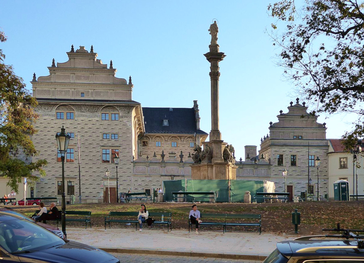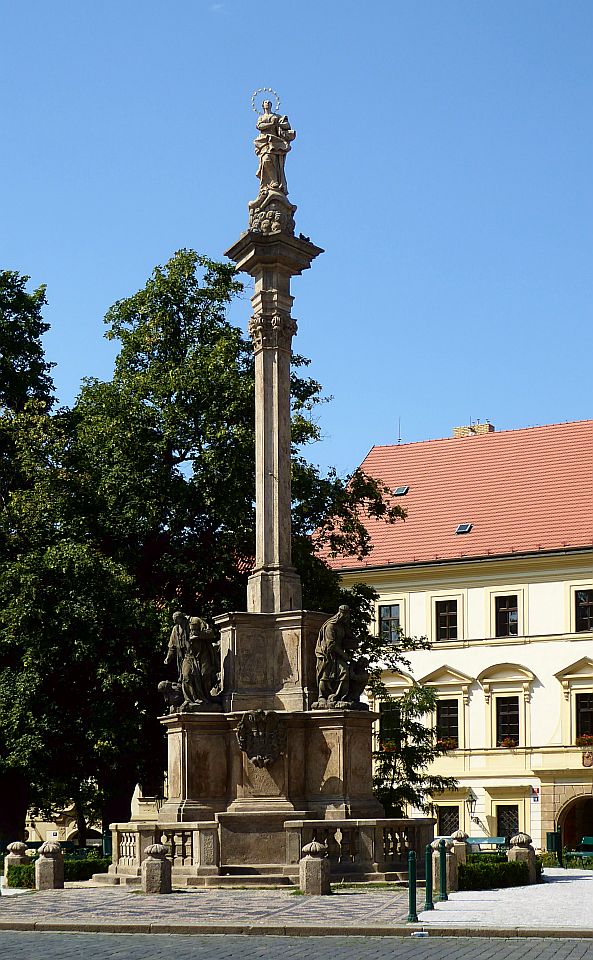 Mittig vor der Grünfläche steht eine historische Laternensäule und weiter dahinter die Marien-Pestsäule, am Platz an dem in den Jahren der großen Pest 1713-1714 kirchliche Messen unter freiem Himmel abgehalten wurden..
