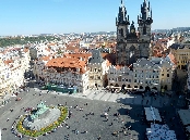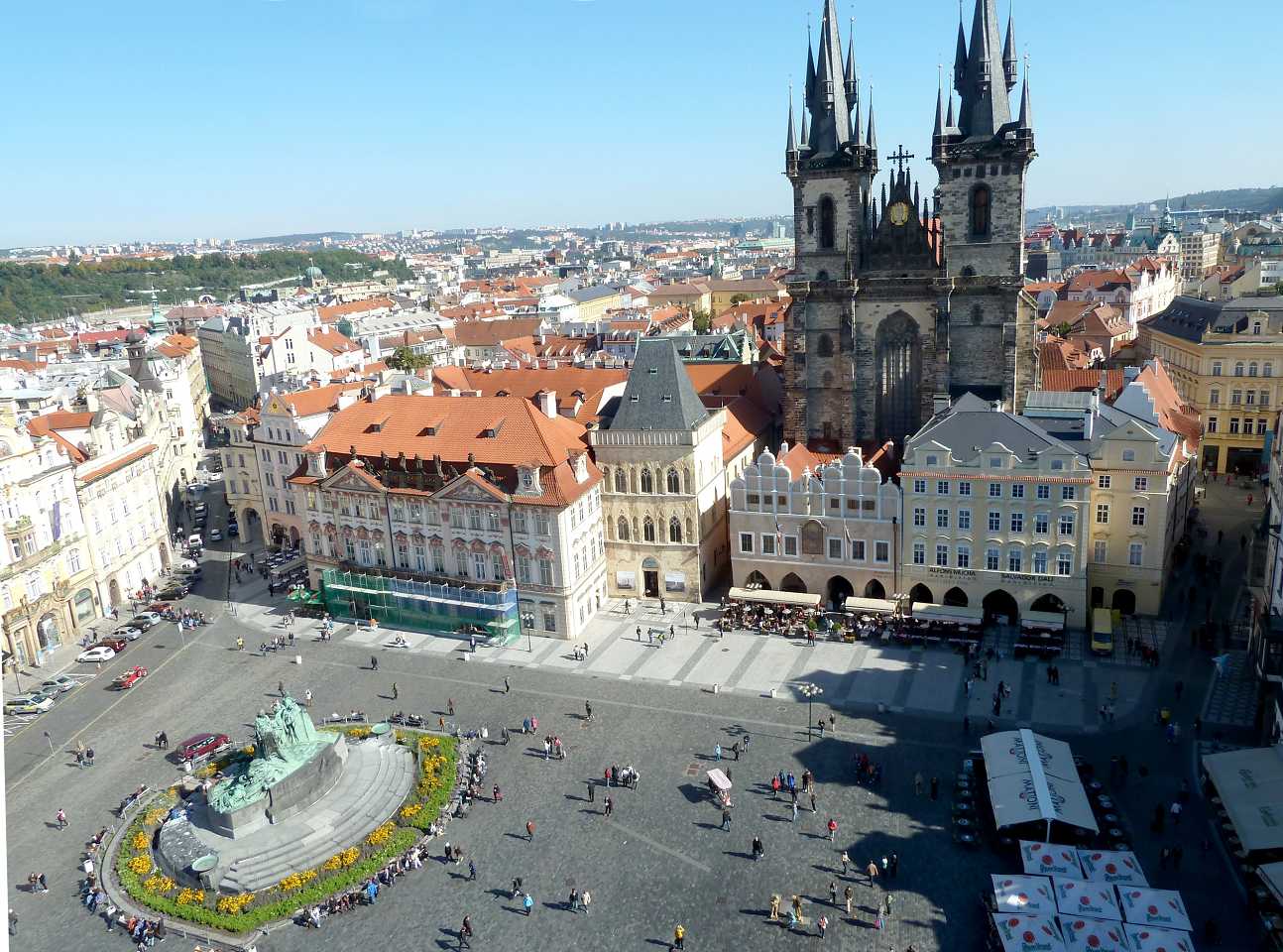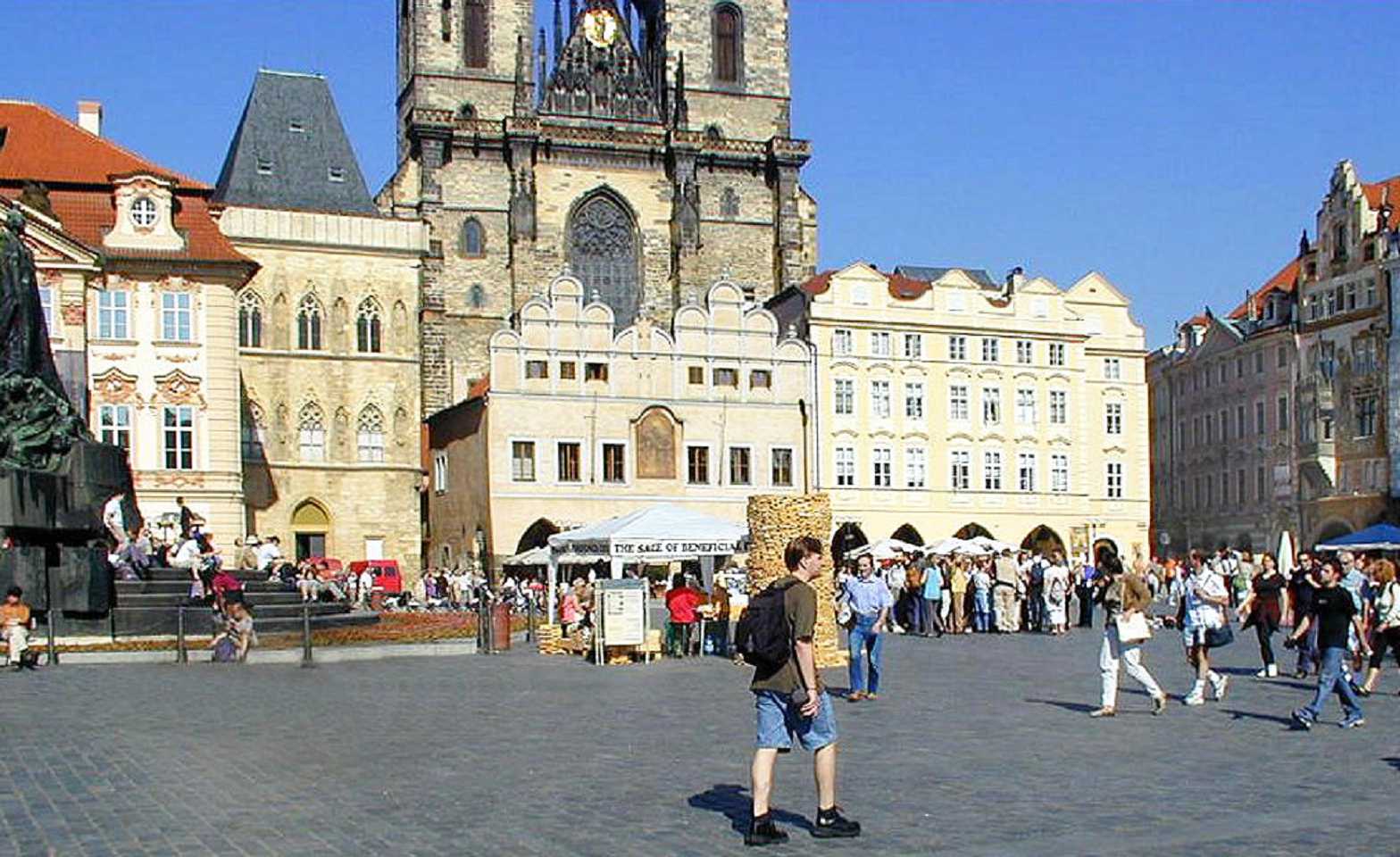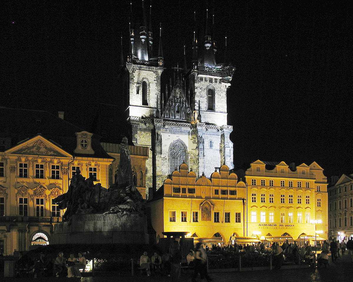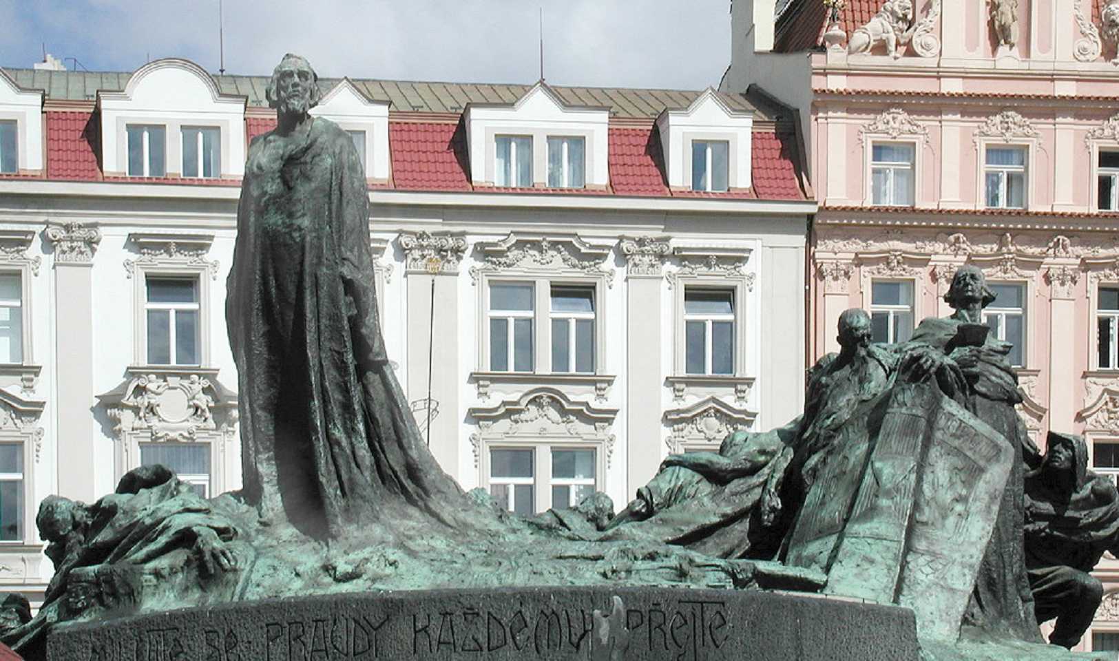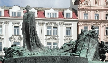In der Platzmitte steht das Hus-Denkmal. Der tschechische Reformator Mistr Jan Hus (*1369,+6.Juli 1415), vertrat die Lehre des englischen Reformators John Wyclif und übte Kritik am weltlichen Besitz der katholischen Kirche, wie über 100 Jahre später Martin Luther (*1483,+1546) auch. 1414 mußte sich Jan Hus dem Konstanzer Konzil stellen. Trotz der Zusicherung des freien Geleits durch den König Siegmund Luxemburger(Zikmund) wurde er, da er seine Lehre nicht widerrief, als Ketzer am Scheiterhaufen verbrannt. Das führte auch zu den Kriegen seiner Anhänger der Hussiten. Das gleiche Schicksal erlitt auch der frühere Schüler und Freund von Jan Hus Jeroným Pražský, der am 30. Mai 1416, also ein Jahr später ebenfalls am Scheiterhaufen leidvoll umkam.