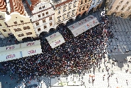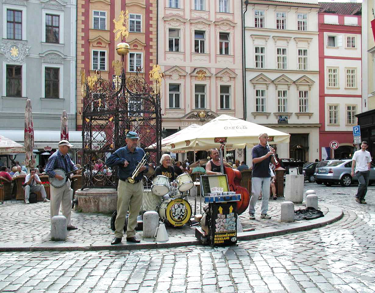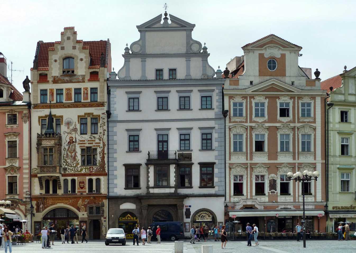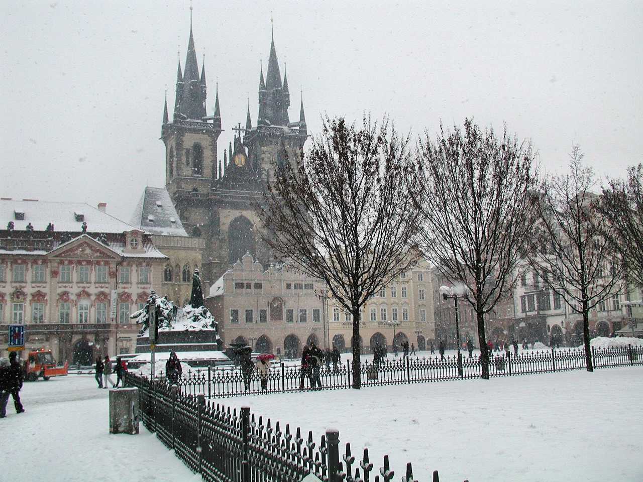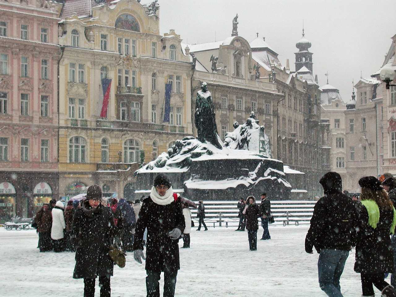 In der Platzmitte steht das Hus-Denkmal. Der tschechische Reformator Mistr Jan Hus (*1369,+6.Juli 1415), vertrat die Lehre des englischen Reformators John Wyclif und übte Kritik am weltlichen Besitz der katholischen Kirche, wie über 100 Jahre später Martin Luther (*1483,+1546) auch. 1414 mußte sich Jan Hus dem Konstanzer Konzil stellen. Trotz der Zusicherung des freien Geleits durch den König Siegmund Luxemburger(Zikmund) wurde er, da er seine Lehre nicht widerrief, als Ketzer am Scheiterhaufen verbrannt. Das führte auch zu den Kriegen seiner Anhänger der Hussiten. Das gleiche Schicksal erlitt auch der frühere Schüler und Freund von Jan Hus Jeroným Pražský, der am 30. Mai 1416, also ein Jahr später ebenfalls am Scheiterhaufen leidvoll umkam.