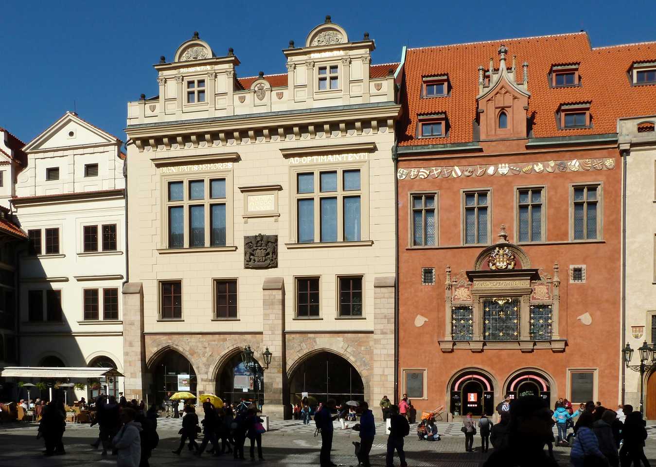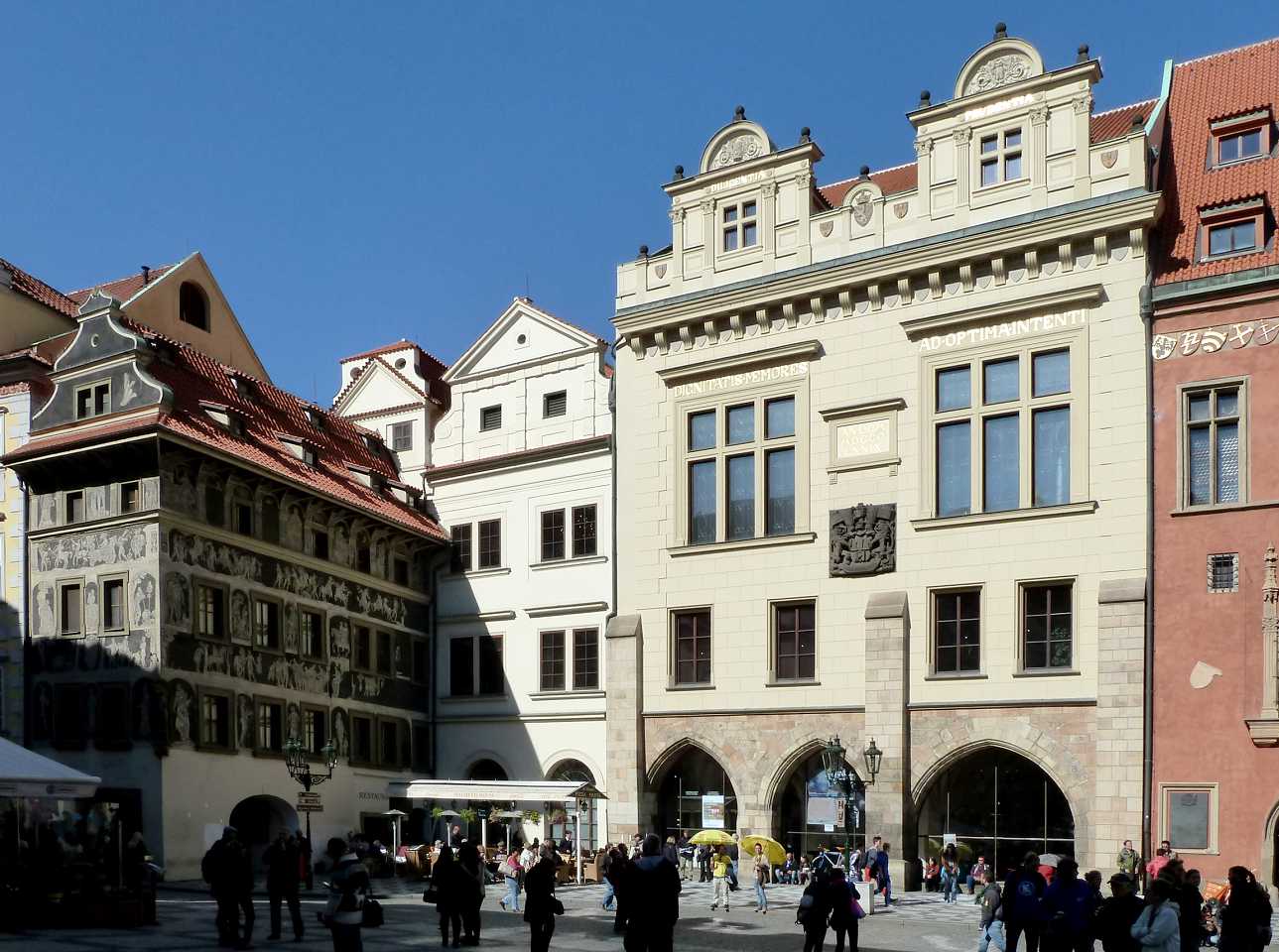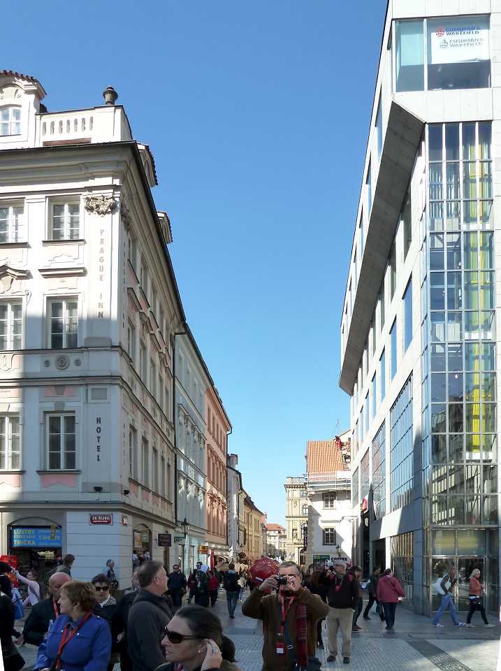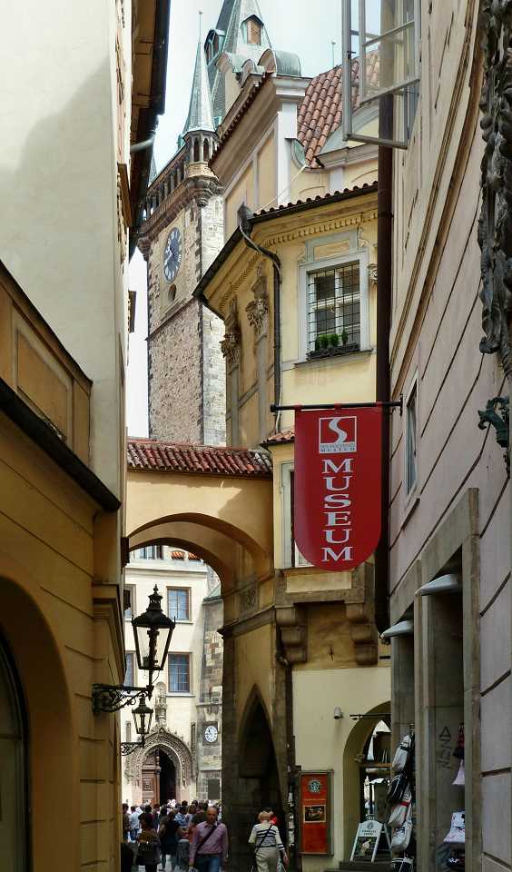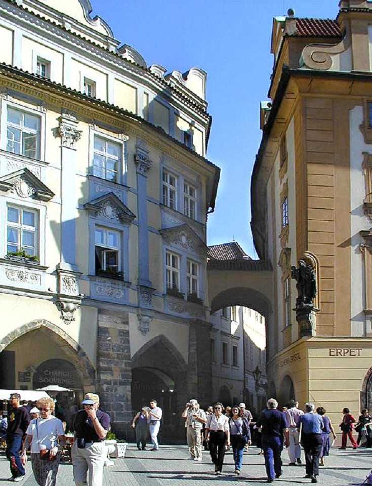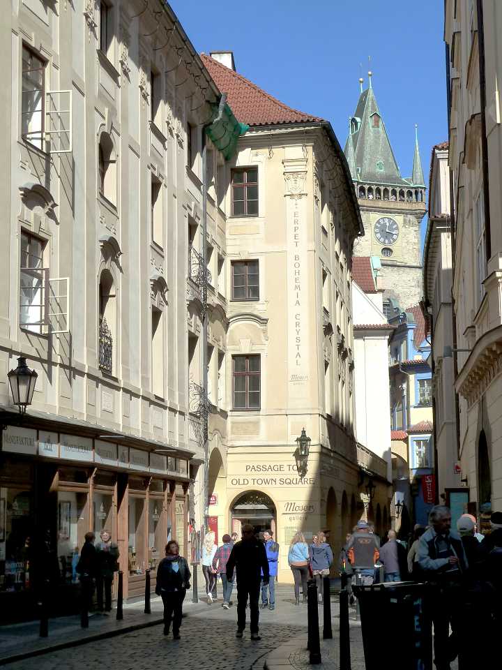Zum Platz kommen wir vom Wenzelsplatz durch die Straßen Na můstku und Melantrichova, die hier genau gegenüber dem Rathaus in den Platz mündet. Dieser Weg wird hier beschrieben.
