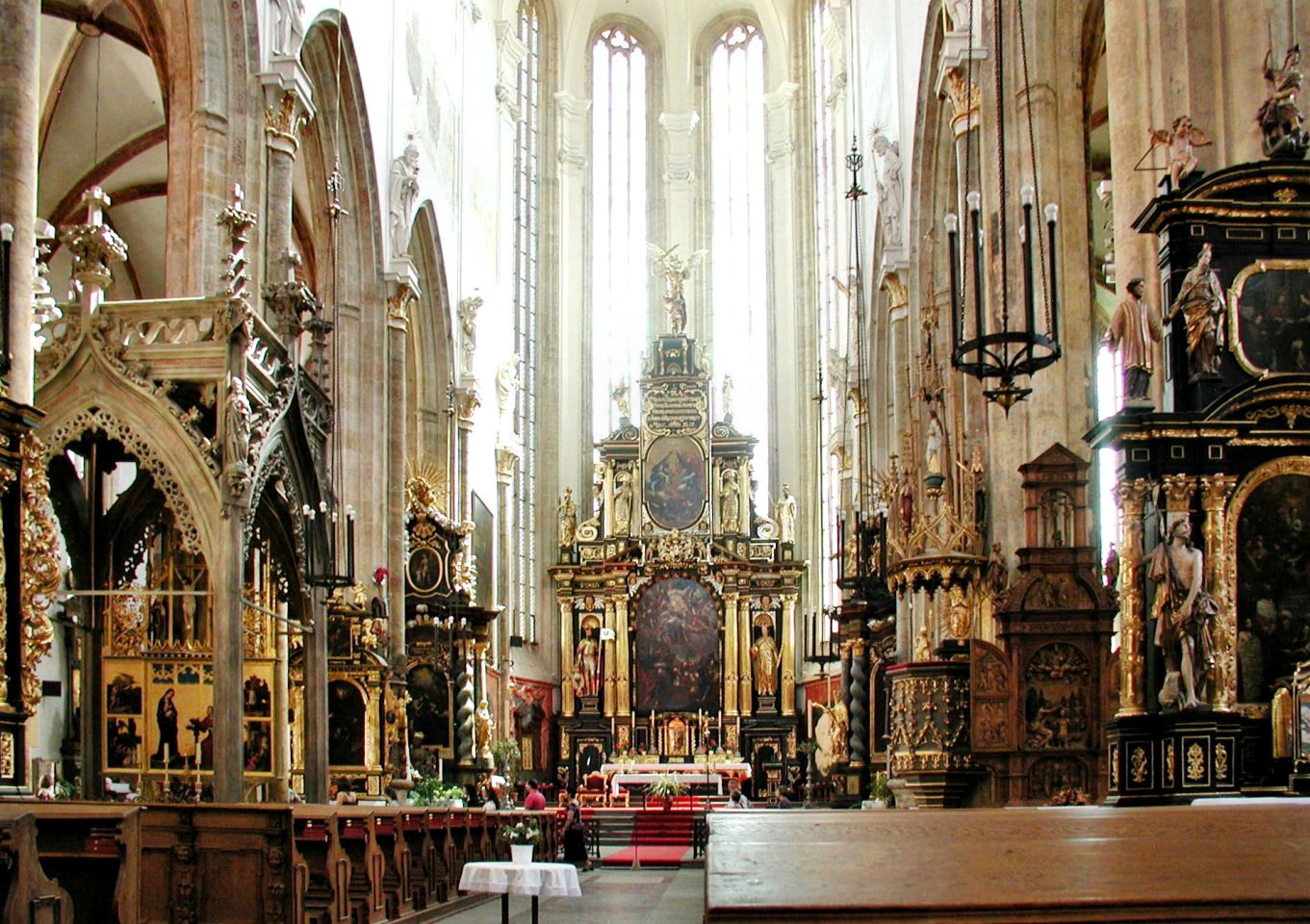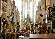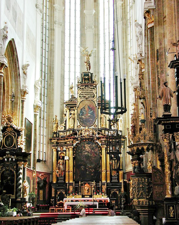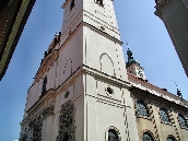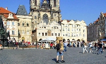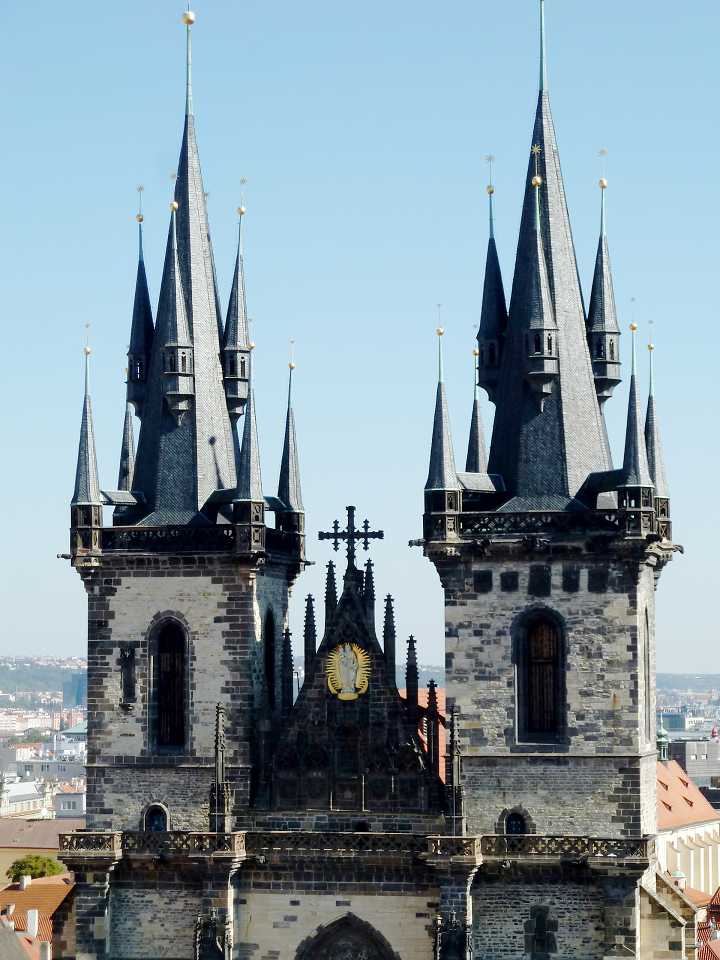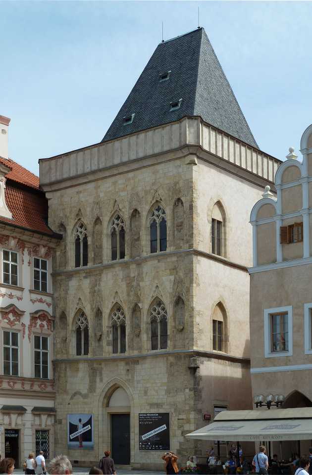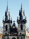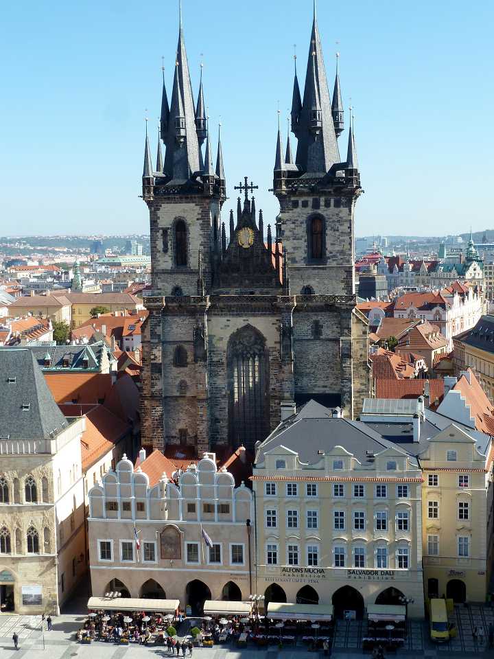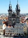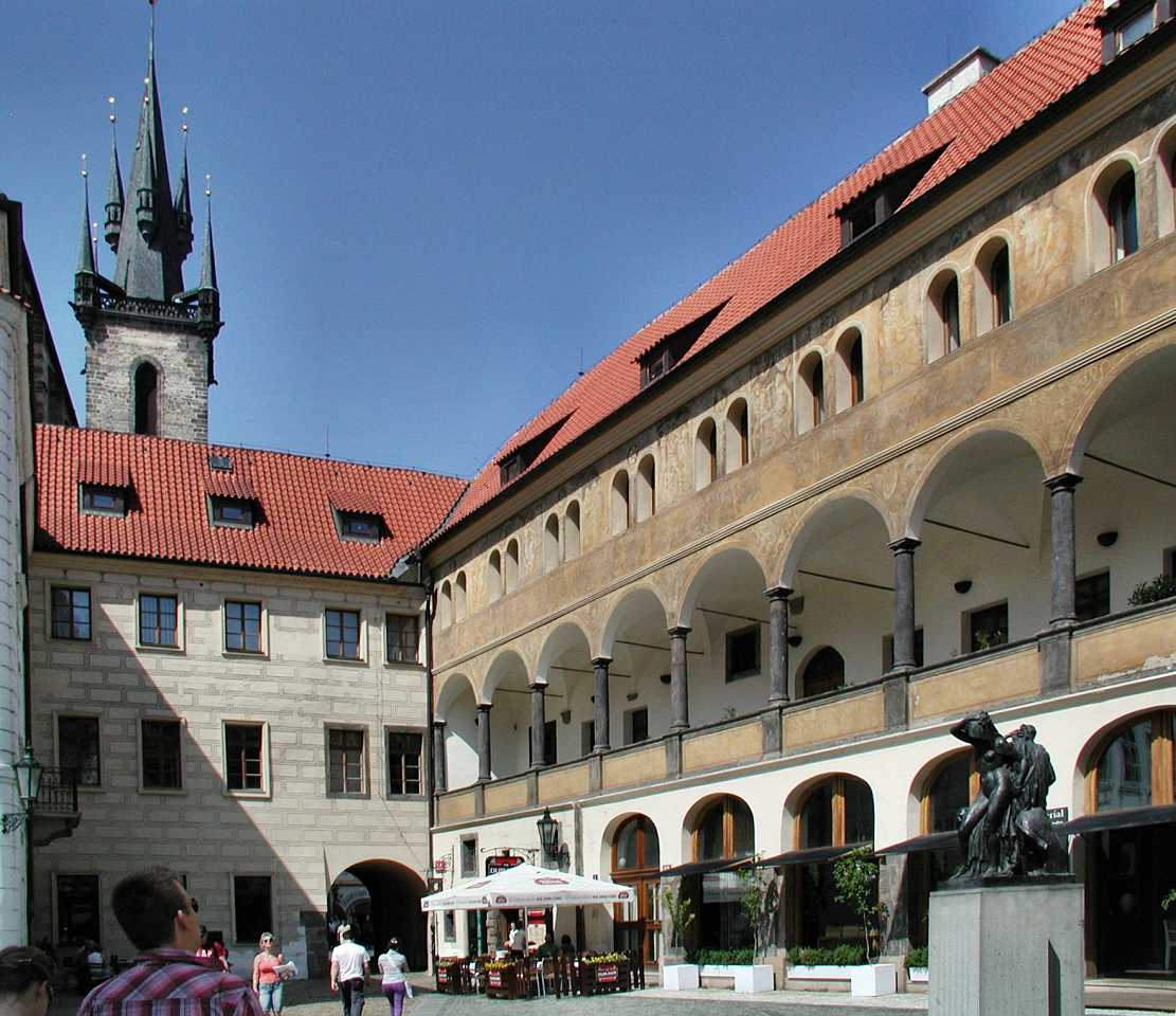 Majestätisch steht im Osten des Platzes die gotische Teyn-Kirche (Týnský chrám) - Kirche der Jungfrau Maria vor dem Teyn (Kostel Panny Marie přes Týnem) Mit dem Bau wurde 1365 begonnen, die 2 Türme (80m hoch) jedoch erst Anfang des 16.Jh. fertiggestellt. Um die Kirche linksherum kommt man zu einem Durchgang der zu einem Hof führt - Týn, auch Ungelt genannt. Es handelte sich um einen Handelshof, in dem sich alle fremden Händler versammeln und Zoll entrichten mußten - daher auch der altdeutsche Name Ungelt. Im früheren Mittelalter war der Hof befestigt und mit einem Graben umgeben. Durch den hinteren Ausgang geht es in die Jakubská zu der Kirche des hl. Jakub und durch die Štupartská könnte man bis zum Kaufhaus Kotva am Platz der Republik weiter gehen.