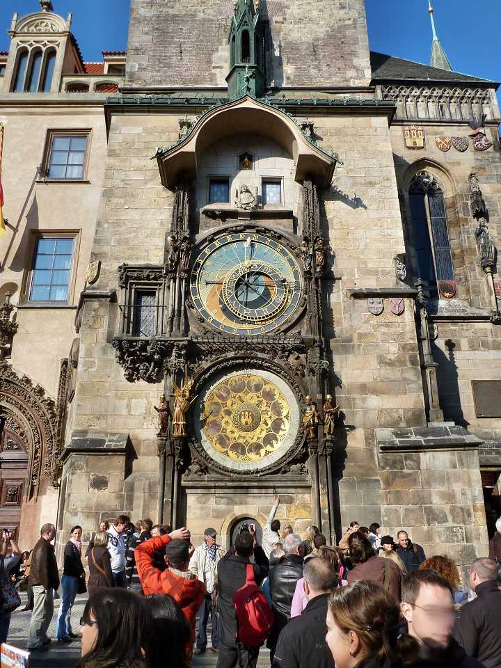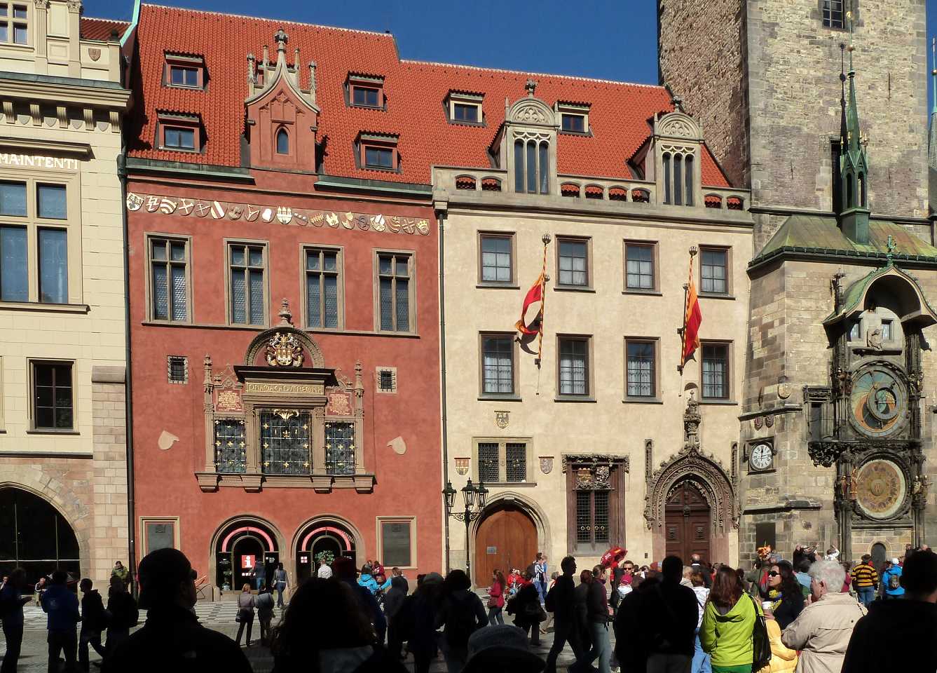 Der größte Anziehungspunkt ist das Altstädter Rathaus mit einem Turm in dem sich die weltberühmte astronomische Uhr (Orloj) mit den Aposteln, die stündlich an zwei kleinen Fensterchen vorbeilaufen, befindet. Sie stammt aus dem Jahr 1410. 1364 begannen die Bauarbeiten am Rathaus, die vom König Jan Luxemburger der Altstadt genehmigt wurden. Ca. 1384 wurde im Turm die gotische Rathauskapelle von der Bauhütte Petr Parléř (Peter Parler) eingerichtet. Rechts am Turm steht nur noch ein Torso des wärend des 2. Weltkrieges stark beschädigten neugotischen Flügels des Rathauses, am dessen Platz jetzt eine kleine Grünfläche angelegt ist.
