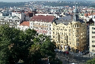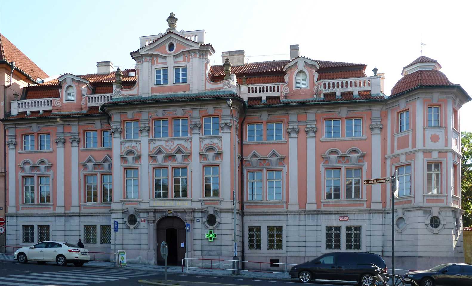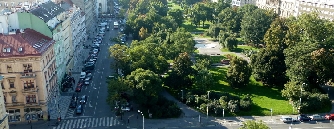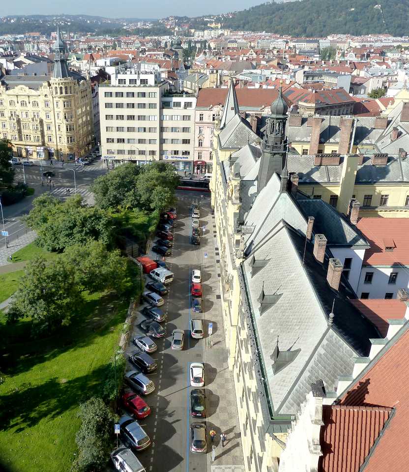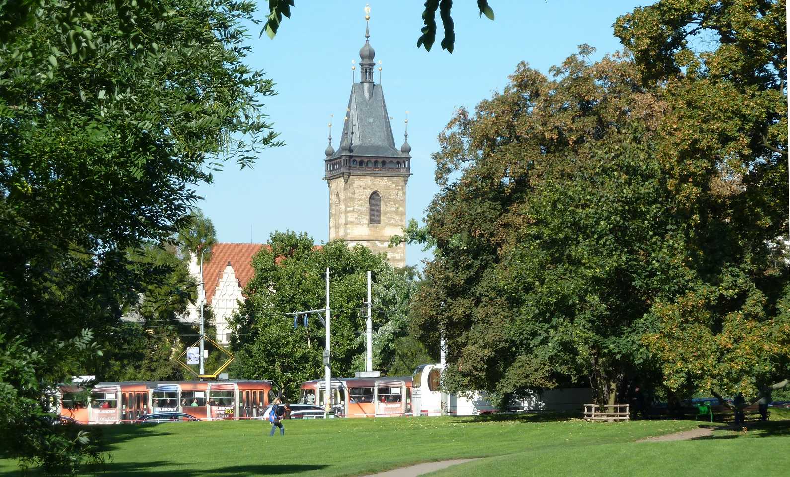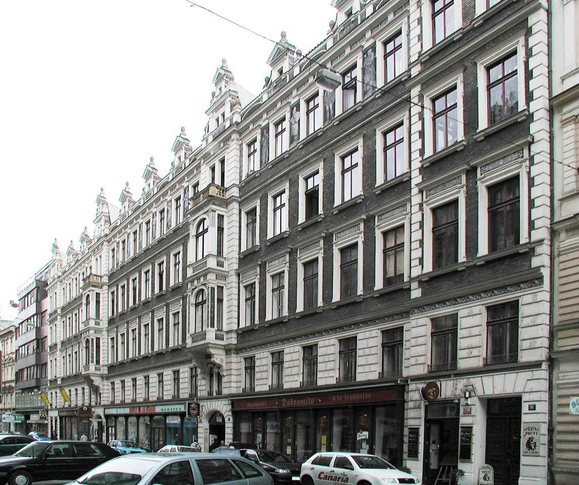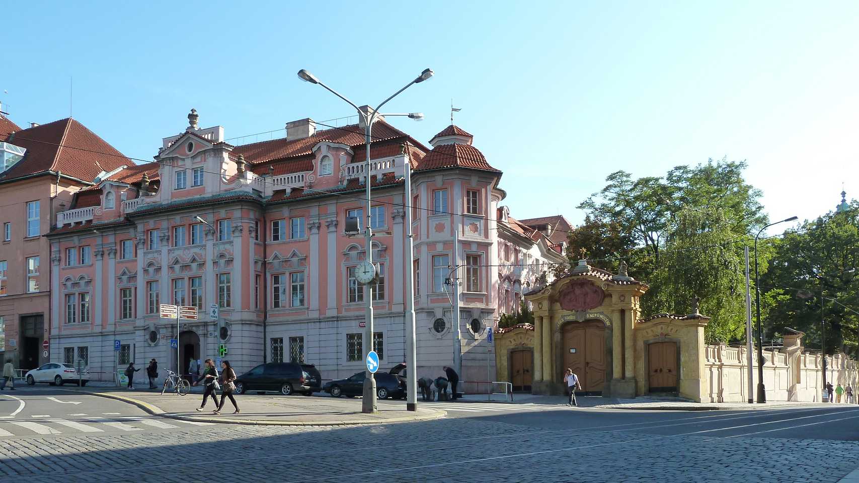 Die Ječná kommt vom Platz des Friedens - Náměstí Míru im Stadteil Vinohrady und führt zur Moldau und der Jirásek-Brücke. Dort an der Ecke des Jirásek-Platzes steht Das Tanzende Haus - Tančící dům.