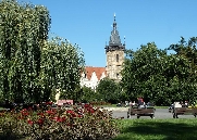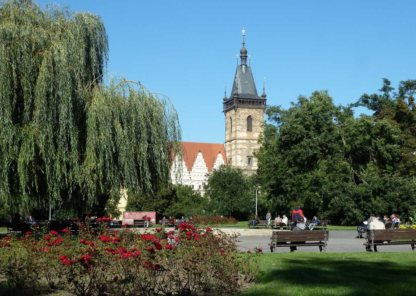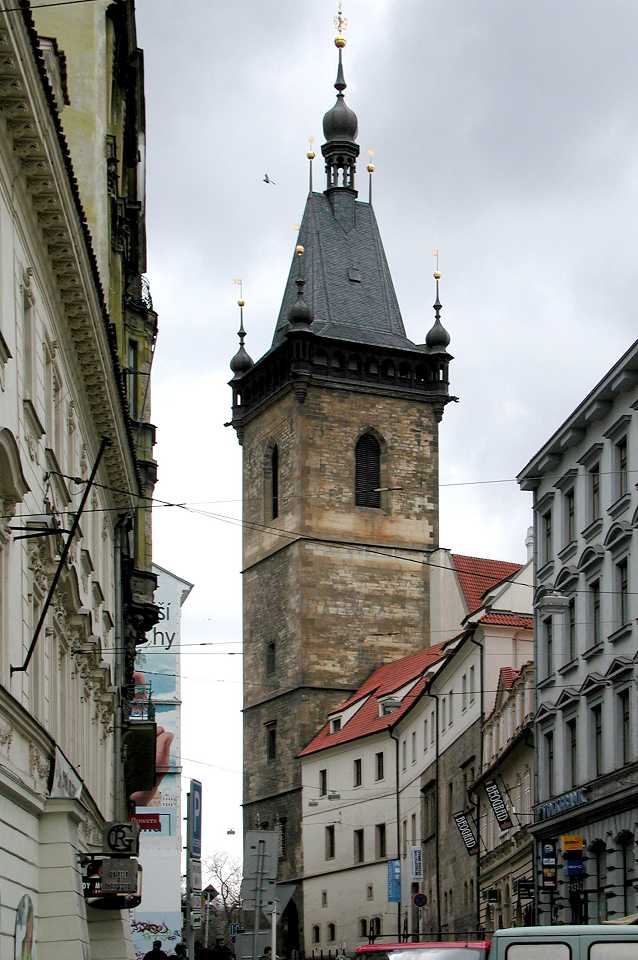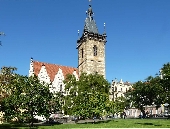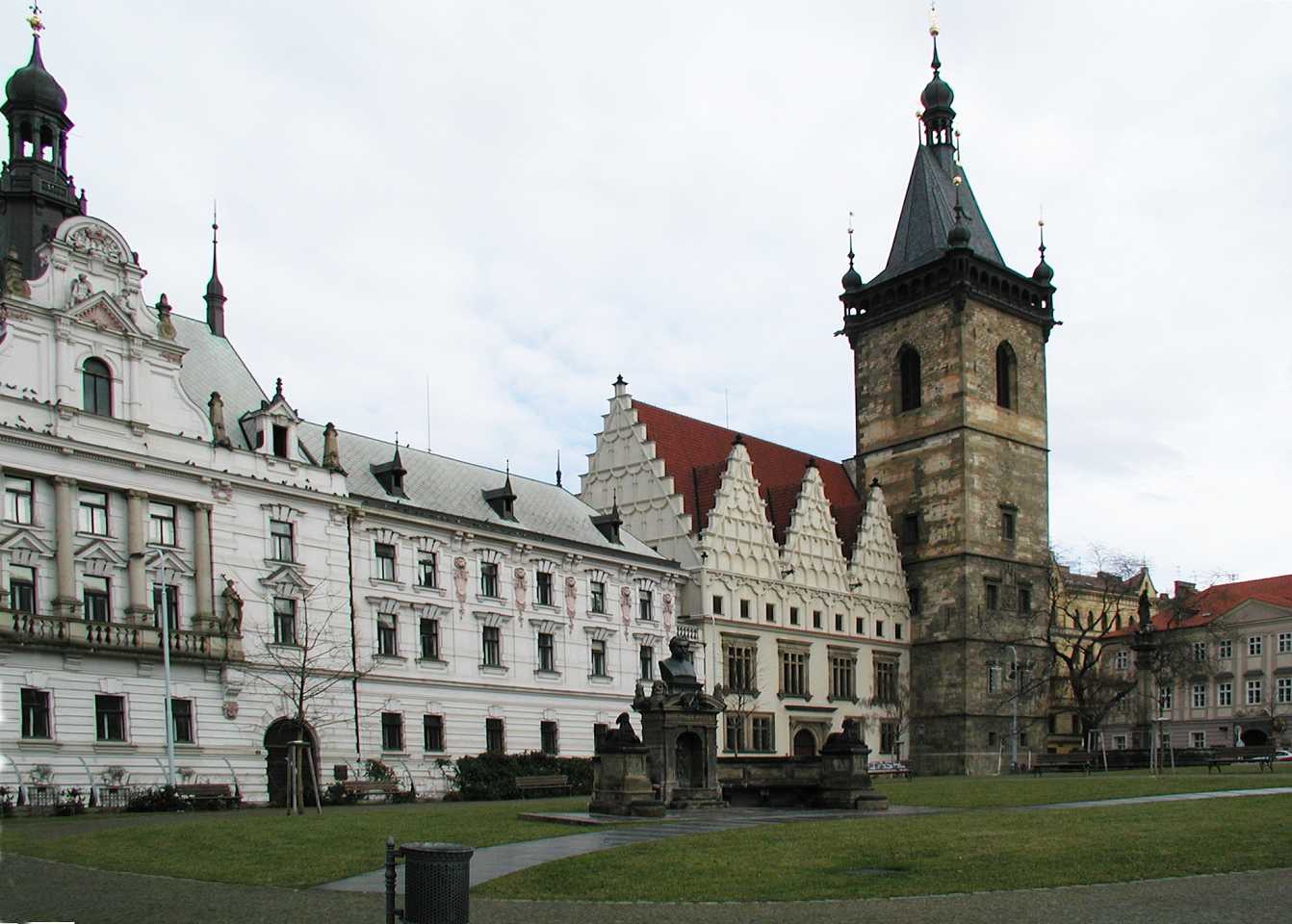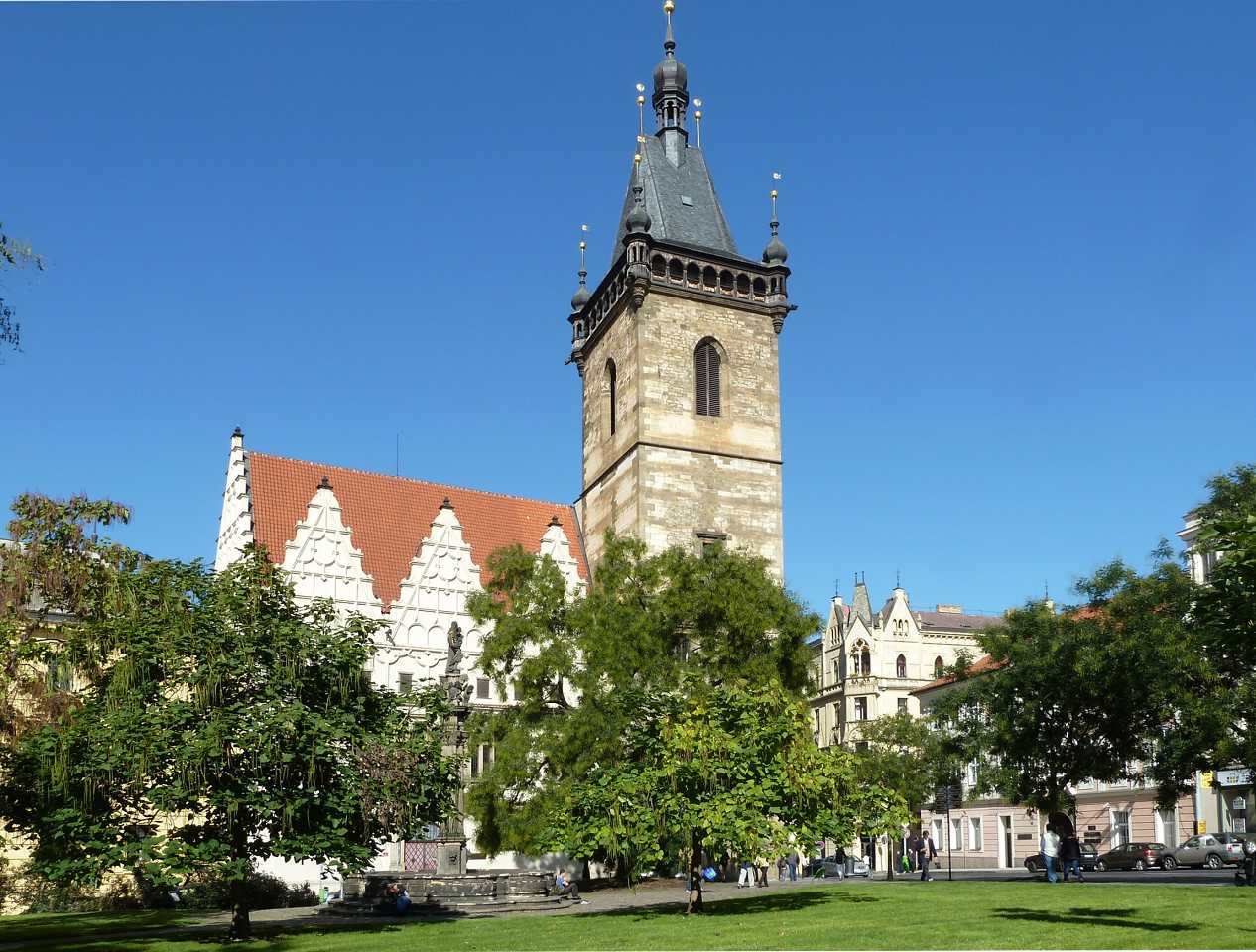 Den nördlichen Abschluß des Platzes bildet das Neustädter Rathaus - Novoměstská Radnice, das mit seinem Flügel in die Vodičkova 1377-98 entstand und der Flügel mit der Front zum Viehmarkt 1411 erbaut wurde. Der 70m hohe Turm wurde 1452-56 errichtet.