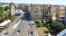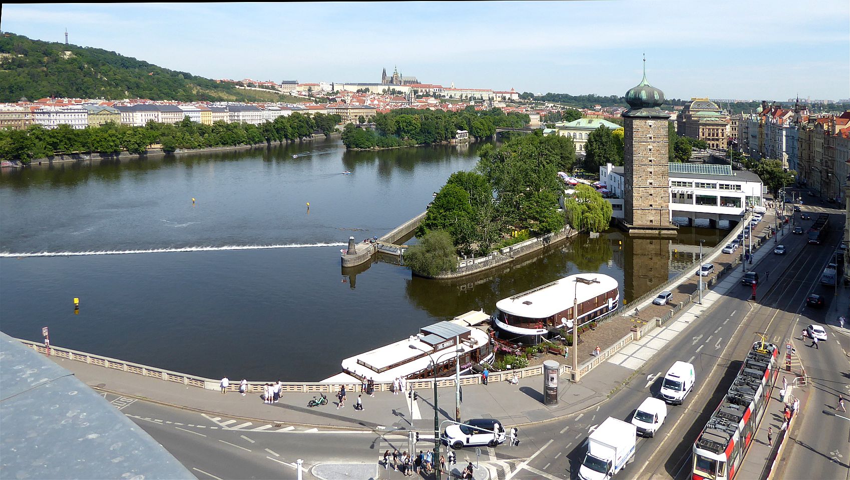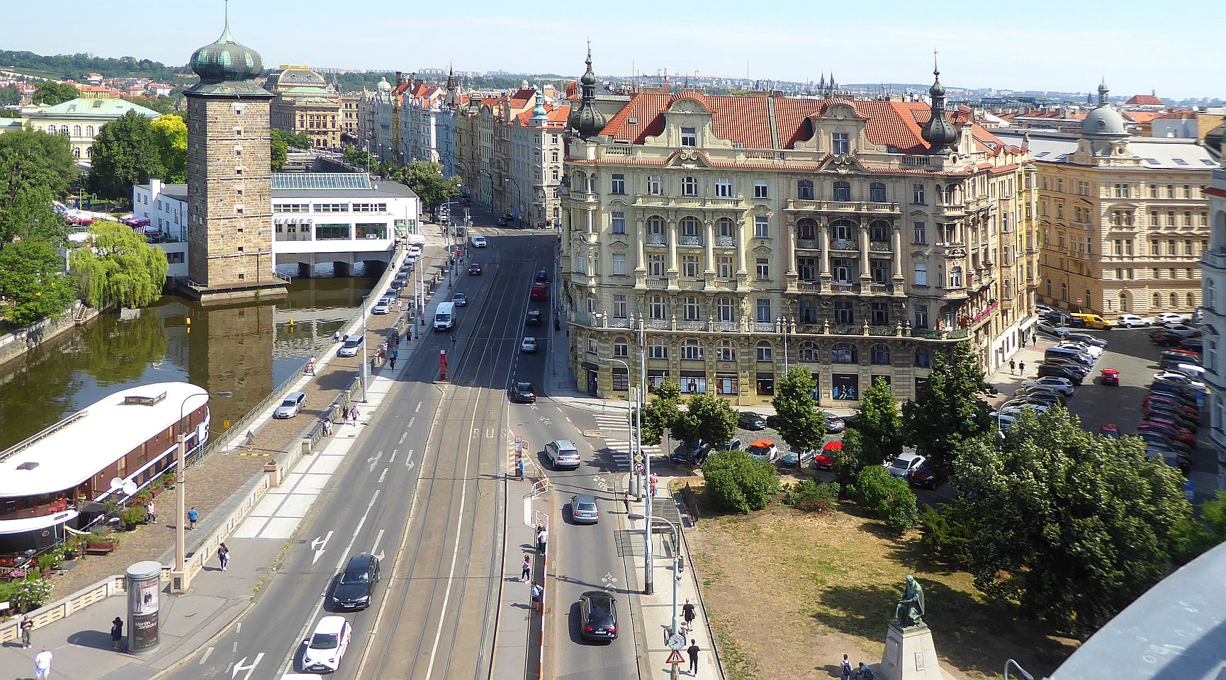 Man kann vom Stadtviertel Vinohrady (köngl. Weinberge) vom Platz des Friedens (náměstí Míru) durch die Ječná ul. über den Karlsplatz (Karlovo nám.) durch die Resslova ul. und Jirásek-Platz, am Tanzenden Haus vorbei über die Moldau zu der Ausfallstraße nach Pilsen (Plzeňská ul.) fahren.