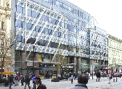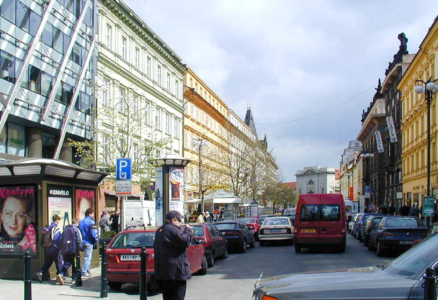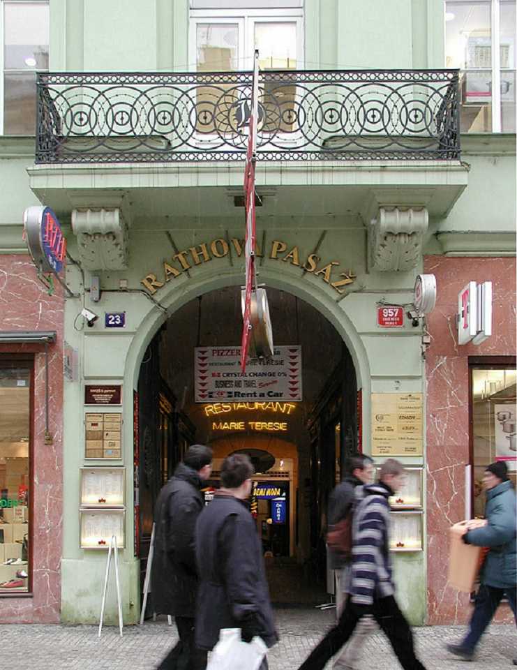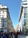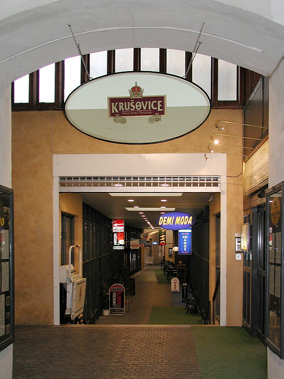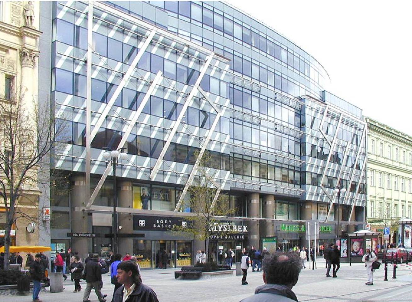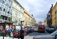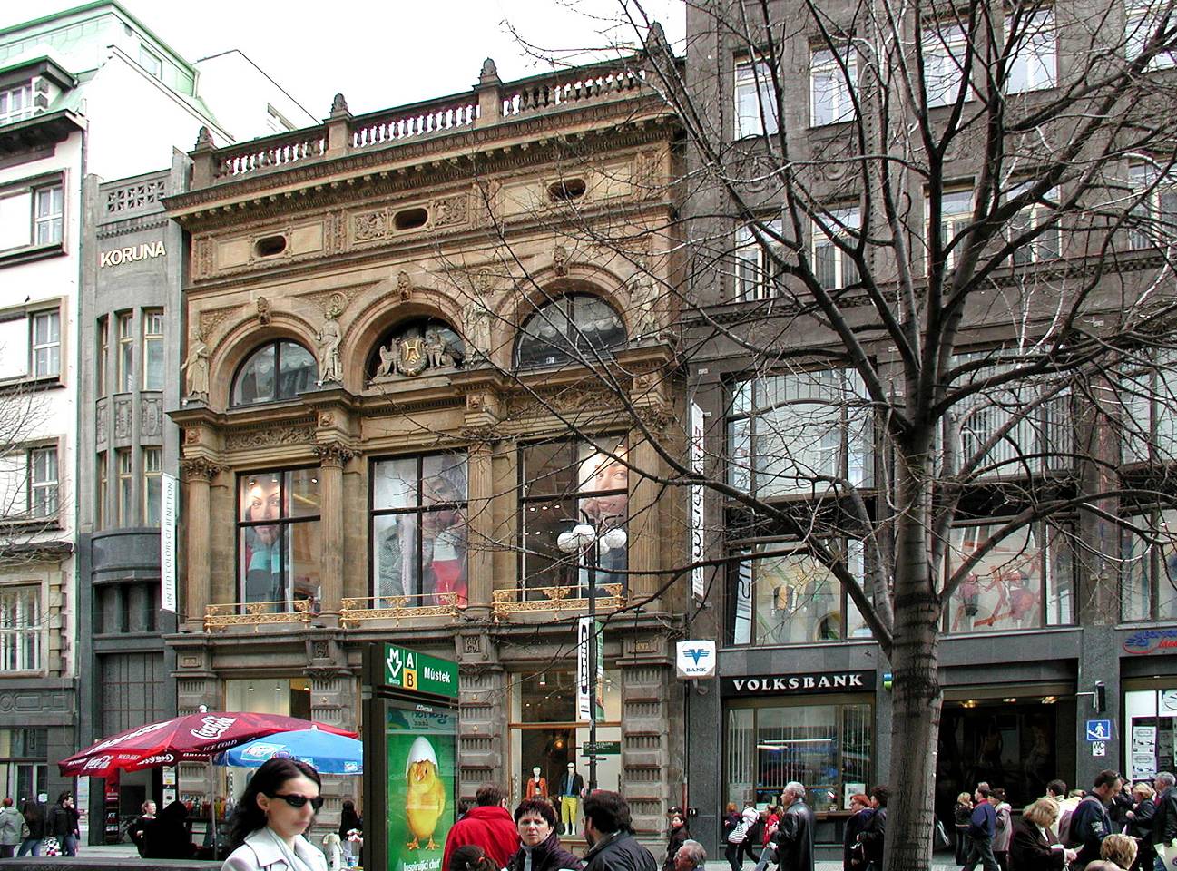 --> Die Straße, die hier nach rechts zum Platz der Republik abbiegt, trägt sinnigerweise den Namen Am Graben - Na Příkopě. Sie bildet die Grenze zwischen Altstadt und Neustadt. Es handelt sich um die Fortsetzung der Fußgängerzone des unteren Wenzelplatzes in Richtung zum Platz der Republik und Pulverturm. Hier münden die Palastpassagen von der unteren rechten Wenzelsplatz-Seite ein. Im weiteren Verlauf stehen hier historische Gebäude, die im Wandel der Zeit u.a. auch zu Einkaufszentren geworden sind. Die Straße Na Příkopě ist die Einkaufs- und Amüsiermeile im Zentrum der Stadt.Hier beginnt unser Neustadt-Spaziergang - Am Graben, Platz der Republik, Masaryk-Bahnhof.