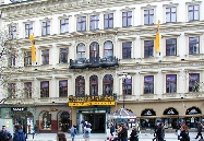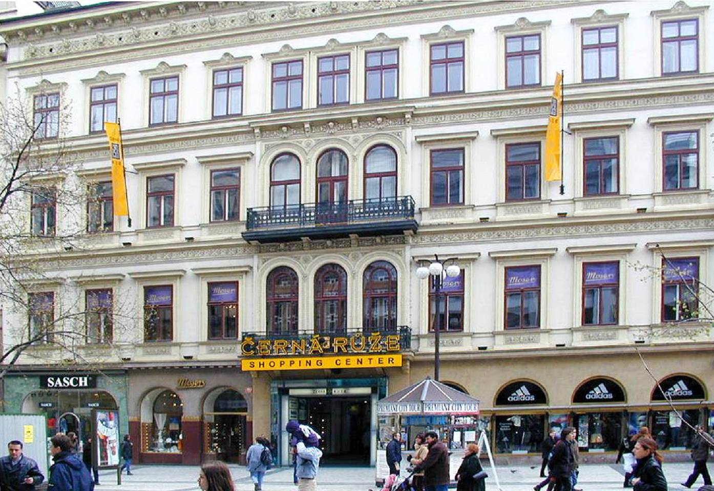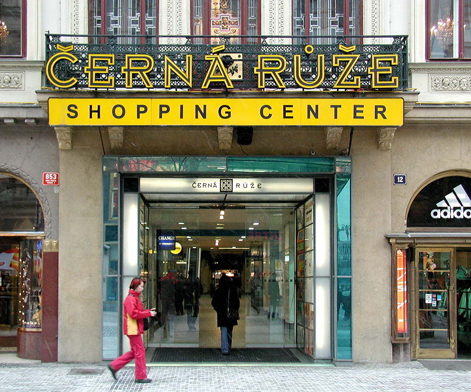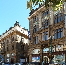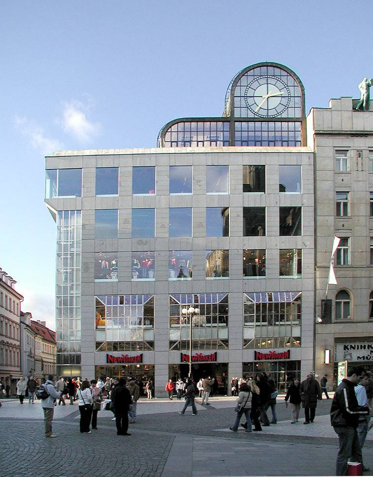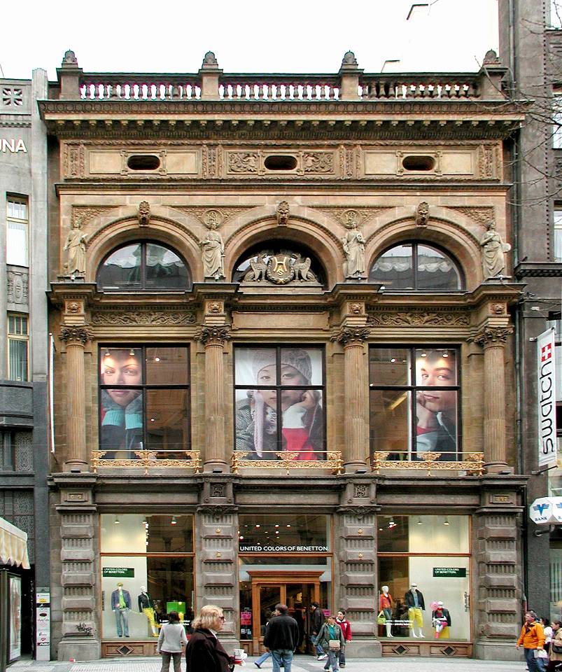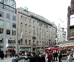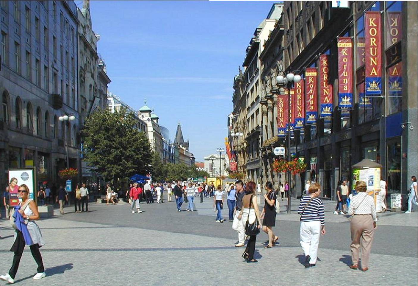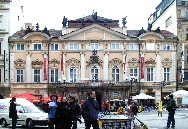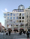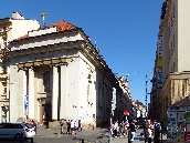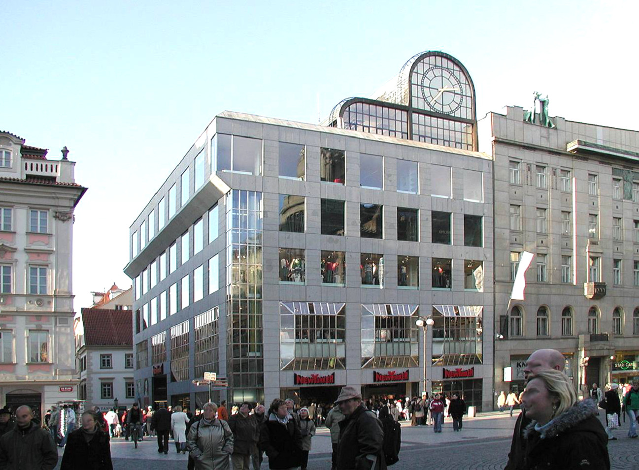 --> Die Straße, die hier nach rechts zum Platz der Republik abbiegt, trägt sinnigerweise den Namen Am Graben - Na Příkopě. Sie bildet die Grenze zwischen Altstadt und Neustadt. Es handelt sich um die Fortsetzung der Fußgängerzone des unteren Wenzelplatzes in Richtung zum Platz der Republik und Pulverturm. Hier münden die Palastpassagen von der unteren rechten Wenzelsplatz-Seite ein. Im weiteren Verlauf stehen hier historische Gebäude, die im Wandel der Zeit u.a. auch zu Einkaufszentren geworden sind. Die Straße Na Příkopě ist die Einkaufs- und Amüsiermeile im Zentrum der Stadt.Hier beginnt unser Neustadt-Spaziergang - Am Graben, Platz der Republik, Masaryk-Bahnhof.