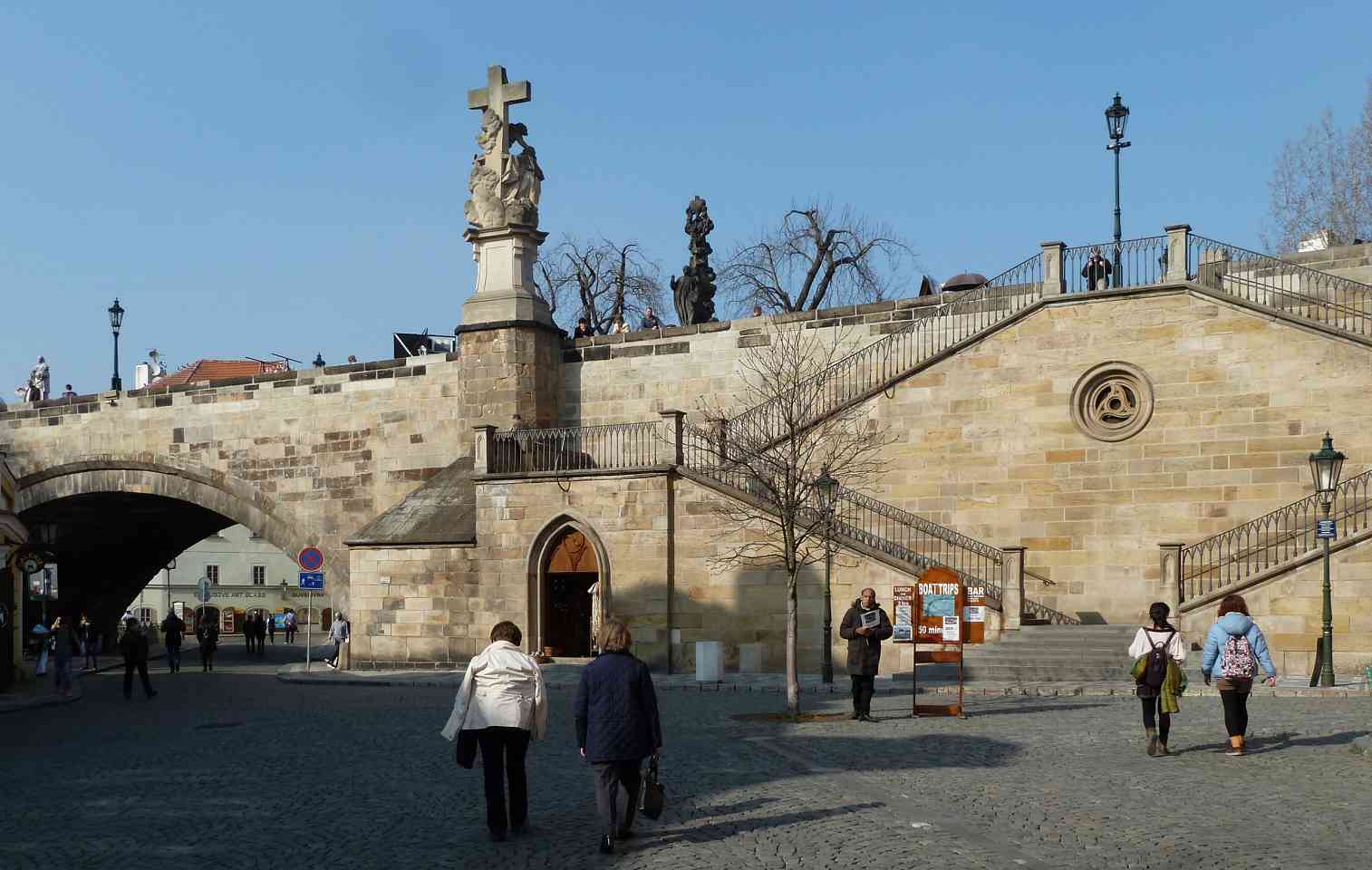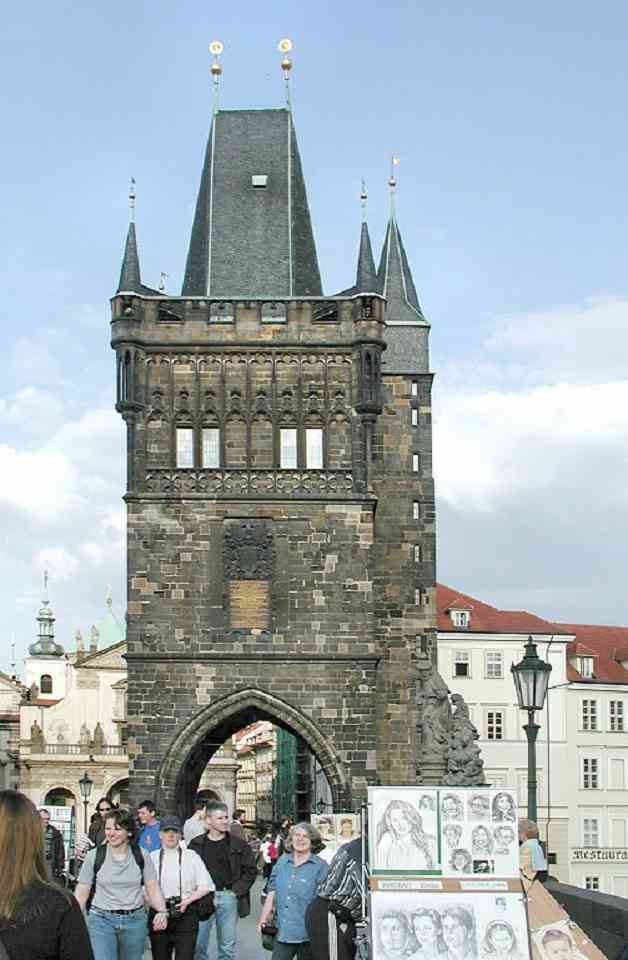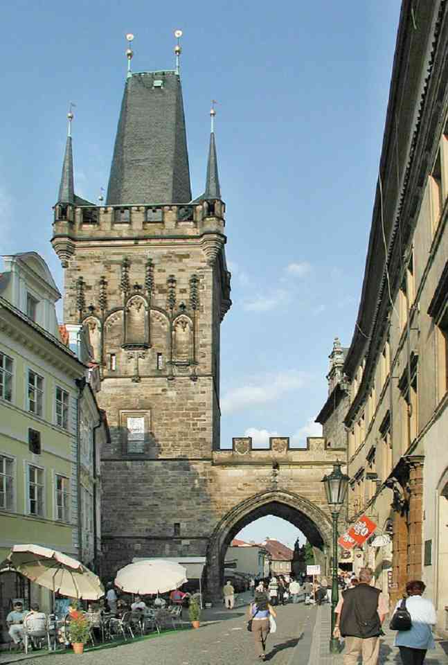 Auf der Altstädter-Seite wird die Brücke von einem spätgotischen Turm, ebenfalls aus der Peter Parler-Hütte, abgeschlossen. Die Altstädter Seite des Turms zieren viele Bildhauer-Arbeiten. Die auf der brückenzugewandten Seite des Turms wurden bei der Belagerung Prags 1648 durch die Schweden zerstört. 1420 zogen über die Brücke auch die Hussiten gegen die Kleinseite. Die letzten Kämpfe fanden hier 1848 statt.