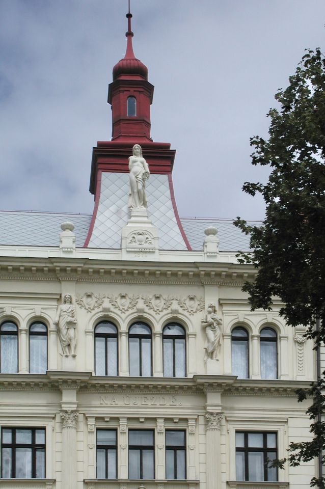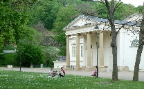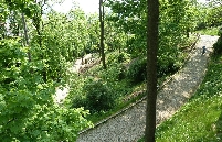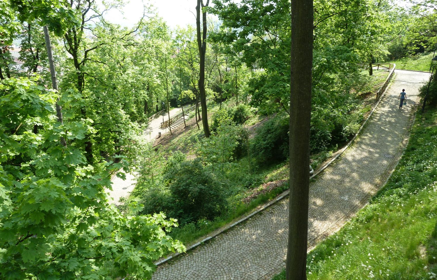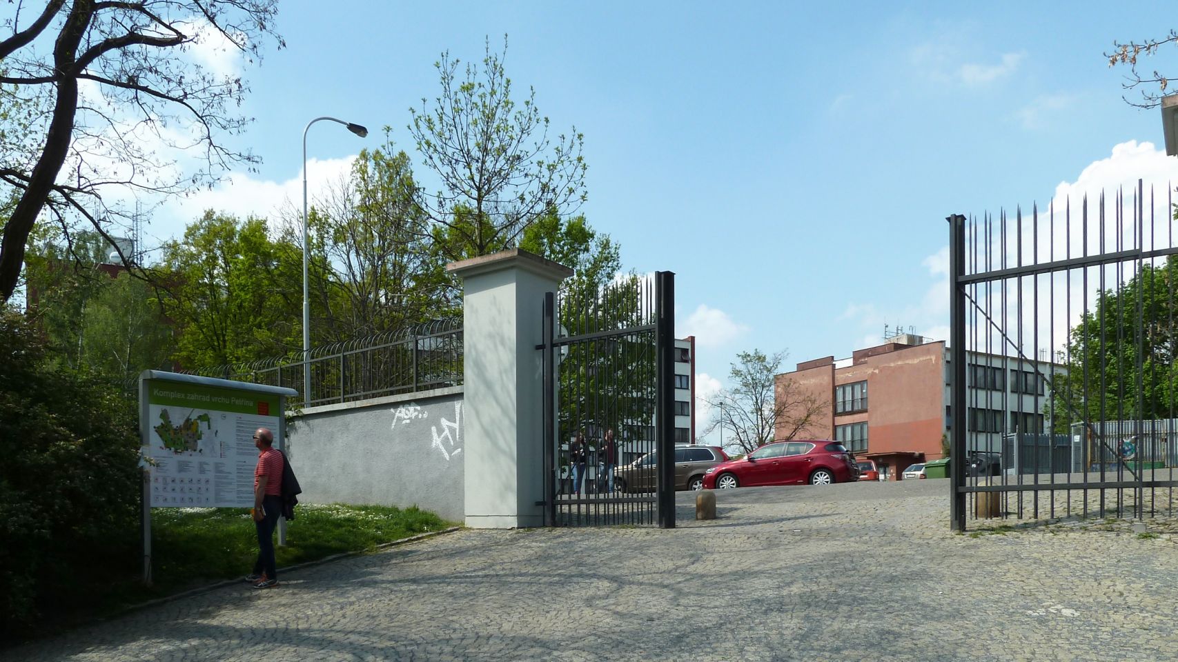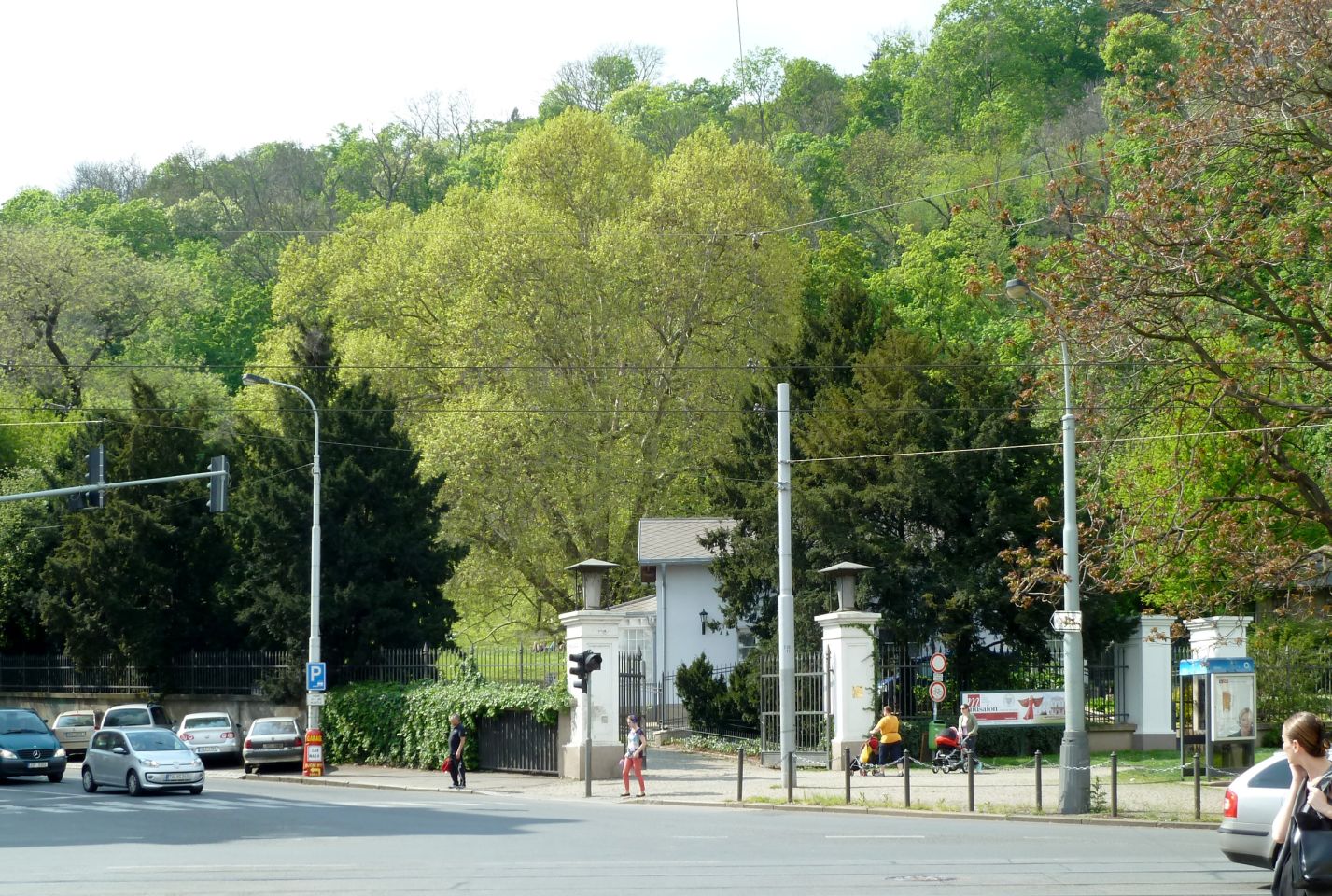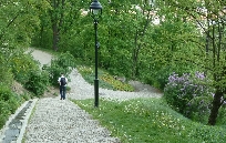 Dann den Petřín-Hügel hoch fahren - hier galt früher der Umsteige-Fahrschein der Straßenbahn, jetzt leider nicht mehr. Oben angelangt, geht es rechts zum Aussichtsturm und links zum Rosengarten und an dem Planetarium vorbei in die Straße Šermířská, wo sich gleich links der Eingang zum Kinsky-Garten befindet. Von hier aus gehen wir bequem den Hang herunter.