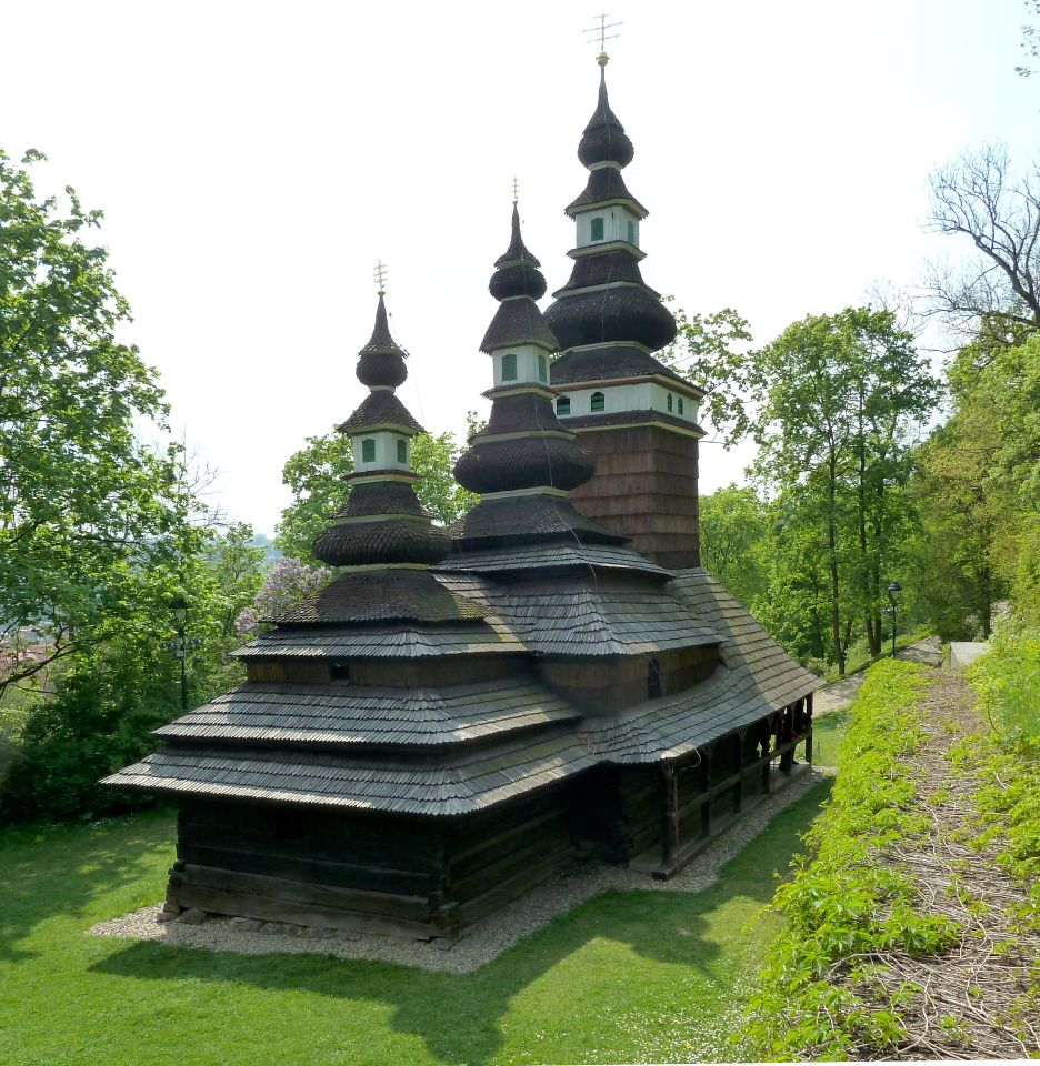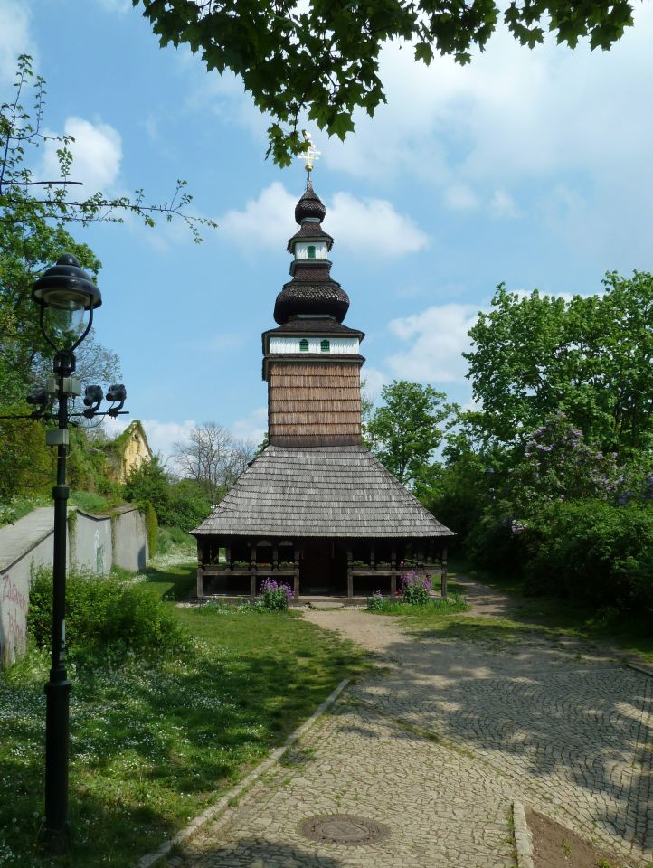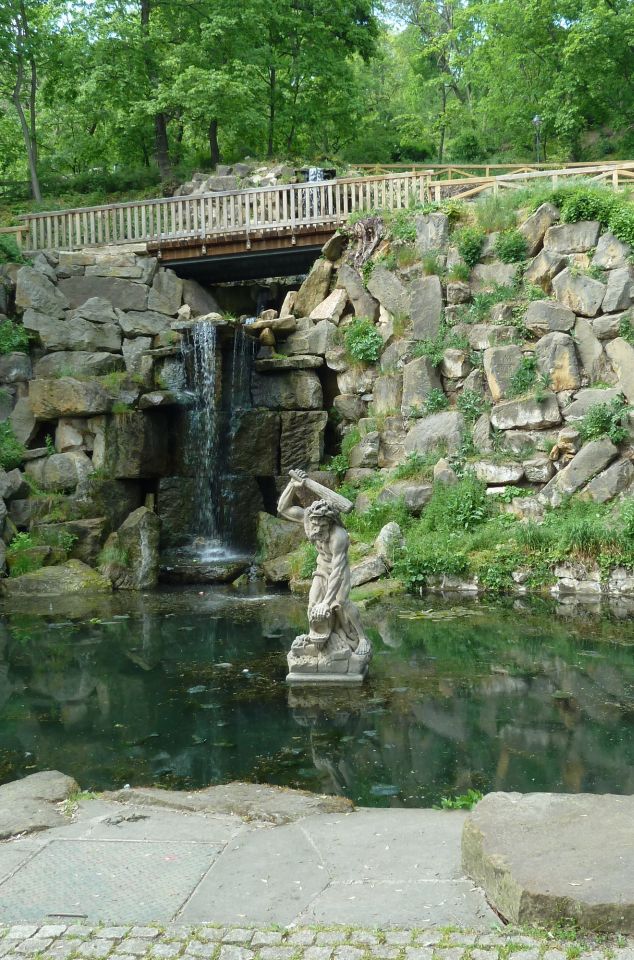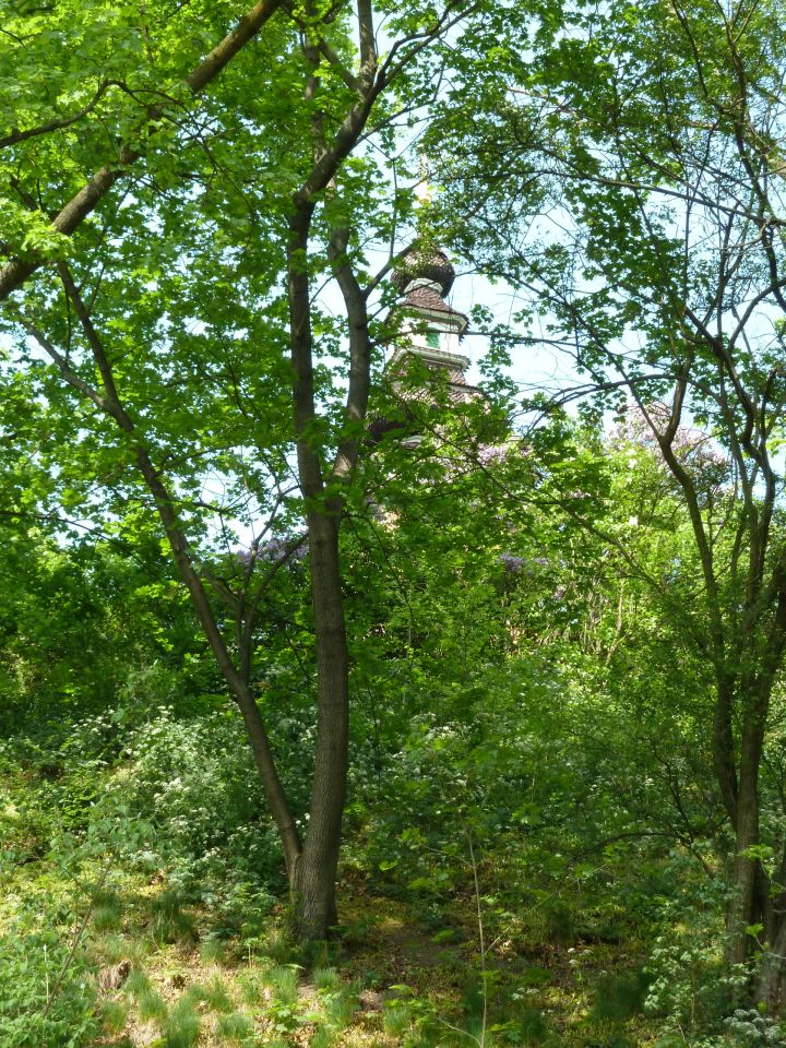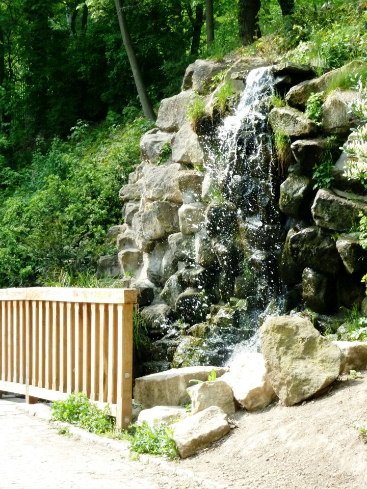 Auf dem Weg den Hang herunter kommen wir an einer Ruine eines früheren Ausflufsrestaurants und eines kleinen Anwesens, sowie an einer Holzkirche des hl. Michael vorbei, die 1927 aus der Karpatenukraine, die damals noch zur Tschechoslowakei gehörte, hierher übersiedelt wurde. Leider wurde die Holzkirche im Oktober 2020 Opfer der Flammen. Prager Magistrat plant eine Rekonstruktion. Weiter geht es vorbei, an kleinen Seen mit Wasserfall, an einem Neptunbrunnen und ganz unten zum Sommerschlößchen der Kinskys.