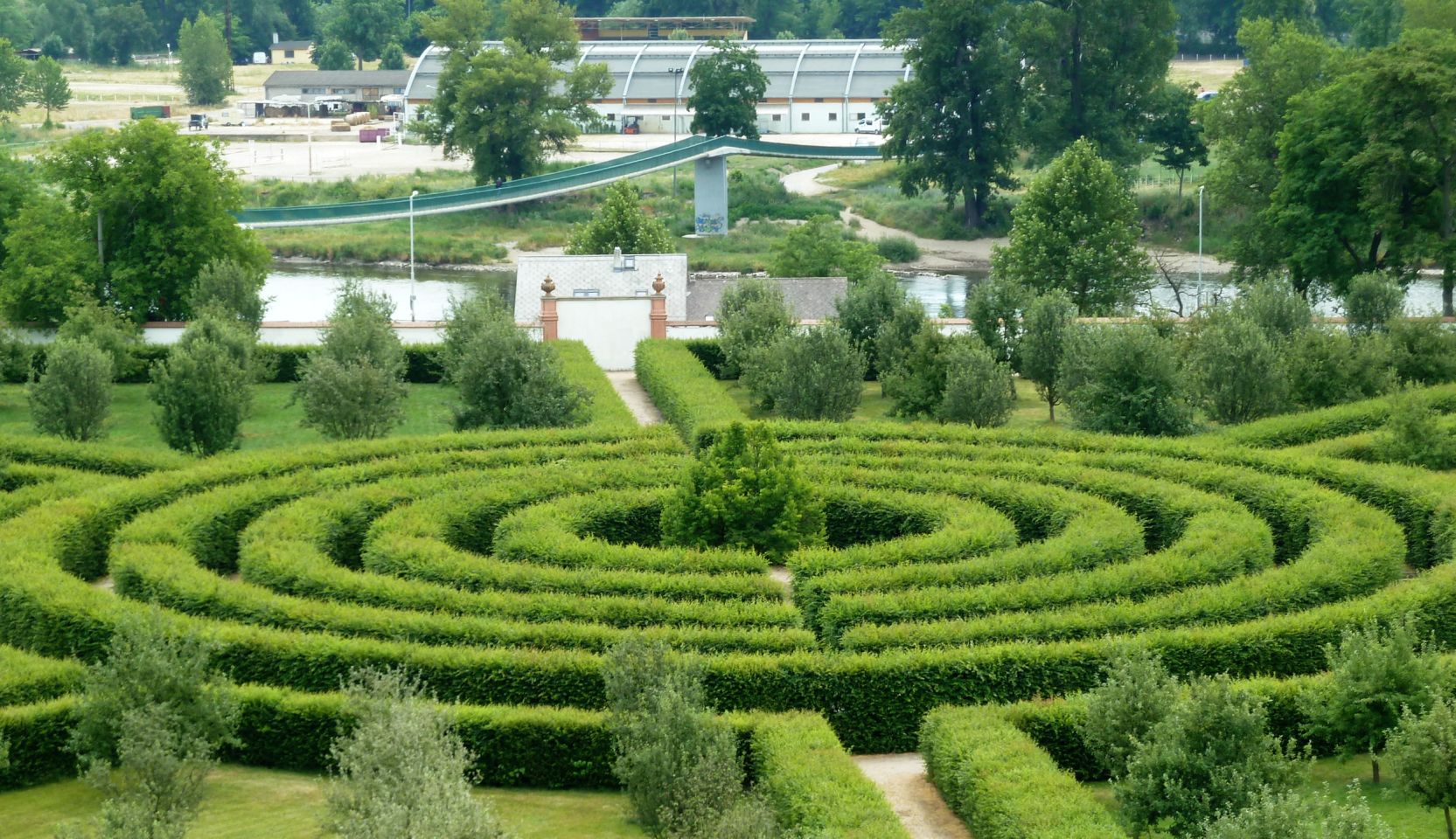 Der Schloßgarten gliedert sich in zwei Bereiche, in den großen Garten hinter und bederseits des Schloßes und dem daneben liegenden Bereich mit einem Obstgarten und einem Natur-Labyrinth.
