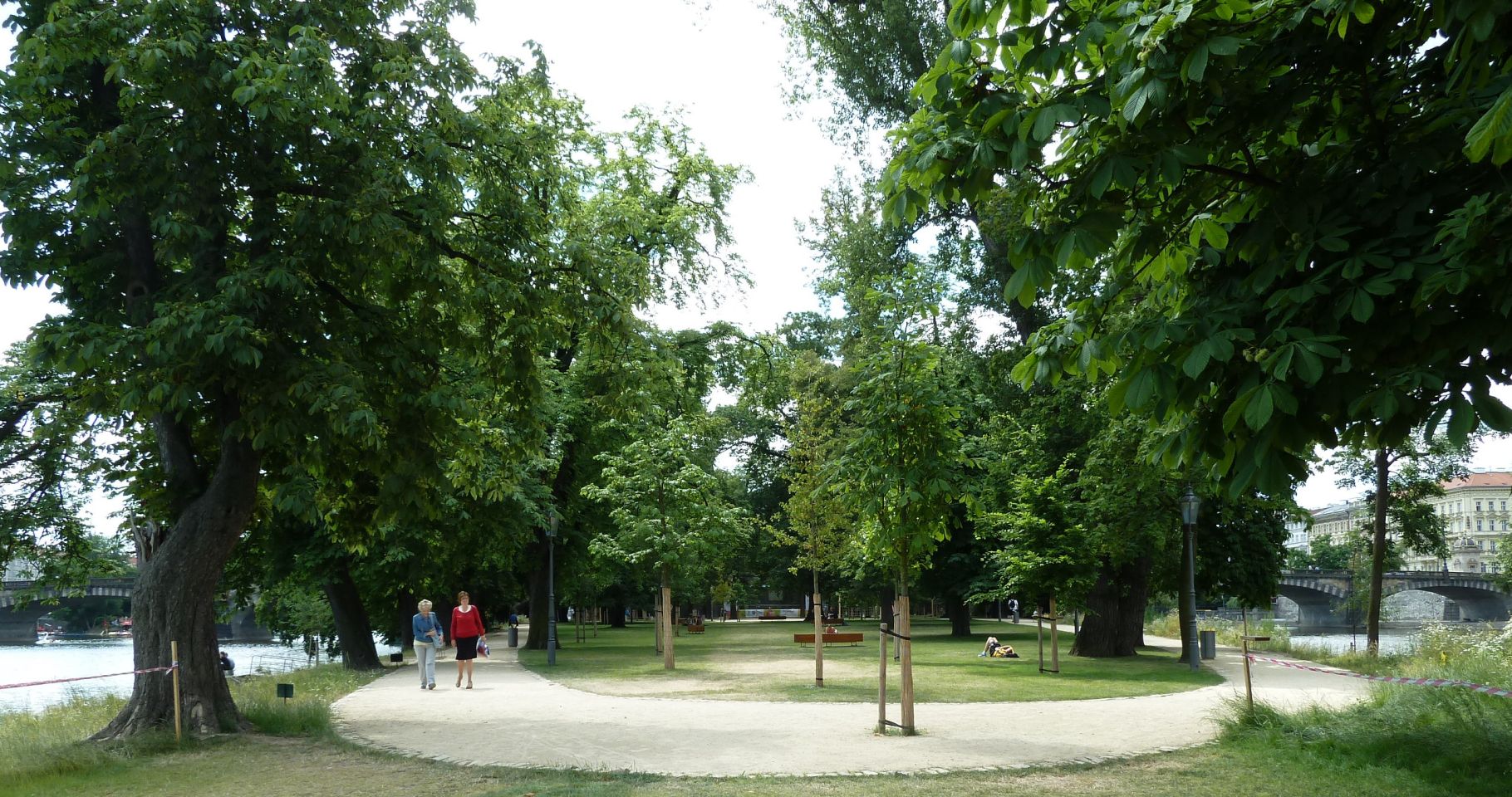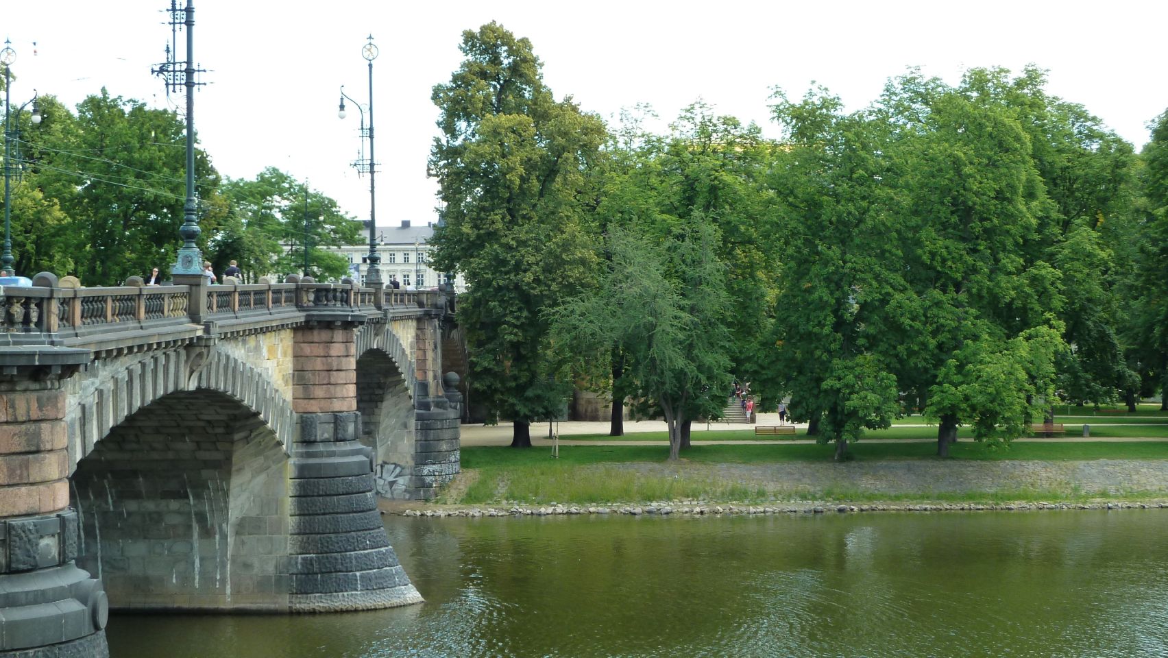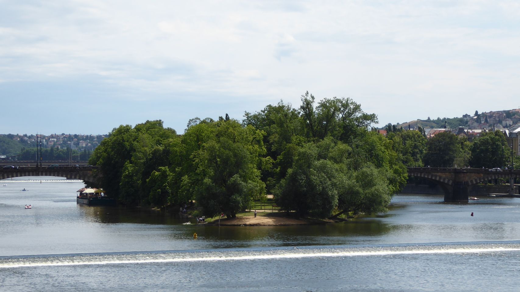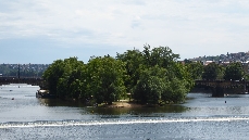1839-1841 entstand hier die erste Prager Kettenbrücke, die 1898 abgerissen und durch eine provisorische Brücke ersetzt wurde, bevor 1898 hier dann eine steinerne Brücke entstand, die heutige Legionen-Brücke. Von der Brücke erhielt die Insel einen breiten Treppenzugang .