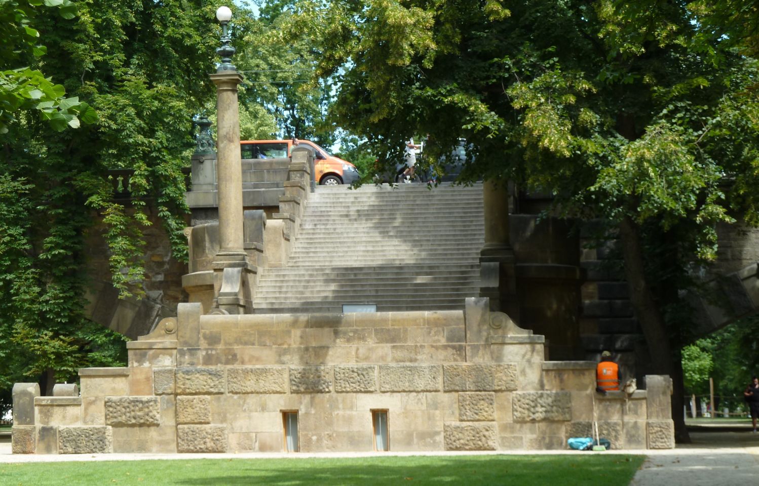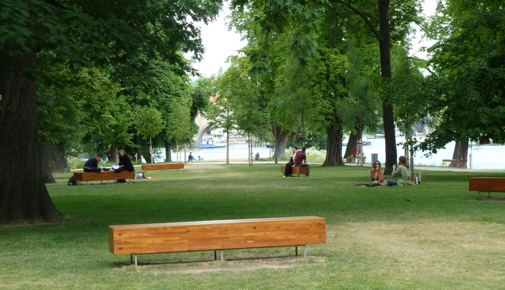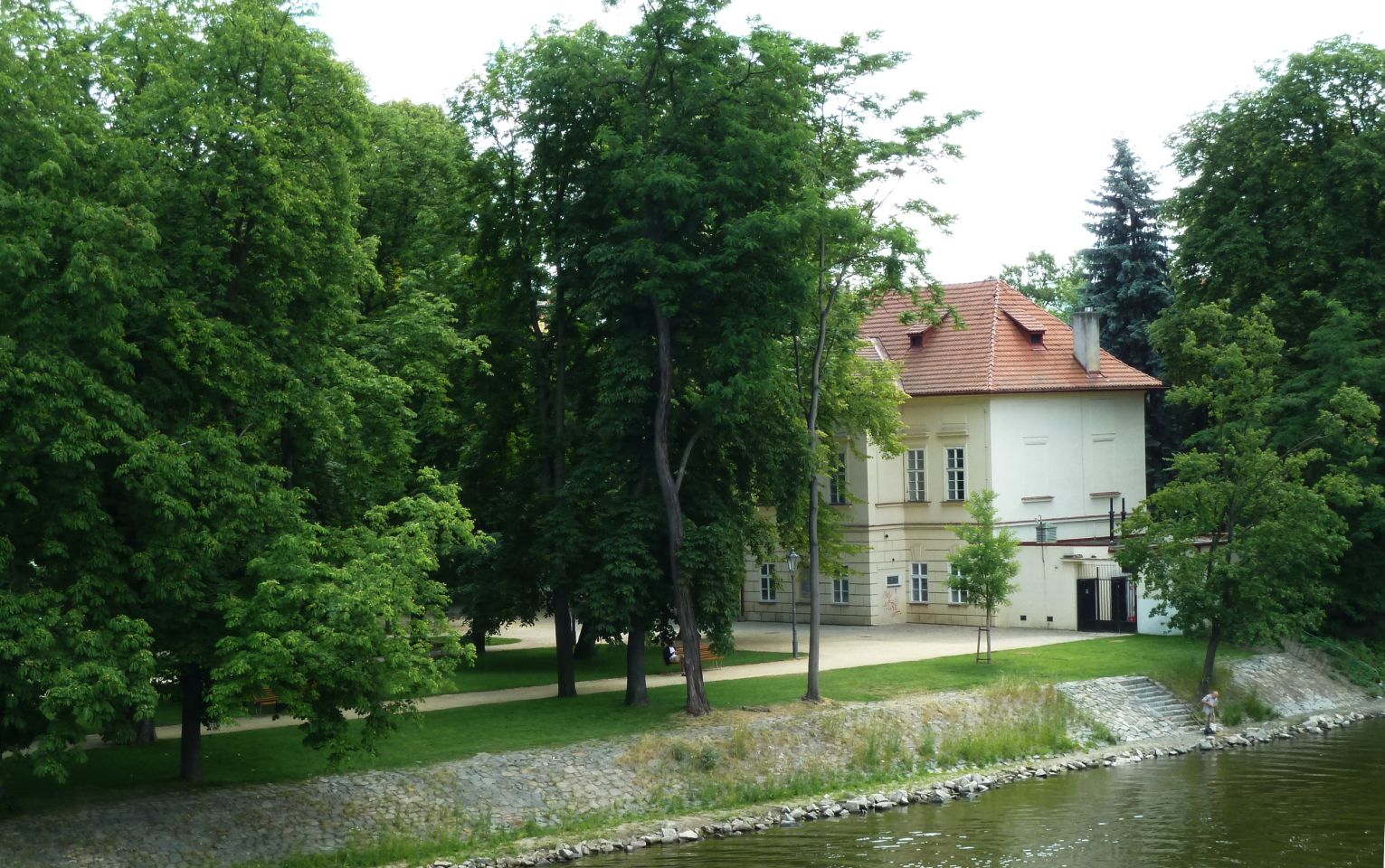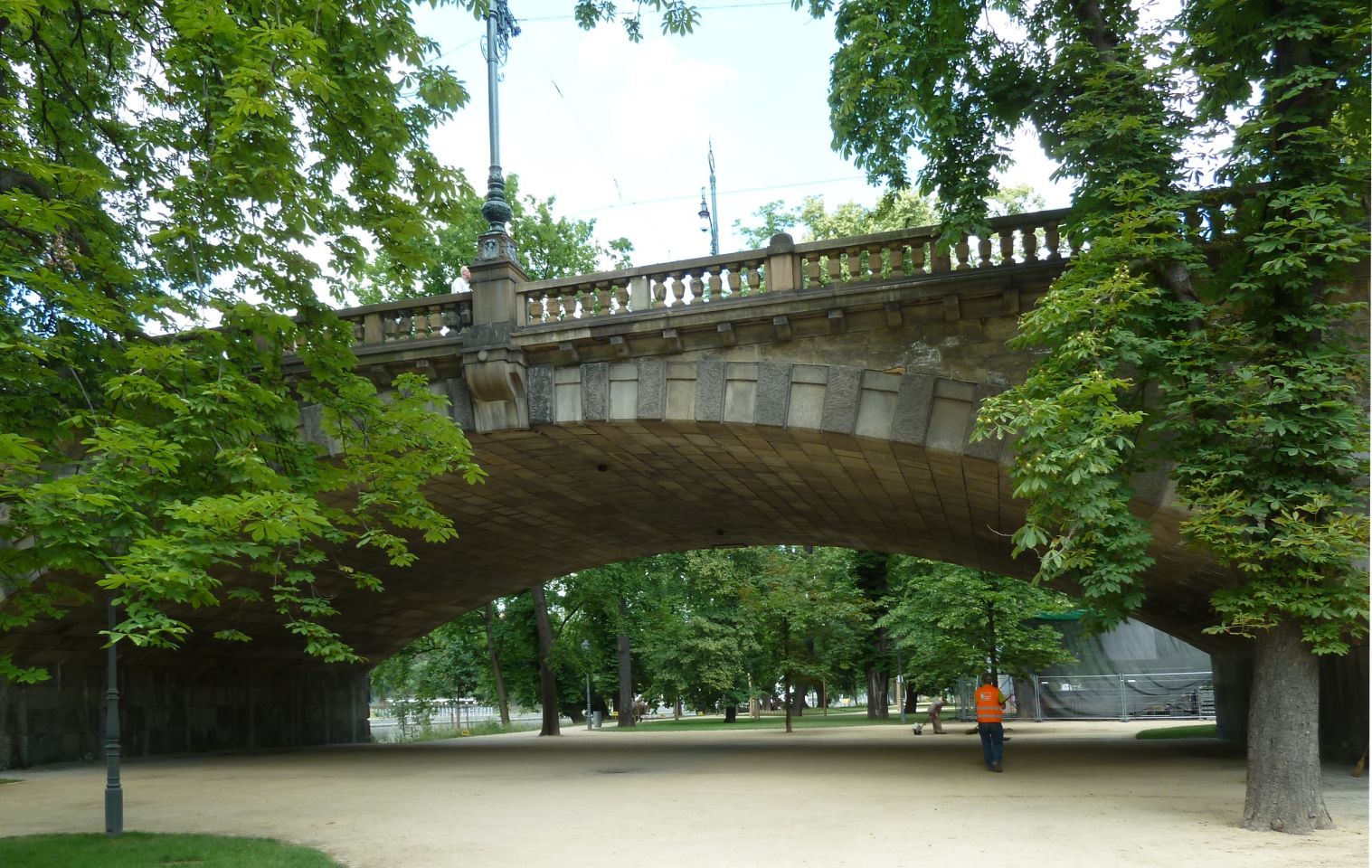 1839-1841 entstand hier die erste Prager Kettenbrücke, die 1898 abgerissen und durch eine provisorische Brücke ersetzt wurde, bevor 1898 hier dann eine steinerne Brücke entstand, die heutige Legionen-Brücke. Von der Brücke erhielt die Insel einen breiten Treppenzugang .