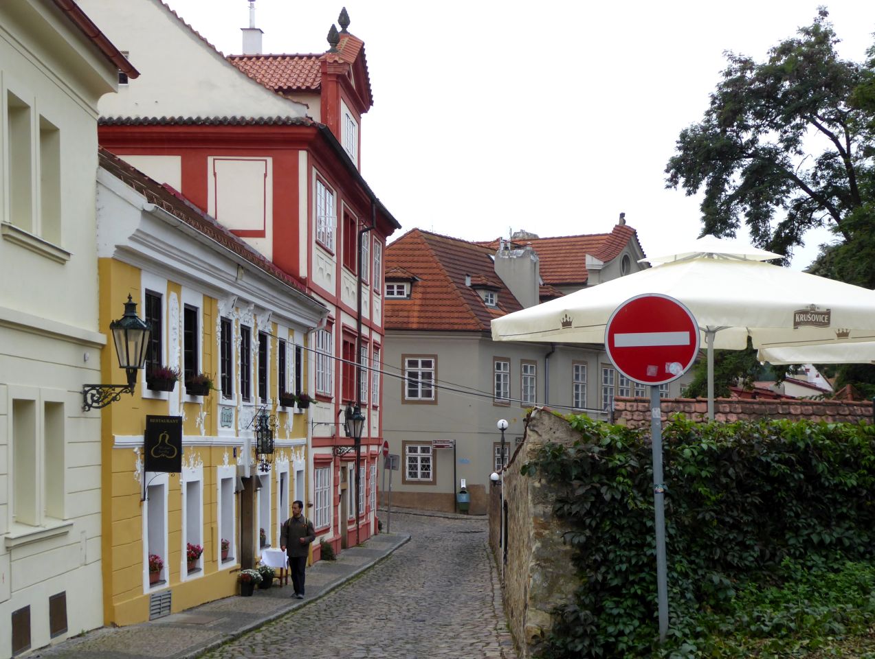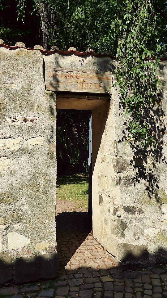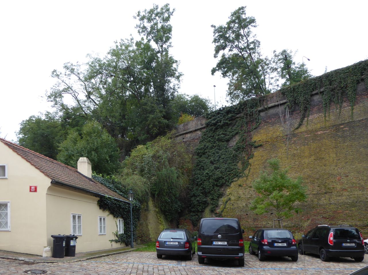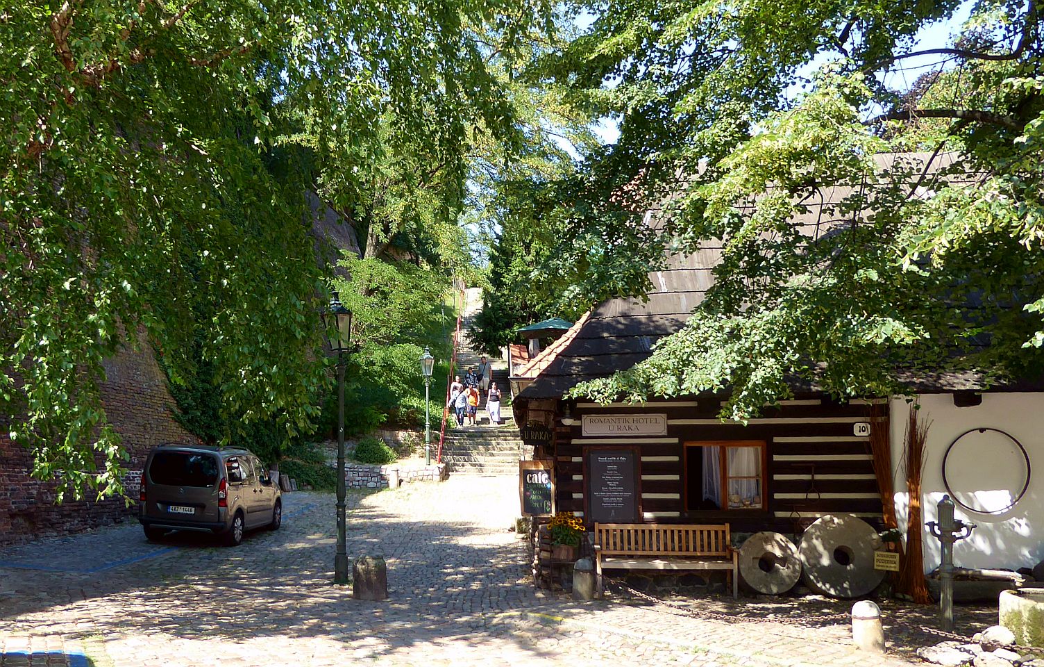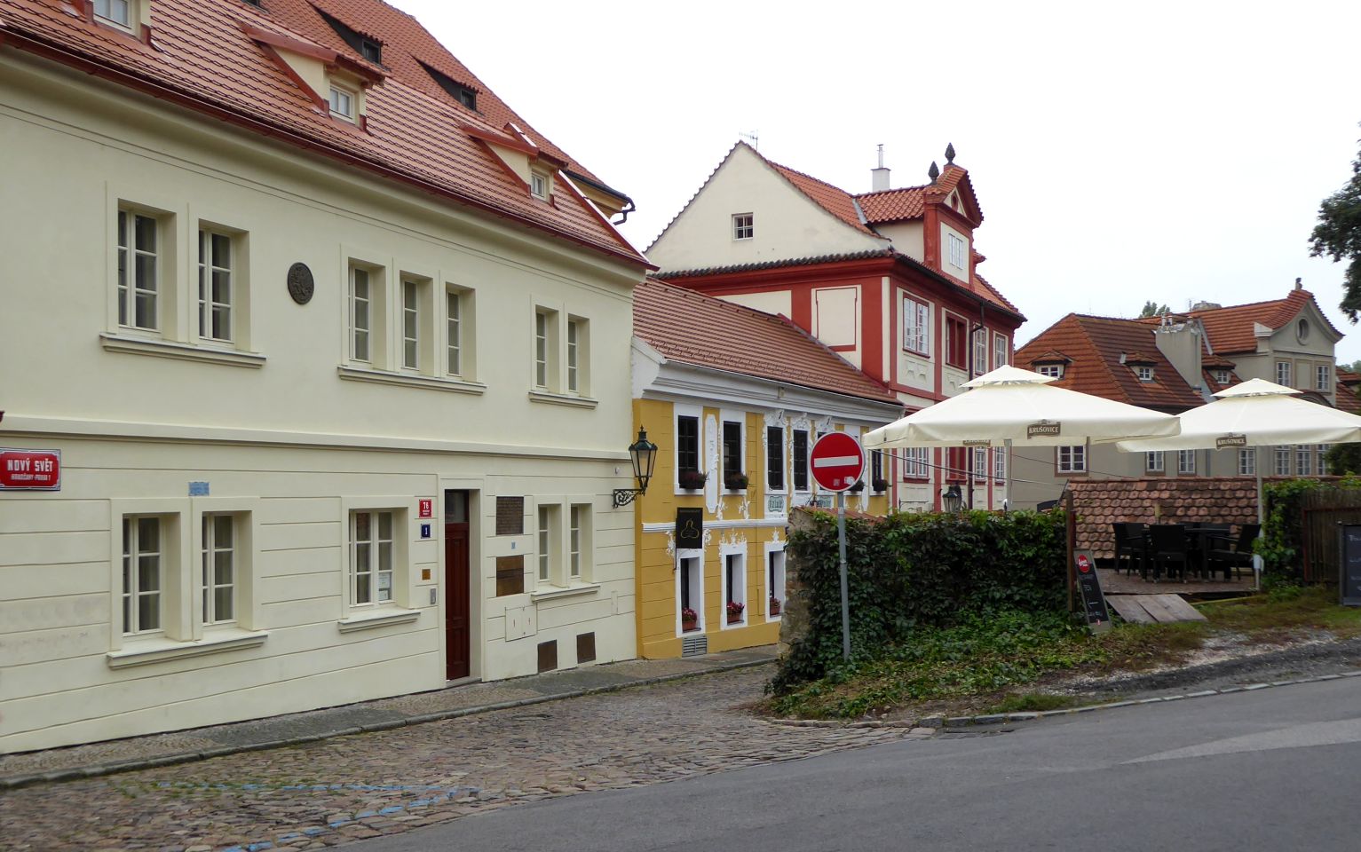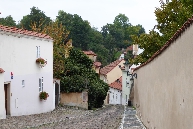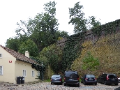 Hier kommen wir an interessanten bewohnten Häuschen, einer Sommerbühne und Kinderspielplatz zu einem reizenden kleinen Café Nový Svět. Die Straße endet an einer früheren alten Befestigungsmauer.