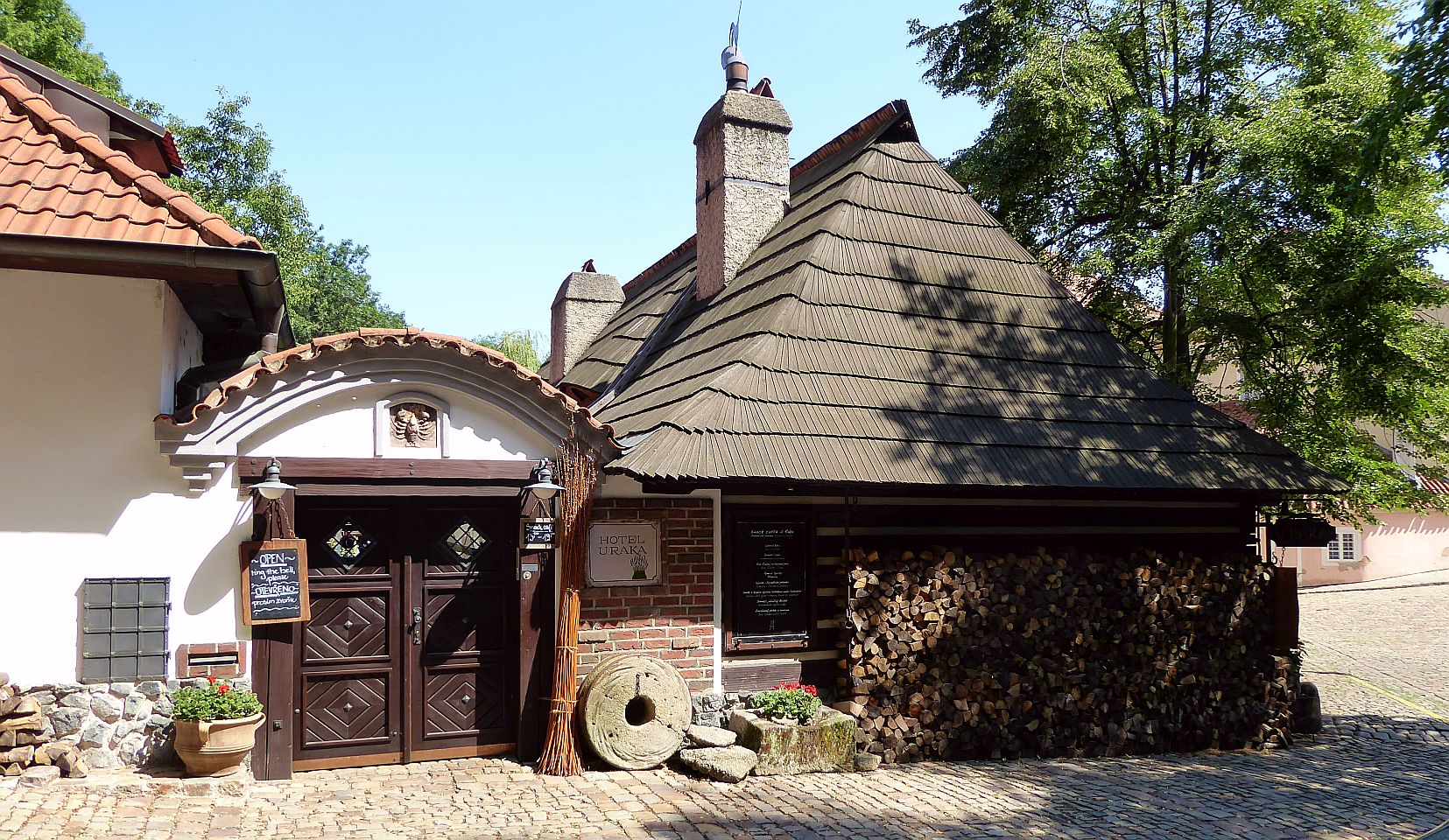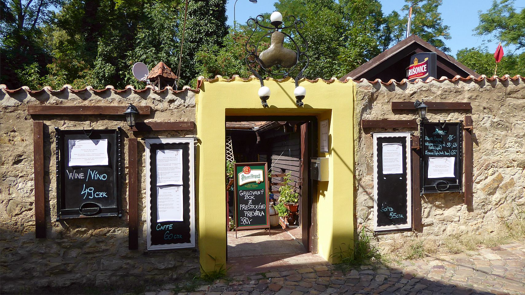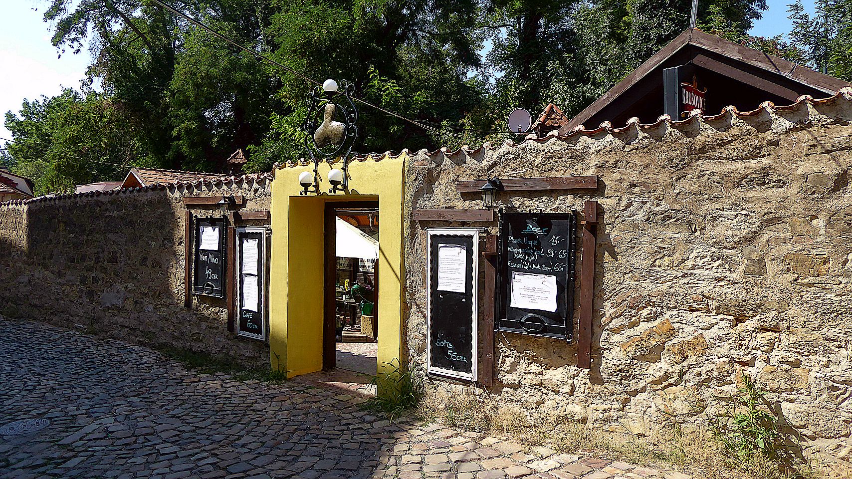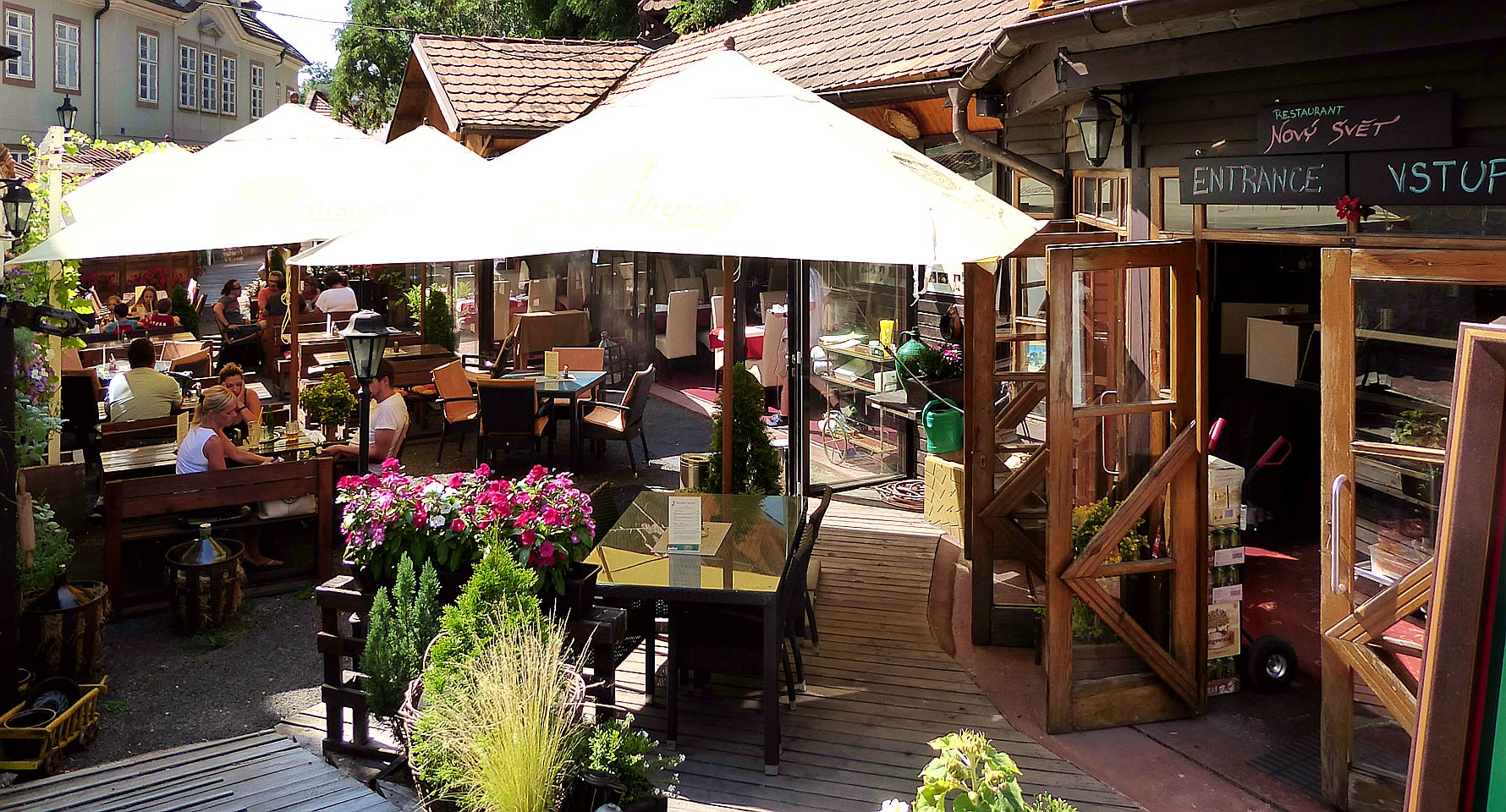 Hier kommen wir an interessanten bewohnten Häuschen, einer Sommerbühne und Kinderspielplatz zu einem reizenden kleinen Café Nový Svět. Die Straße endet an einer früheren alten Befestigungsmauer.