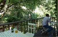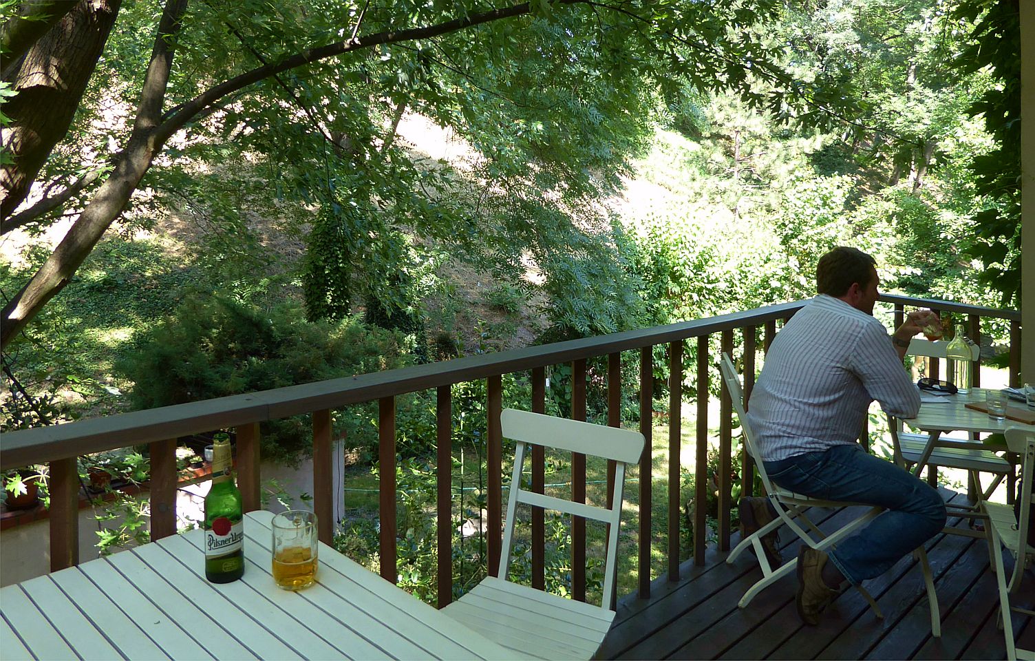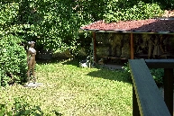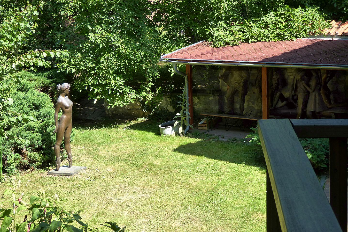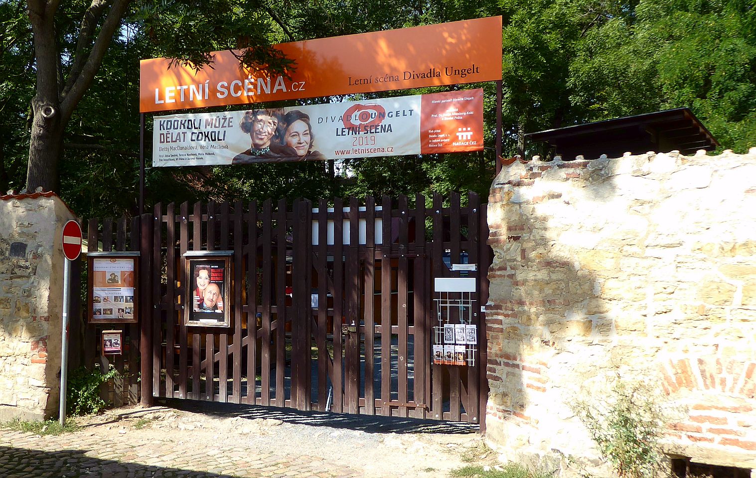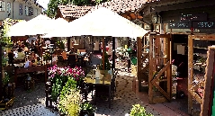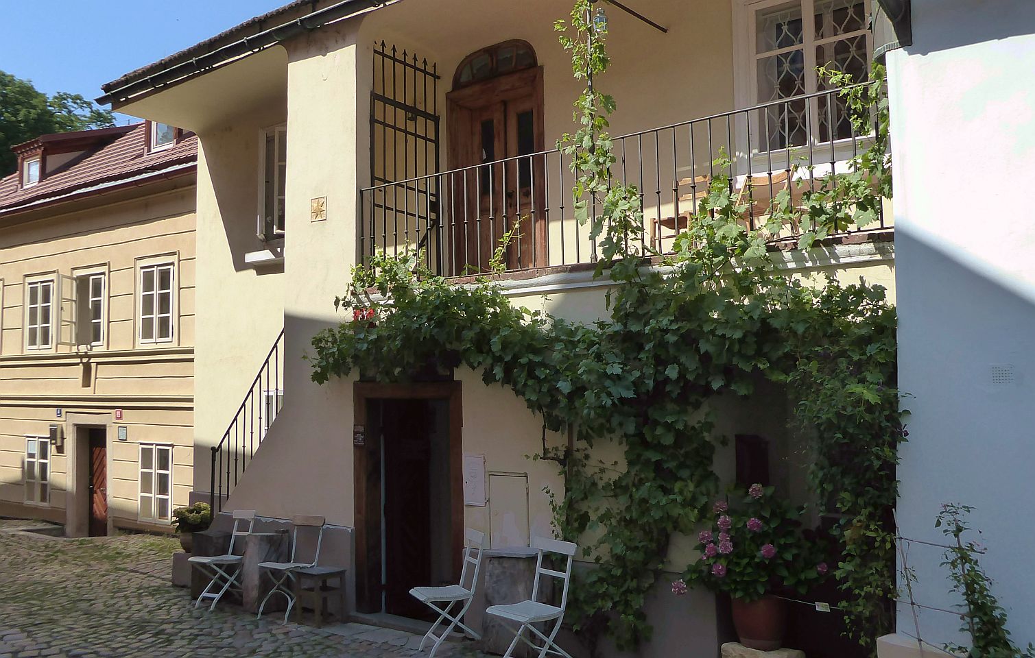 Hier kommen wir an interessanten bewohnten Häuschen, einer Sommerbühne und Kinderspielplatz zu einem reizenden kleinen Café Nový Svět. Die Straße endet an einer früheren alten Befestigungsmauer.