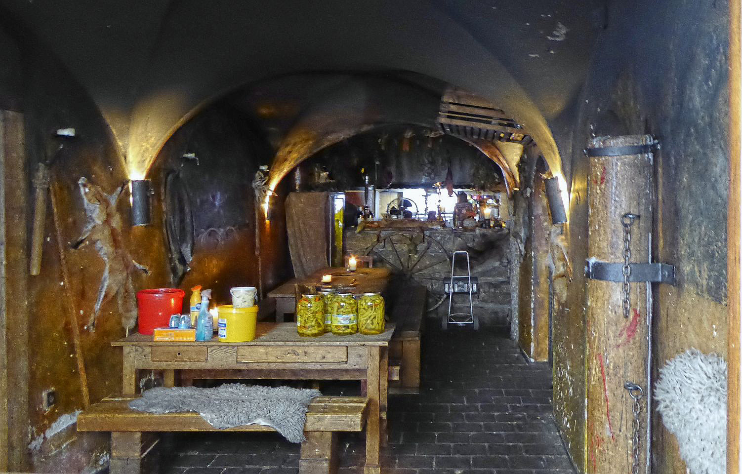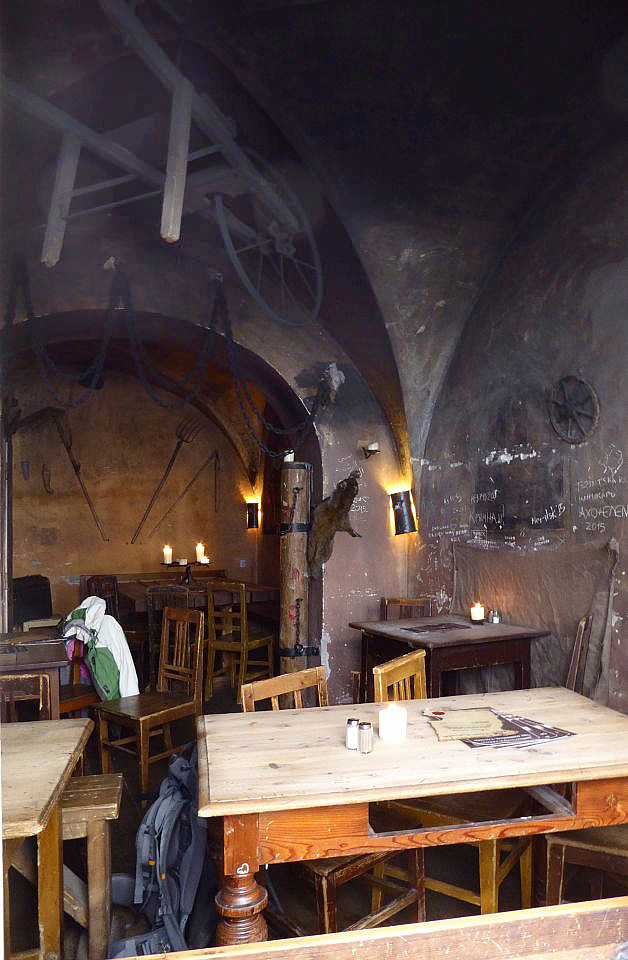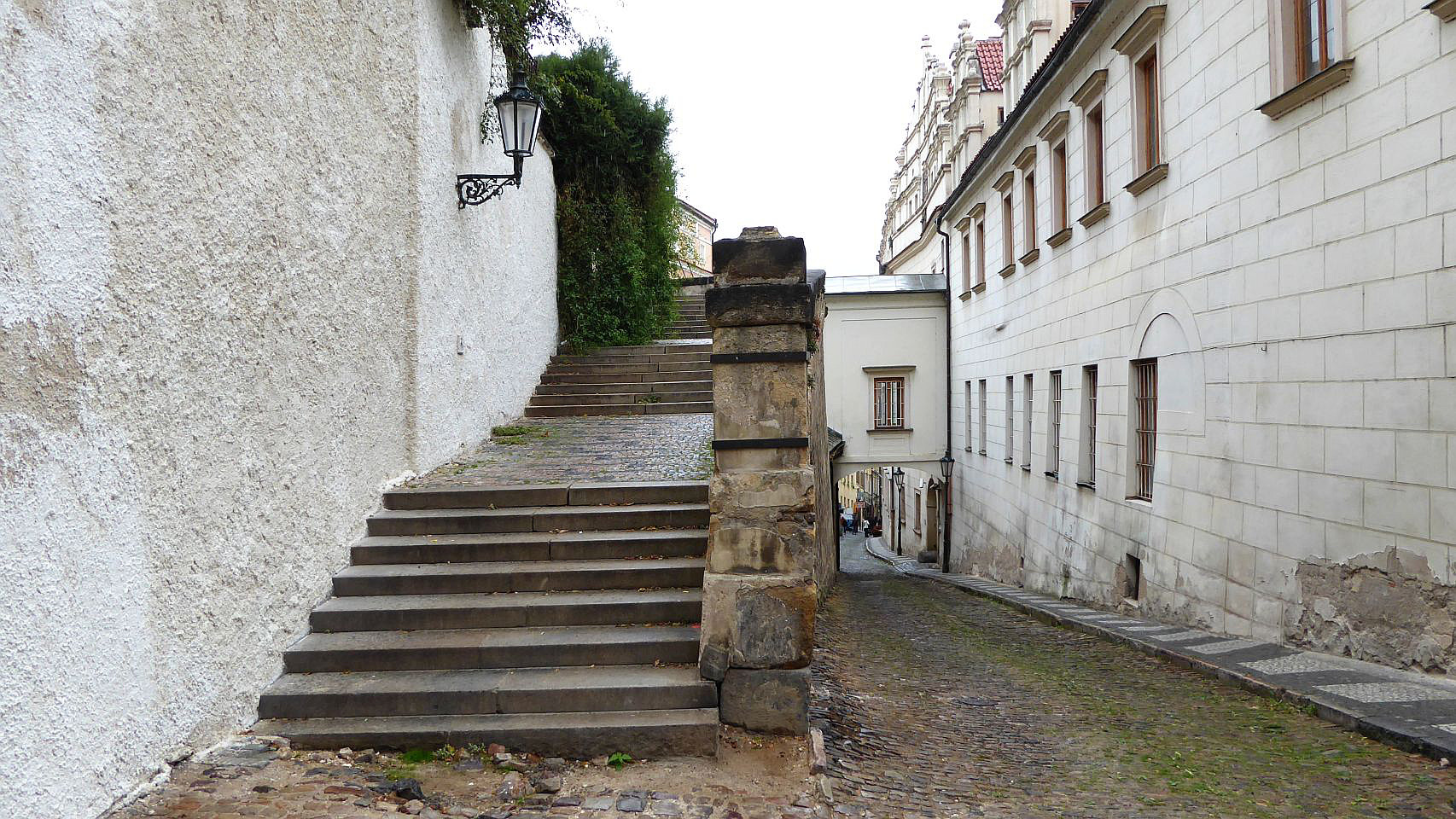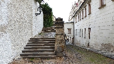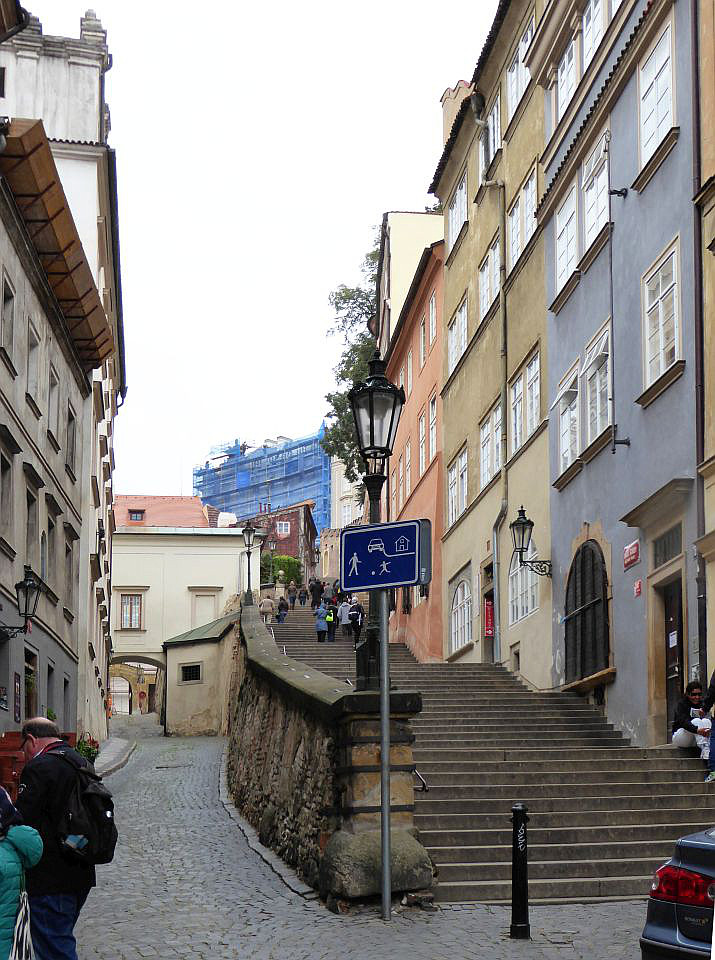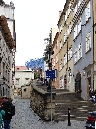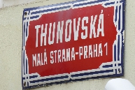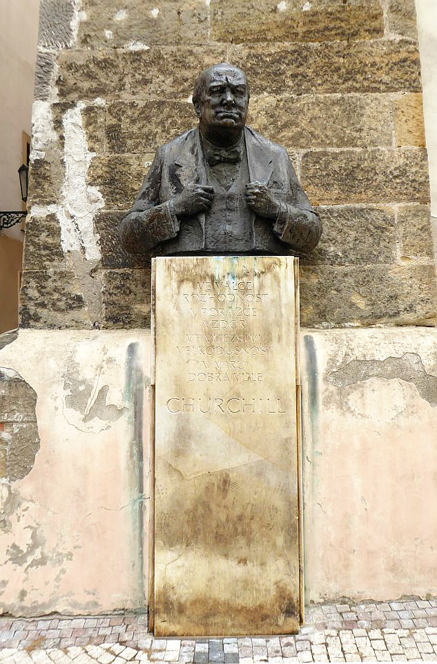 An der nächsten Straßenkreuzung biegen wir rechts in die Straße Thunovská und stoßen auf die Gedenkbüste von Winston Churchil. Rechts ist die Zufahrt zum Palast der UK-Vertretung. Weiter durch die hier recht schmale Thunovská-Gasse geht es zu der Neuen Schloßstiege, die zu der Burg führt. Links ist eine mittelalterliche Kneipe interessant.