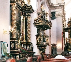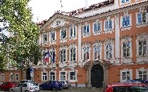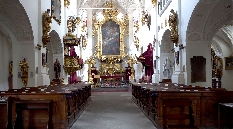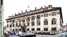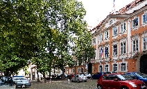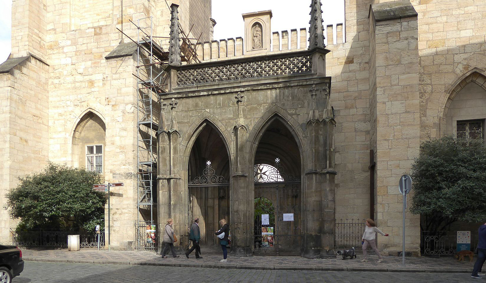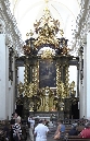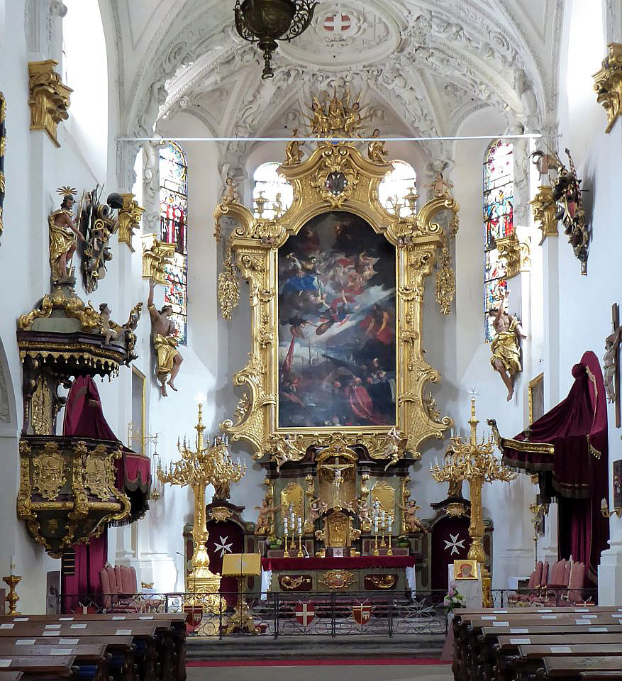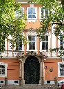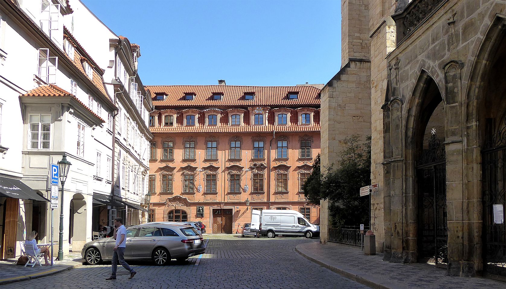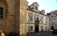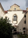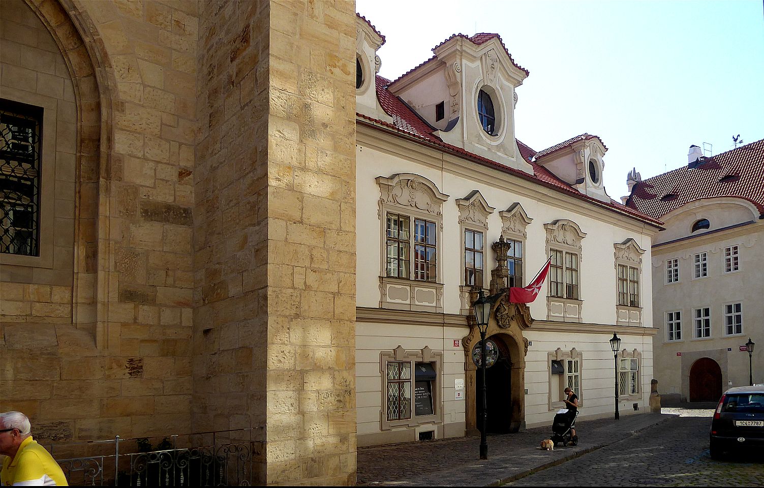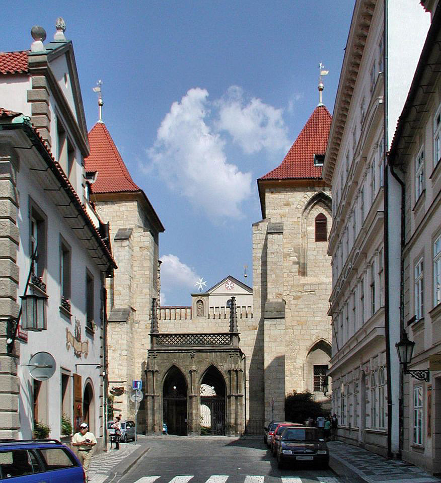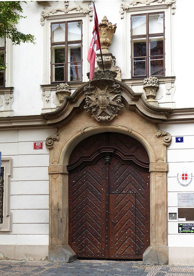 Links lehnt an die Kirche die Vertretung des suveränen Malteser Ritter-Ordens im früheren Malteser-Kloster und gegenüber sehen wir den Sternegg-Palast, auch Thun-Palast oder auch Zur goldenen Gans, heute im Privatbesitz. Erbaut 1686 an Stelle eines früheren Wehrturmes des damals befestigten Klosters. Die Straße weiter würden wir nach ein paar Schritten die Karlsbrücke erreichen.Wir gehen zurück zur ältesten Kirche der Kleinseite mit dem vollen Namen Kirche Jungfrau Maria unter der Kette am Ende der Brücke (gemeint war die die Judith-Brücke, Vorgängerin der Karlsbrücke) und besichtigen den Innenhof und die Kirche selbst.