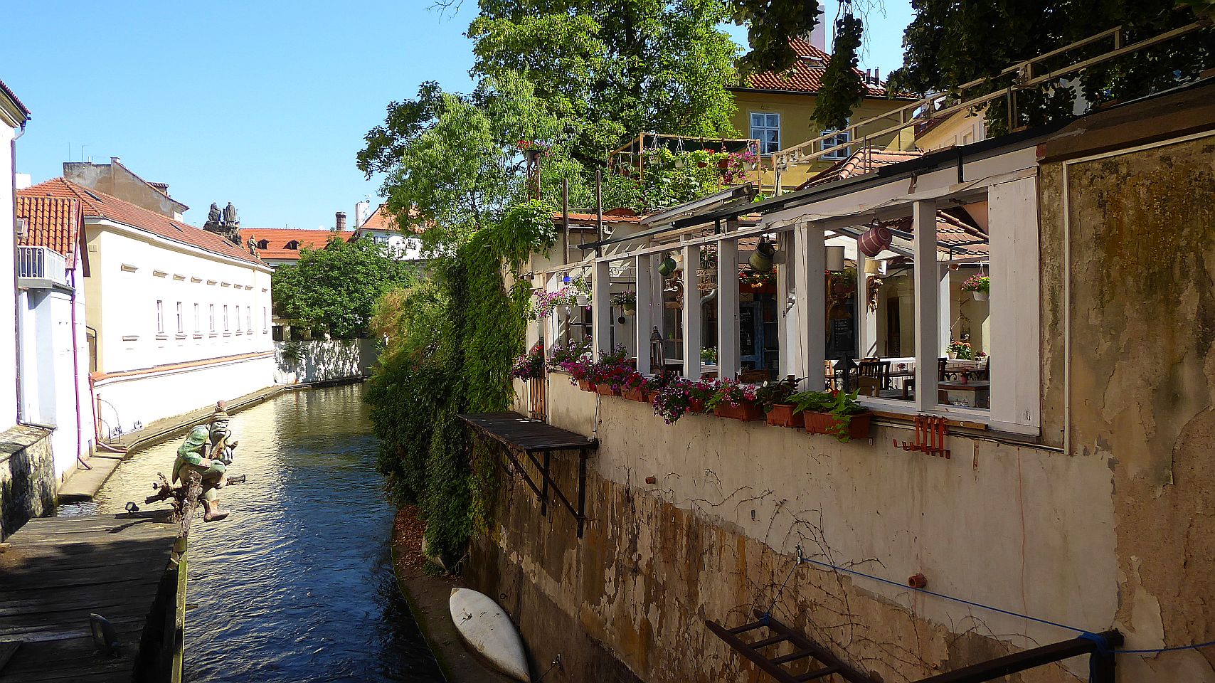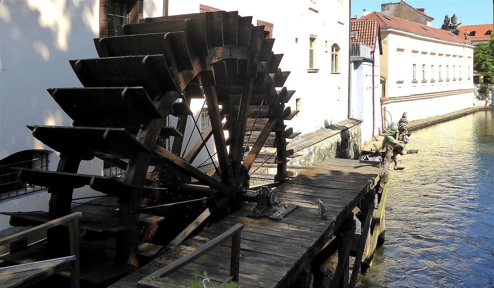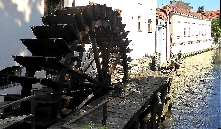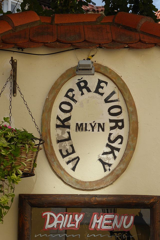 Den Platz verlassen wir am Ende durch eine Engstelle an der Großprior-Mühle über eine Brücke über den Mühlbach Čertovka. Hier am Mühlbach auf der Insel Kampa steht ein Gartenrestaurant gleichen Namens mit einem Blick auf das Mühlrad der früheren Mühle. Schräg links gegenüber ist der John-Lennon-Pub, entstanden in Folge der Berühmtheit der John-Lennon-Wand. Rechts von der Brücke durch die Hroznová kommen wir direkt zum Lichtenštejn-Palast auf der Insel.
