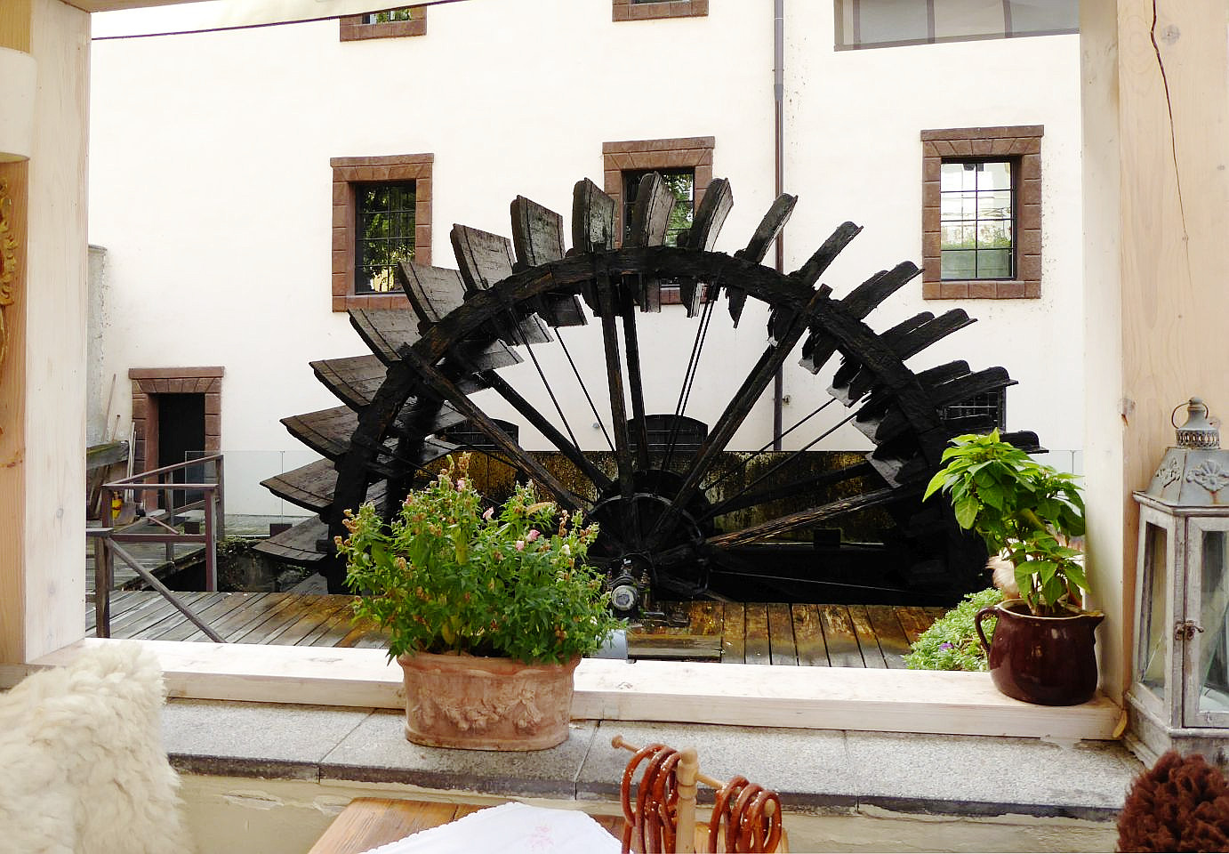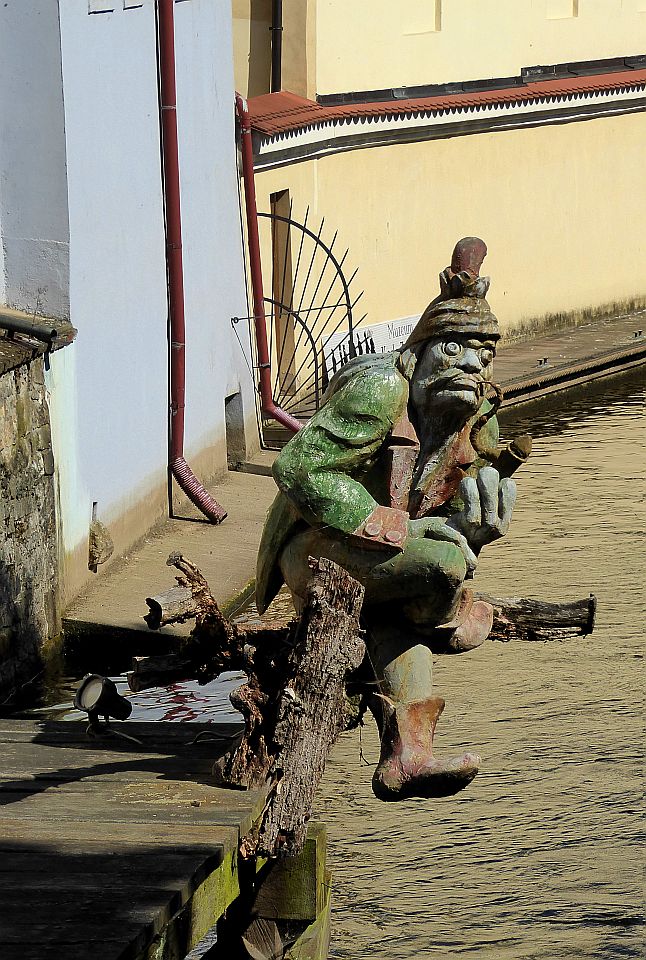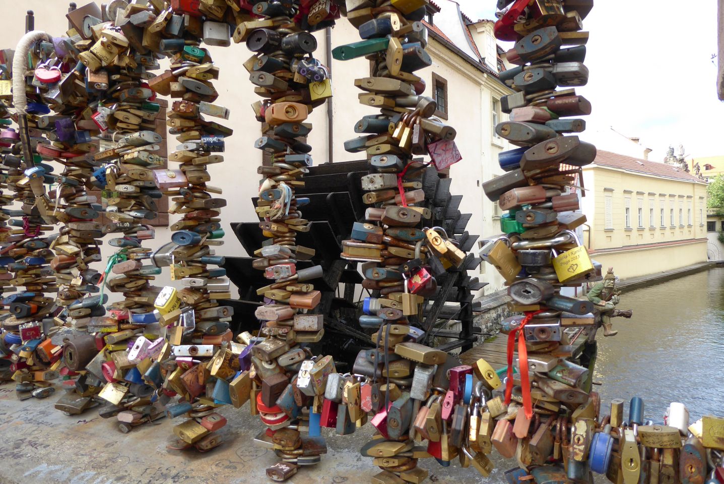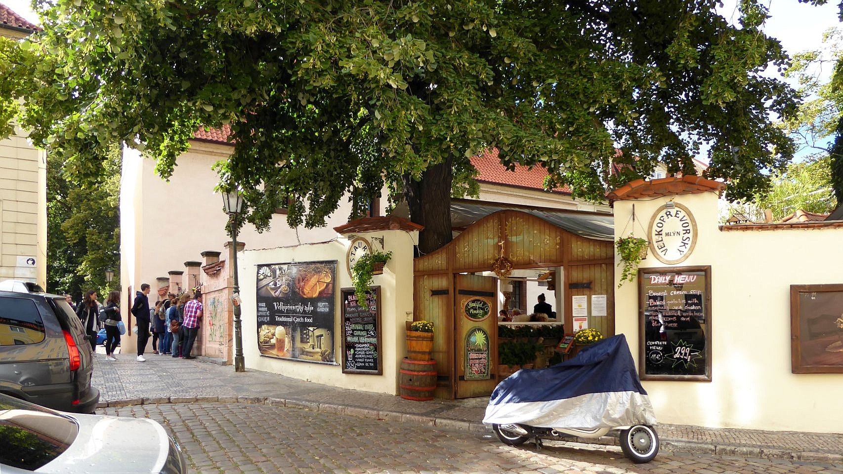 Den Platz verlassen wir am Ende durch eine Engstelle an der Großprior-Mühle über eine Brücke über den Mühlbach Čertovka. Hier am Mühlbach auf der Insel Kampa steht ein Gartenrestaurant gleichen Namens mit einem Blick auf das Mühlrad der früheren Mühle. Schräg links gegenüber ist der John-Lennon-Pub, entstanden in Folge der Berühmtheit der John-Lennon-Wand. Rechts von der Brücke durch die Hroznová kommen wir direkt zum Lichtenštejn-Palast auf der Insel.