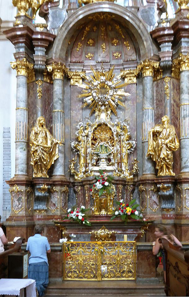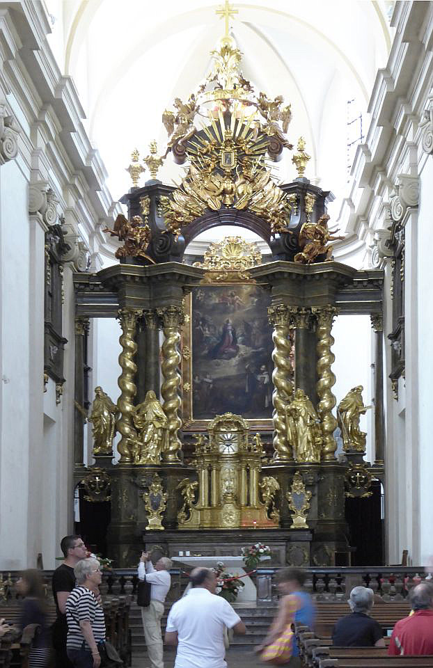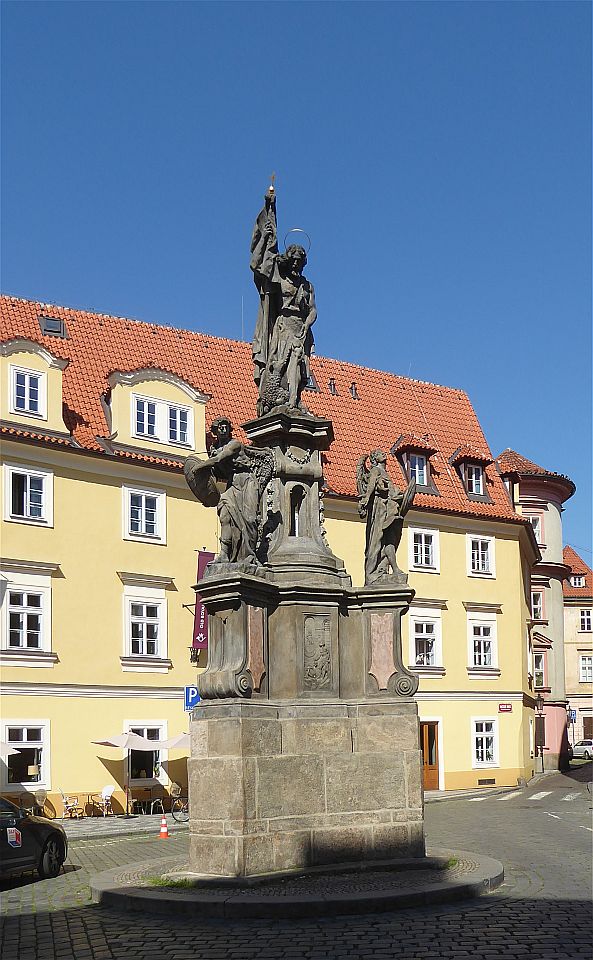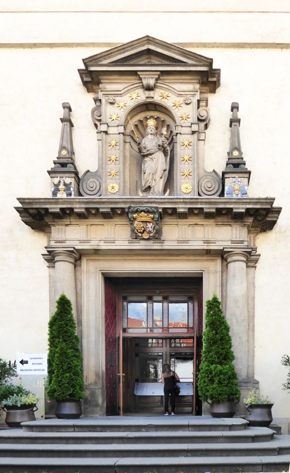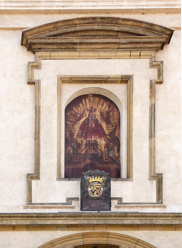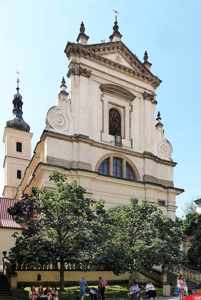 In der Karmelitská gehen wir an einer Uhrensäule vorbei bis zu der Kirche Jungfrau Maria vom Siege am Karmeliten-Kloster auf der rechten Straßenseite. Hier wird das Prager Jesulein oder Prager Jesuskind (Pražské Jezulátko), weltweit eines der bekanntesten wundertätigen Gnadenbilder Jesu, aufbewahrt. Rechts um die Ecke steht der Nostic-Palast von 1670 in dem das Kulturministerium siedelt und die berühmte Bildergalerie und Nosic-Bücherei beherbergt.