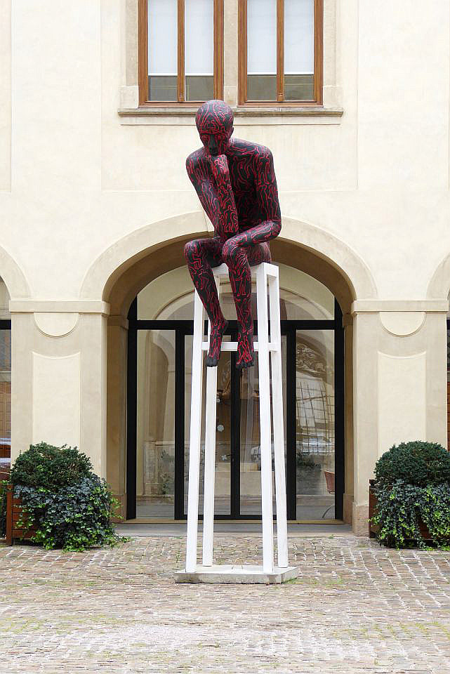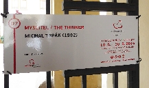 Wir gehen aber geradeaus weiter und erreichen auf der linken Seite das Haus Nr.3 mit einer Schlange als Hauszeichen. Davor steht ein Baum mit einer Sitz-Gruppe, die Václav Havel-Bank, ein Symbol der Begegnungs- und Gesprächs-Bereitschaft, als Botschaft des verstorbenen tschechischen Präsidenten Václav Havel (*1936 +2011, Präsident 1989-1992 und 1993-2003) und als Objekt, das an verschieden Plätzen in der Welt aufgestellt wurde. U.a. in Georgtown Universität in Washington DC, in St.Patrik-Park in Dublin, in Parc de la Ciutadella in Katalanien, auf der Insel San Servolo bei Venedig und nach 2014 an vielen anderen Orten.