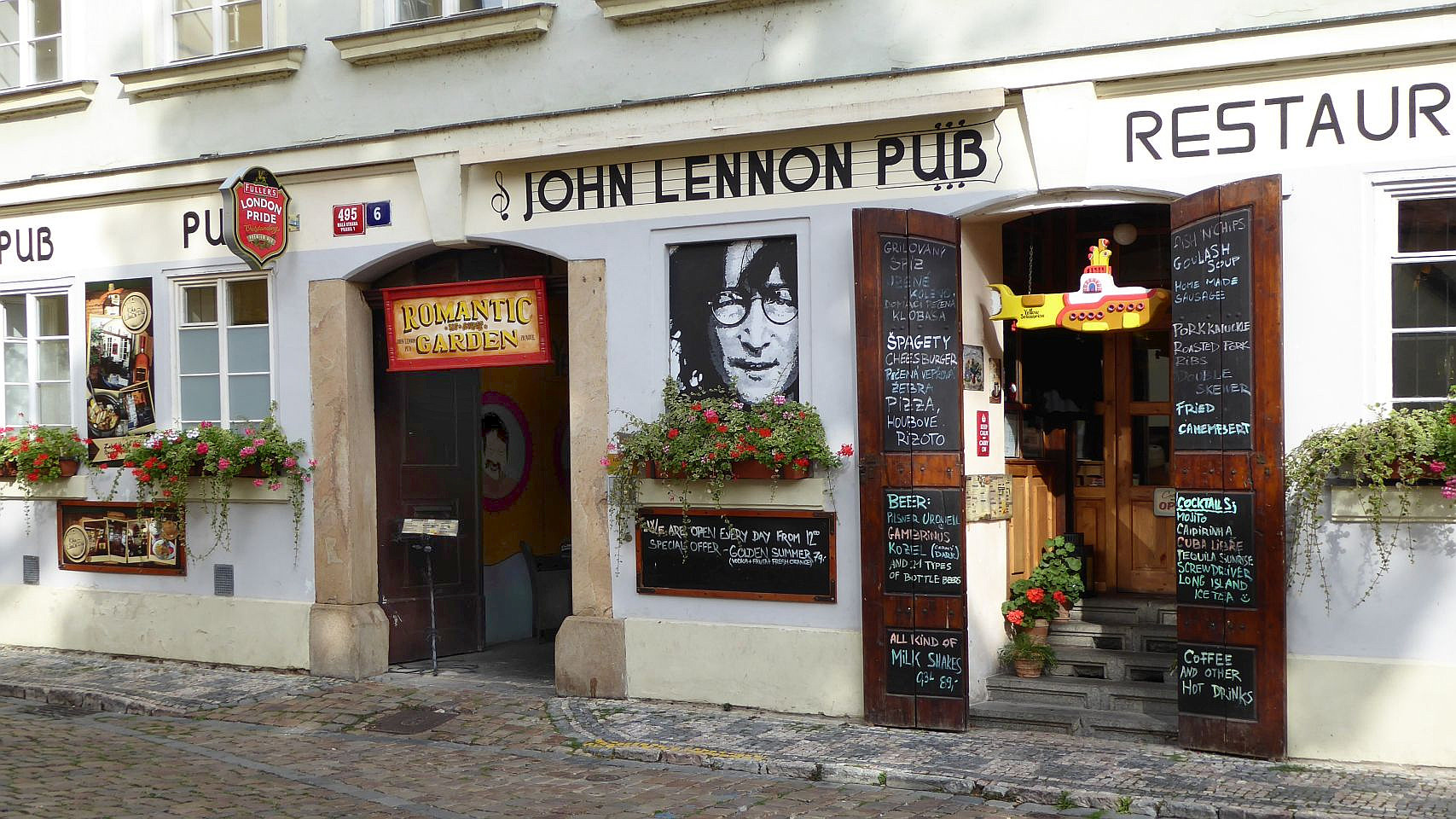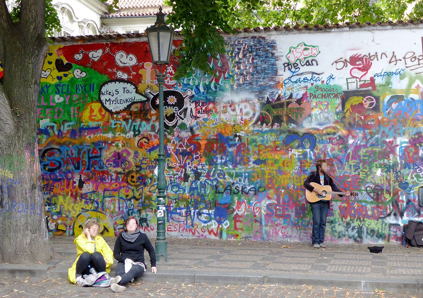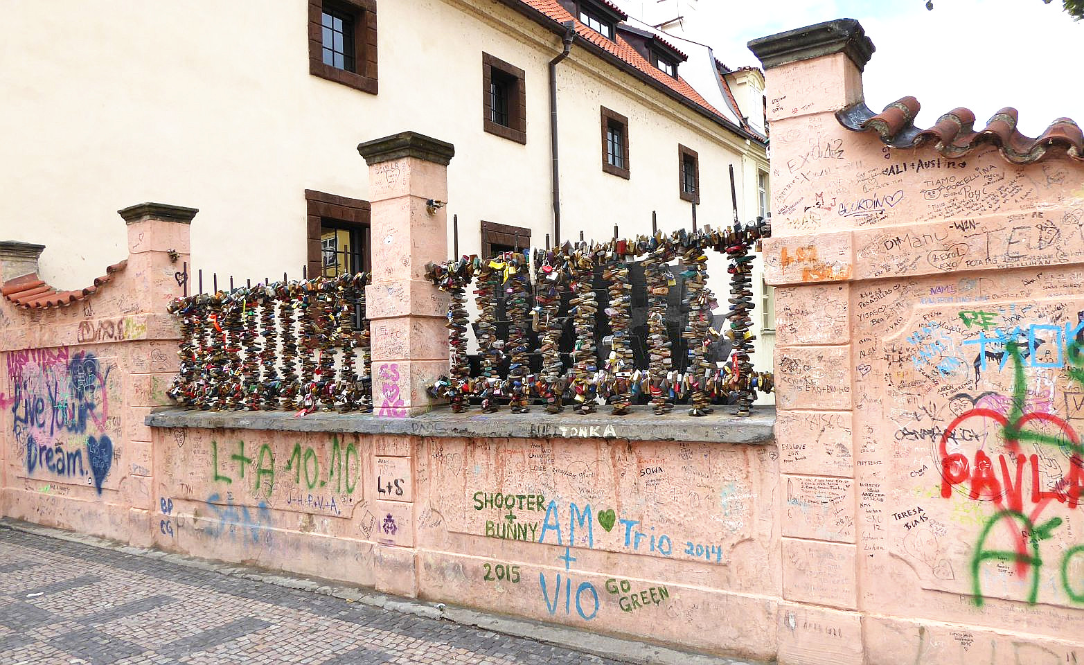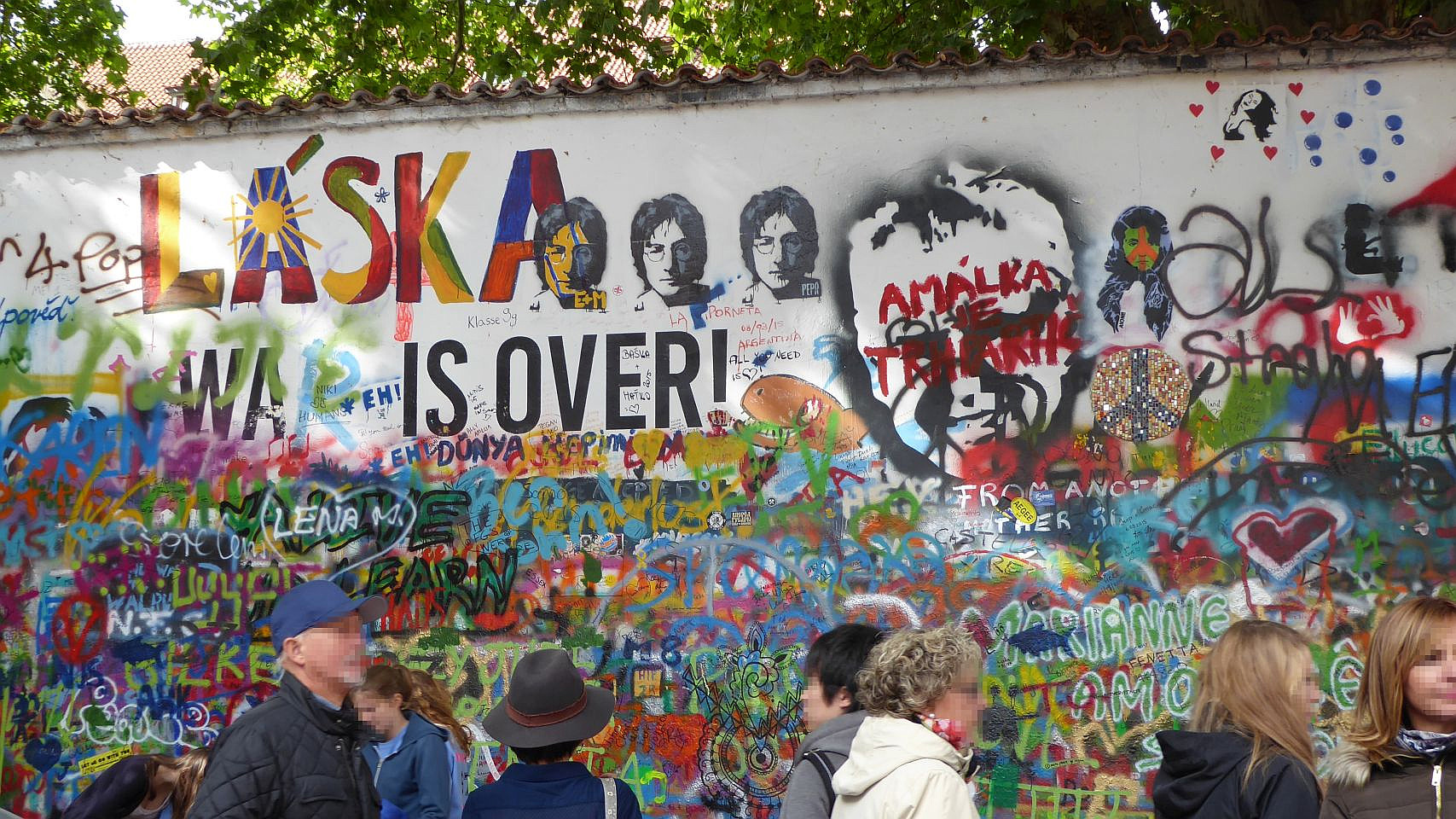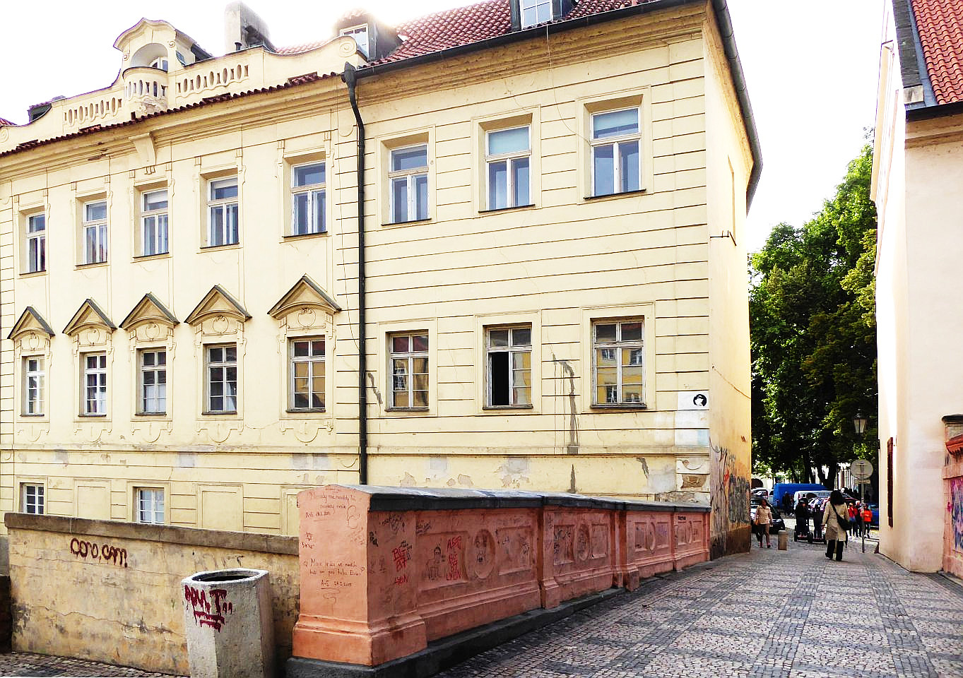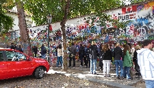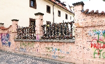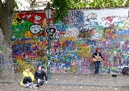 Anschließend links um den angrenzenden Großprior-Palast herum, erreichen wir den Großprior-Platz. Die Mauer des Palastgartens ist eine der jüngeren Sehenswürdigkeiten - die John-Lennon-Mauer. Die Wand wurde 1980 mit von Jon Lennon inspirirten Graffiti und mit Texten von Beatles-Songs von der Prager Jugend bemalt, was natürlich zu Konflikten mit dem damaligen kommunistischen Regime führte, die in einem Zusammenstoß zischen Hunderten von Studenten und der Polizei auf der Karlsbrücke eskalierte. Die Wand wurde übermalt aber kurz darau schon wieder voll mit Graffiti. Heute wird die Graffiti vom Malteserorden geduldet.