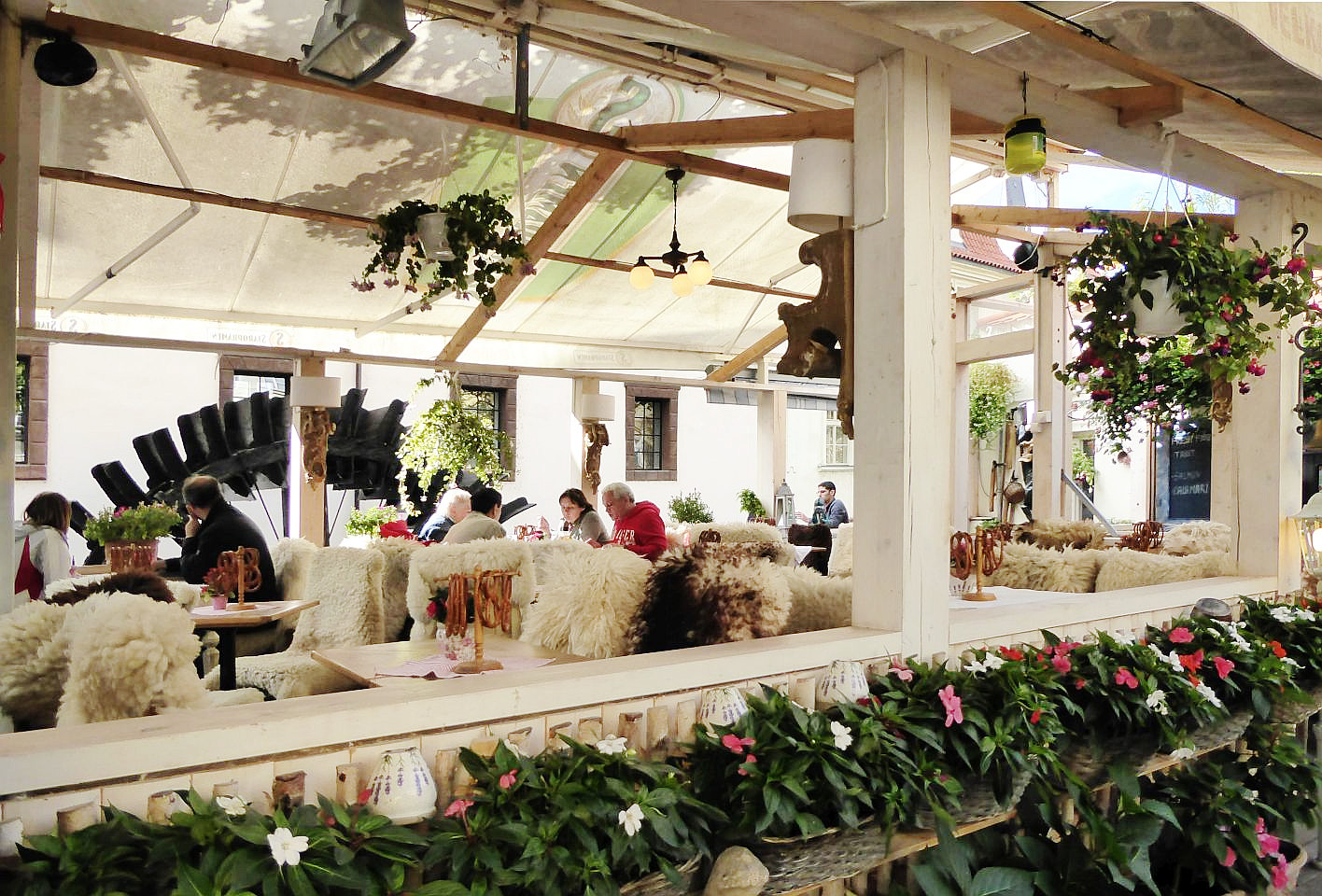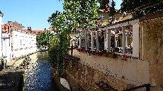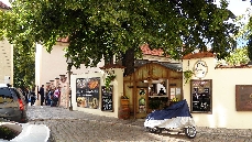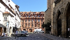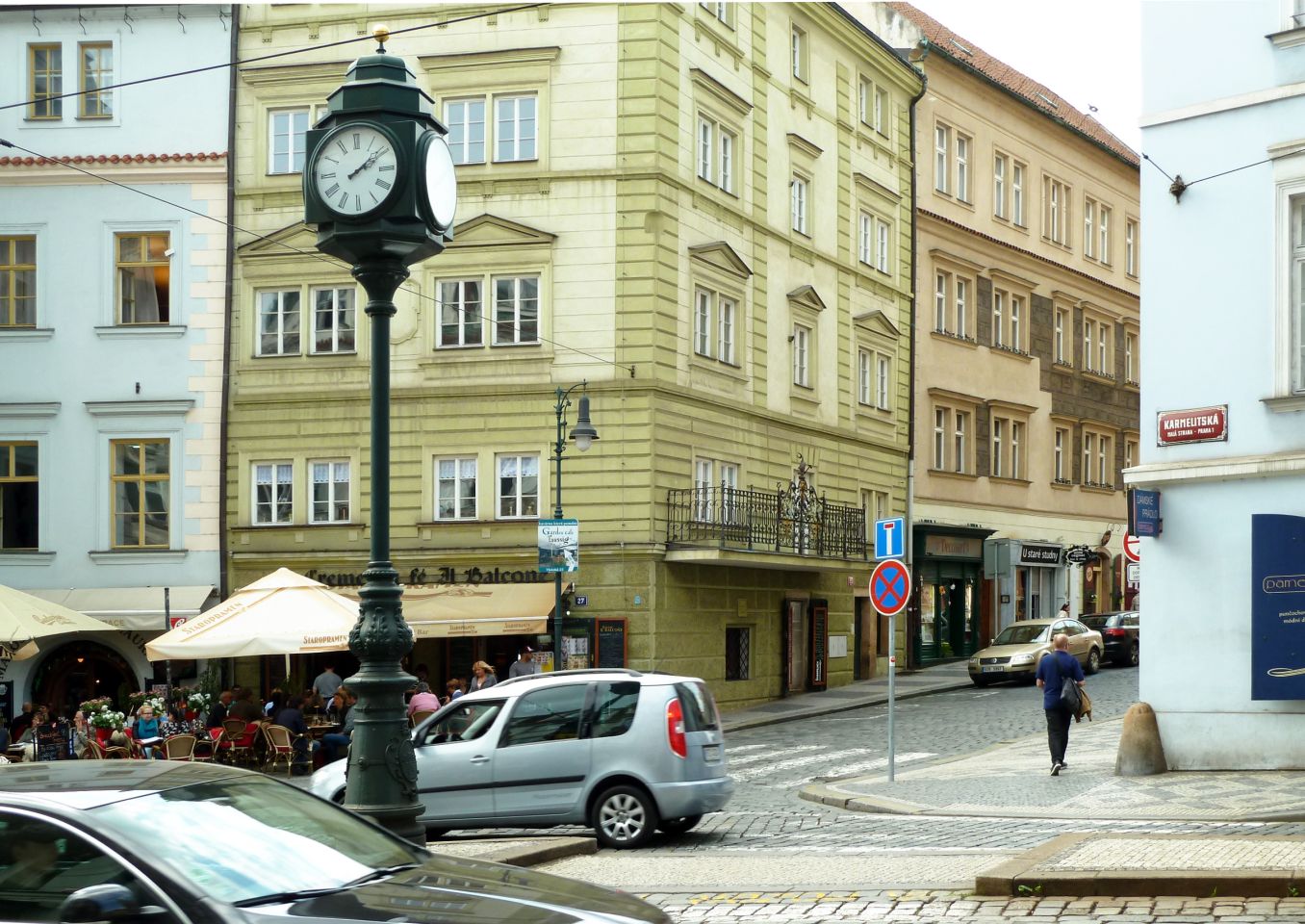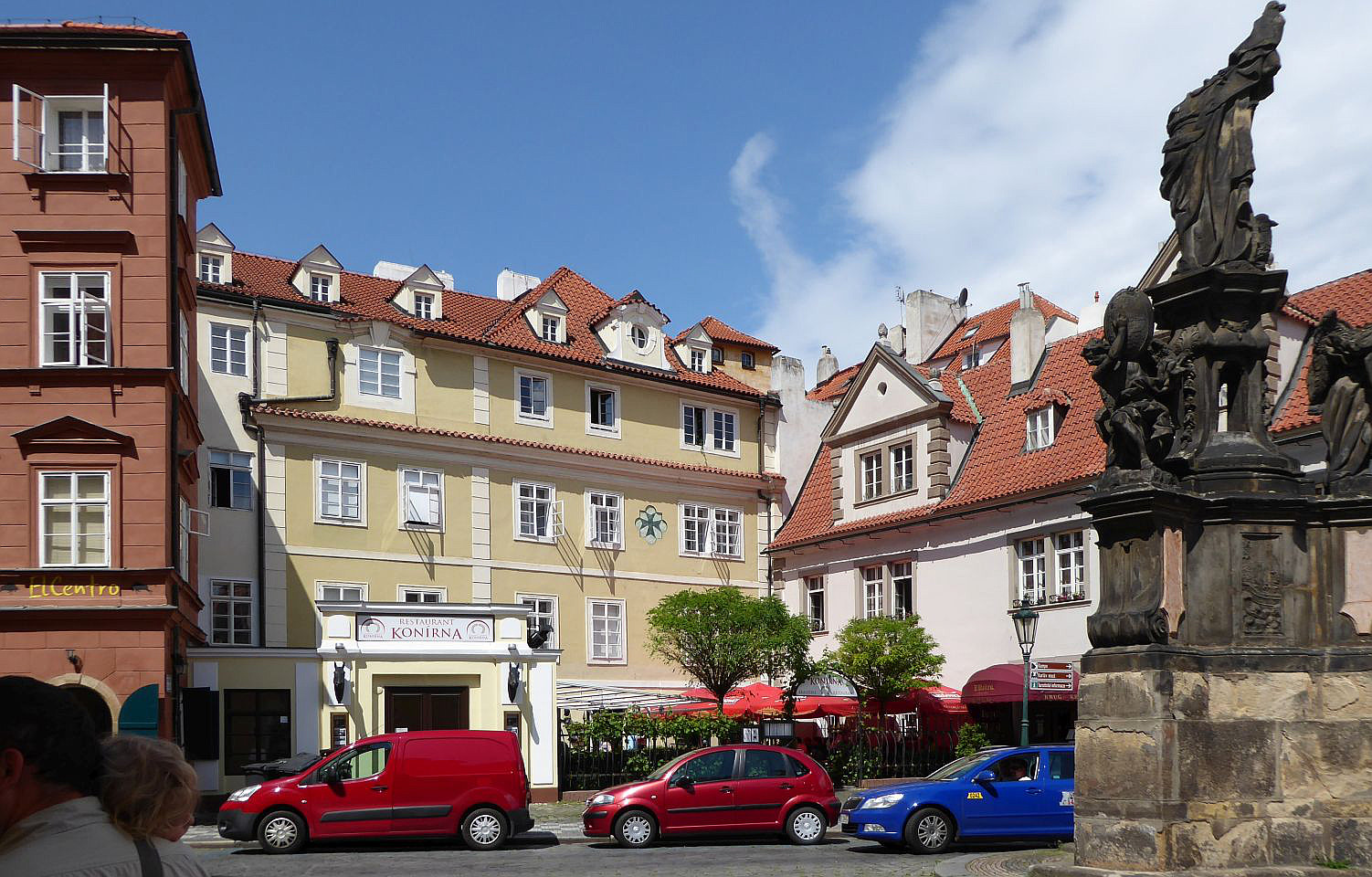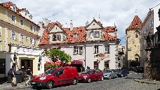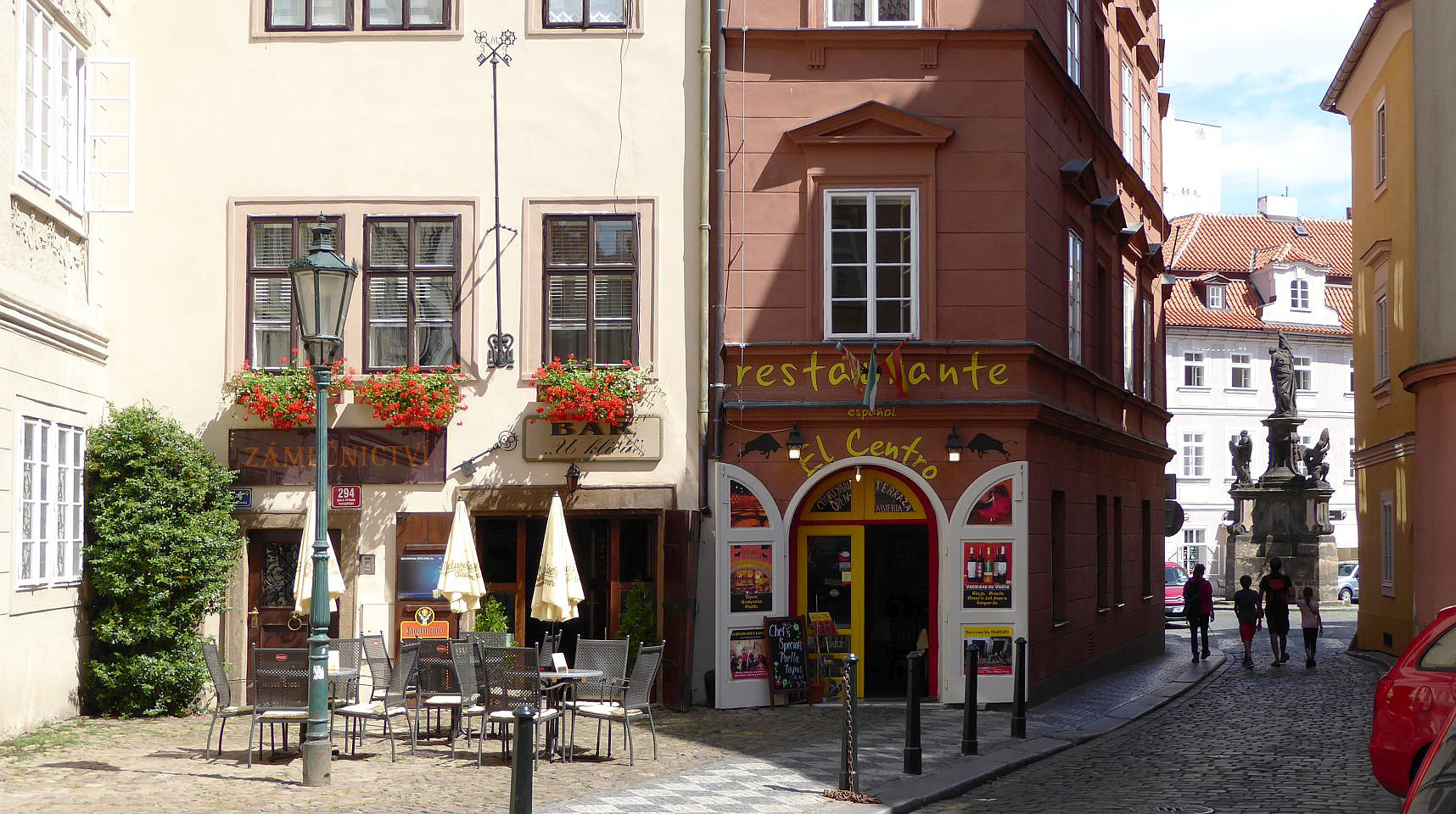 Danach stoßen wir auf die Querstraße Prokopská und ein Restaurant, das z.Zt. Pferdestall - Konírna heißt. Links von diesem kleinen Platz kommen wir durch eine Verengung der Straße zu einer malerischen Ecke mit 2 Tischen eines Restaurants El Centro.