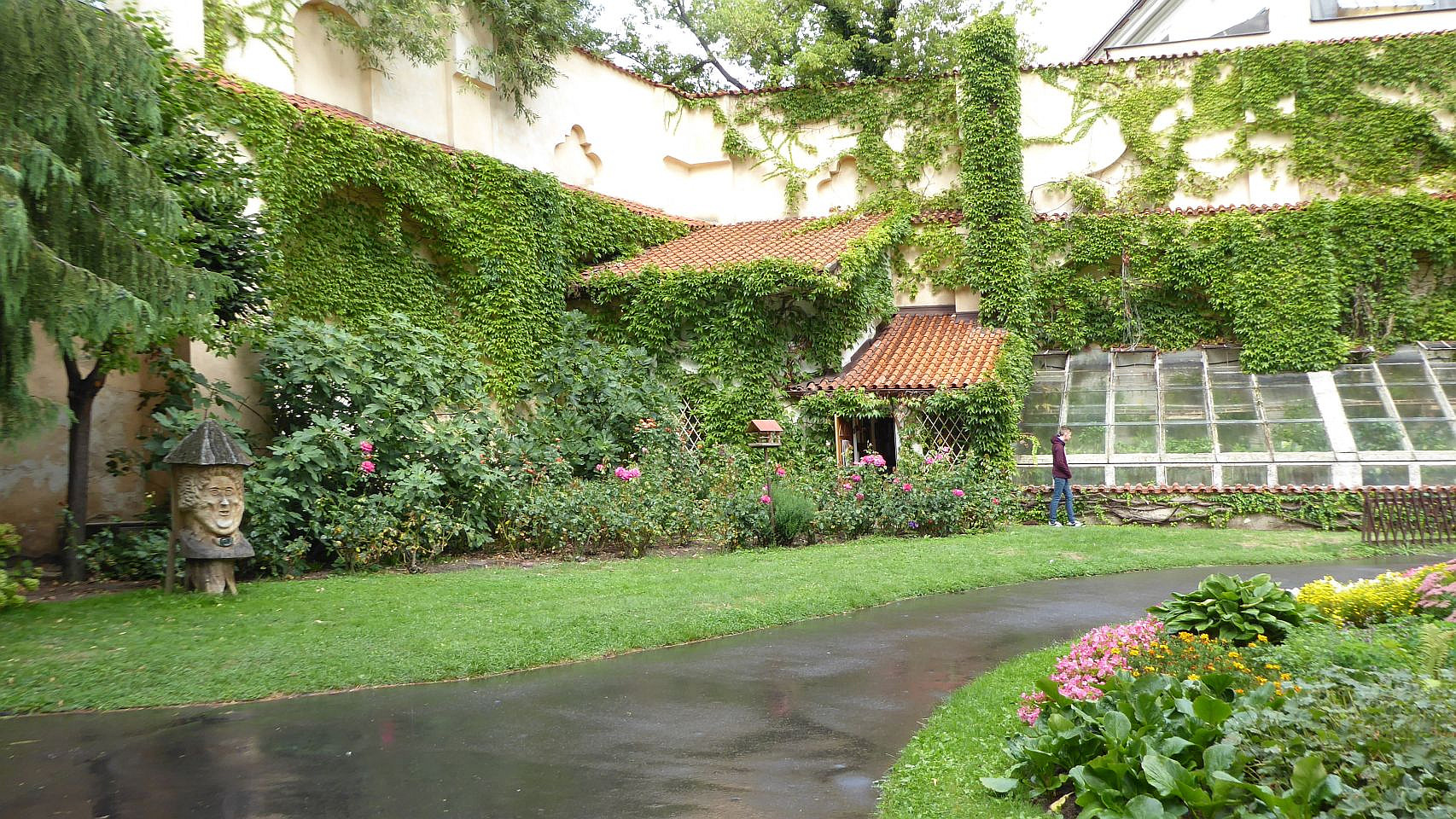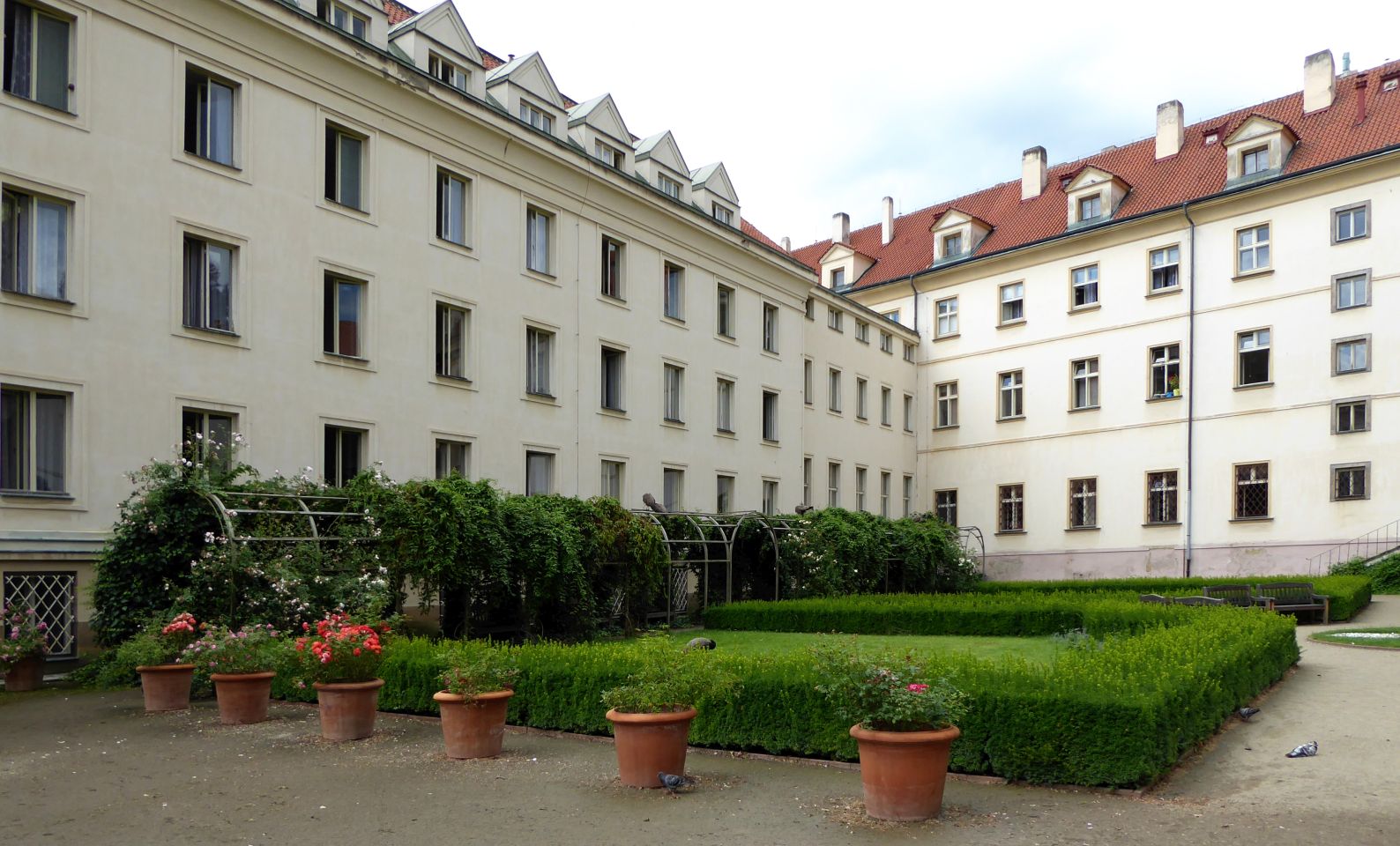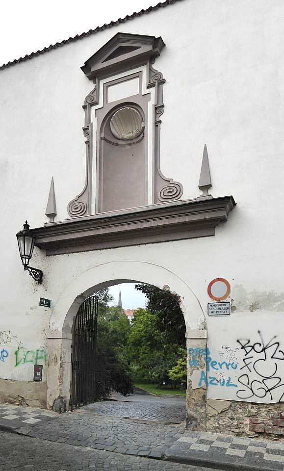 Auf der linken Straßenseite steht der Windischgrätz- und daneben der Thurn und Taxis-Palast (engl.) Durch den Thurn und Taxis-Palast und den Innenhof gelangen wir auf diesem wenig bekannten Weg in den Vojan-Park. Es handel sich um früheren Klostergarten der Barfüßigen Karmelitinnen an der Kirche hlg.Josef in den Jahren 1655-1782. Im Garten wurde die Gründerin und erste Priorin, die ehrwürdige Mutter Marie Elekta von Jesus 1663 in der Hlg. Elias-Kapelle hier im Park beerdigt. Ihr auf wundersamer Weise mumifizierter Körper ist in der Klosterkirche hl. Benedikts auf dem Hradschin sitzend aufgebahrt. Den Park verlassen wir nach einem Rundgang durch das Tor zur Straße U Lužického semináře - Zum Lausitzer Seminar.