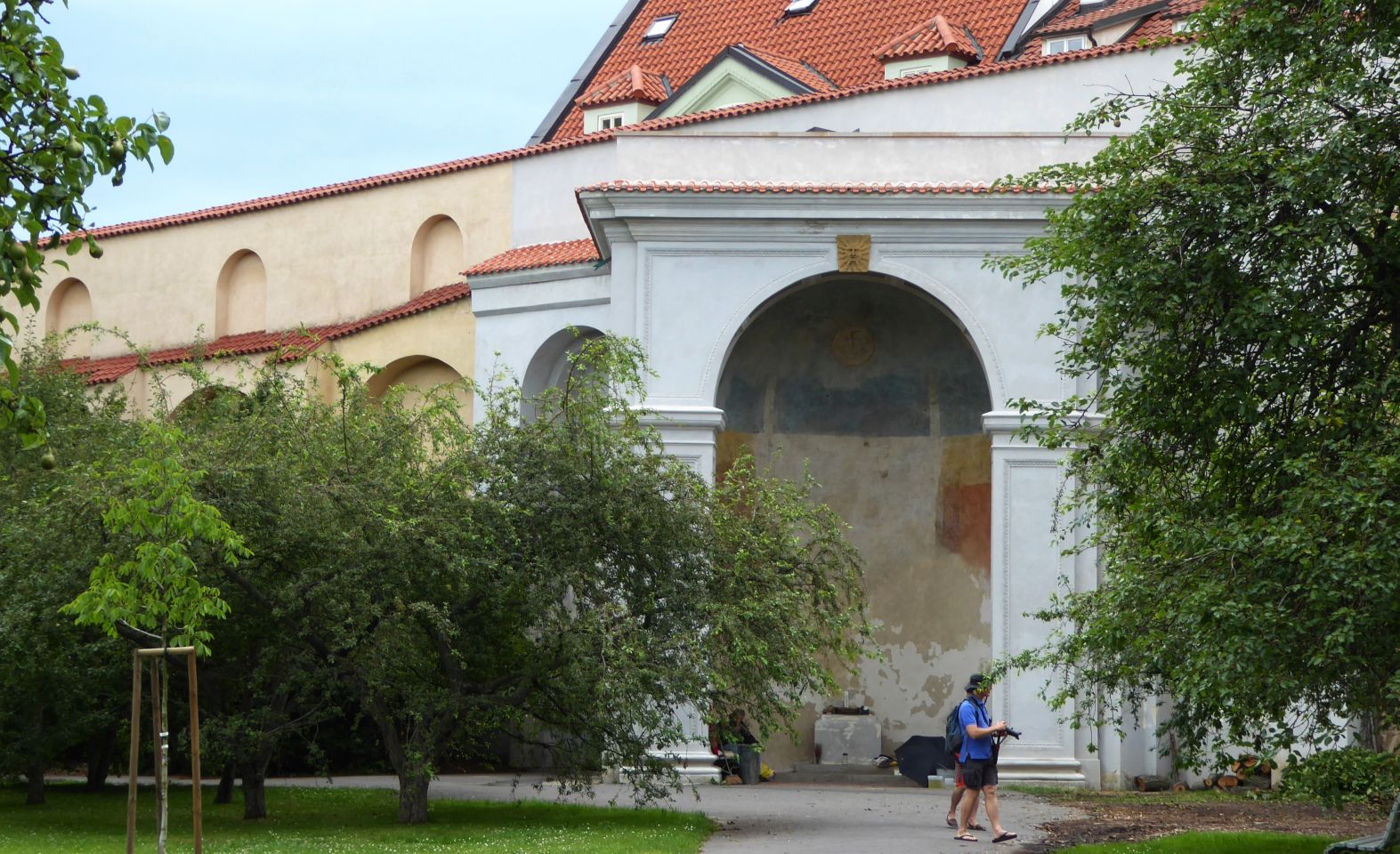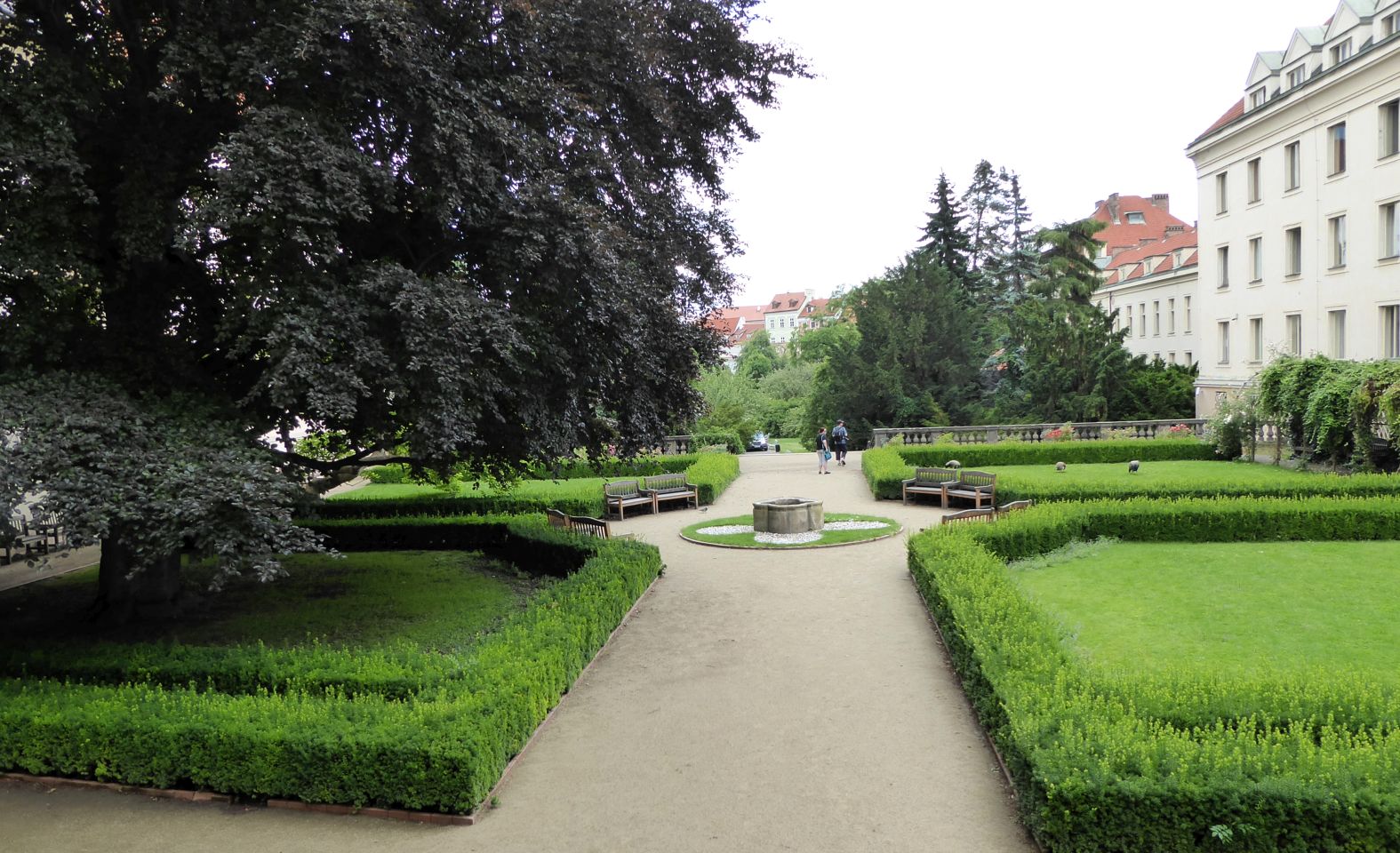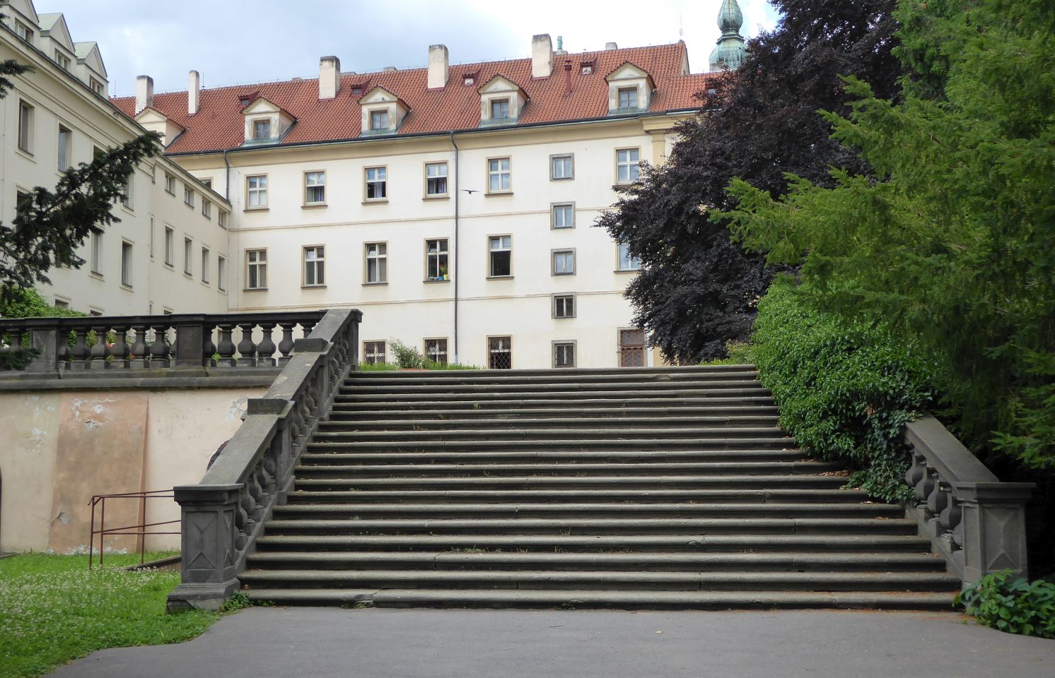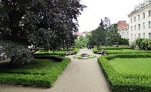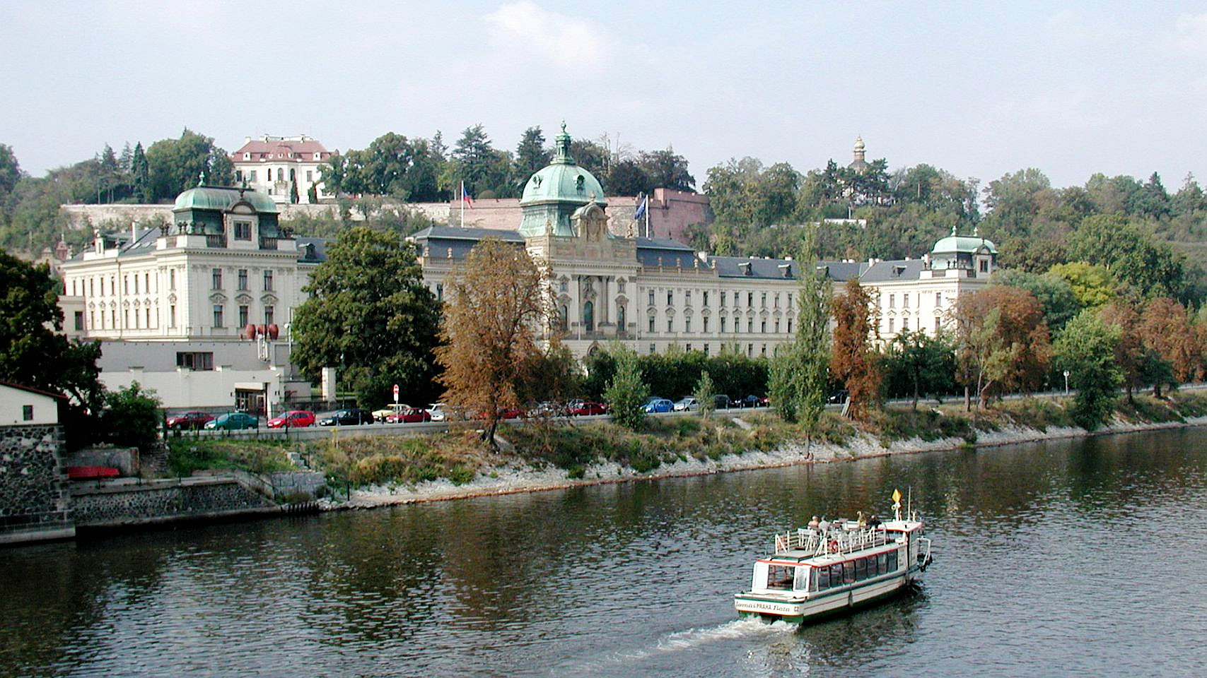 Wir gehen diesmal nicht in den Innenhof am Valdštejn-Reitstall, sondern nehmen den Ausgang zur Straße Klárov und überqueren die Straßenbahngleise. Ein kleiner Abstecher durch die Grünanlage in Richtung Moldau bringt uns zum Kosárkovo nábřeží - Kosárek-Ufer. Hier am Zaun entlang können wir einen Blick in den herrlichen Garten des früheren Palastes der Straka-Akademie, dem heutigen Sitz der tschechischen Regierung werfen. Der Garten ist leider nicht zugänglich und wir gehen zurück bis zu der Straßenbahnkreuzung und in die Straße Lužická