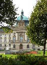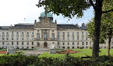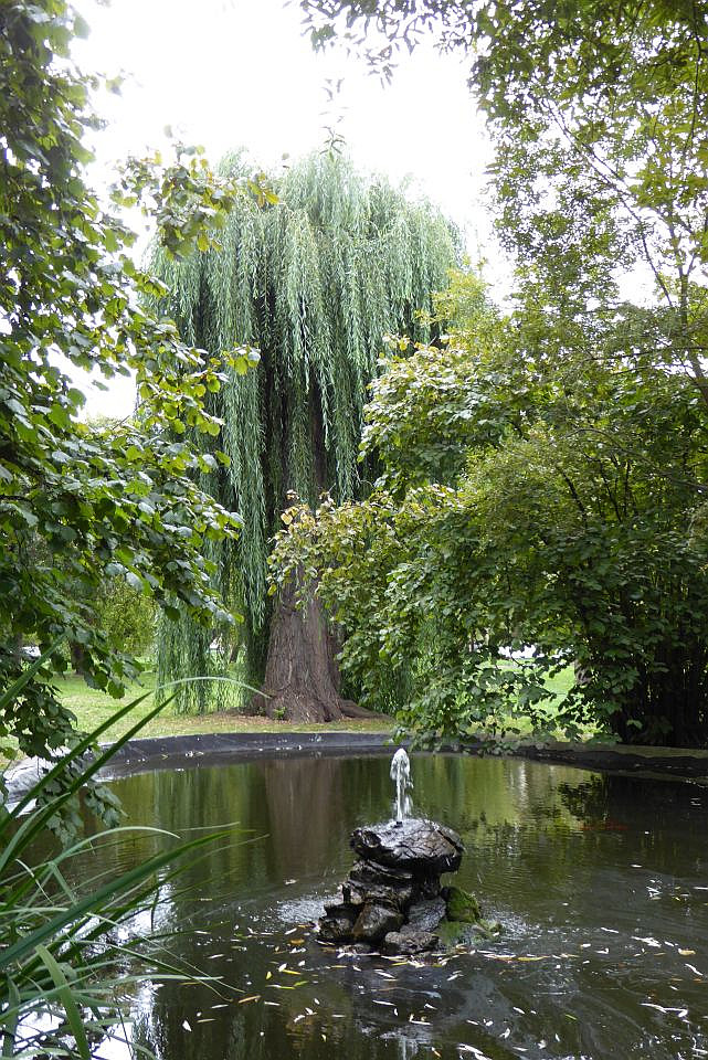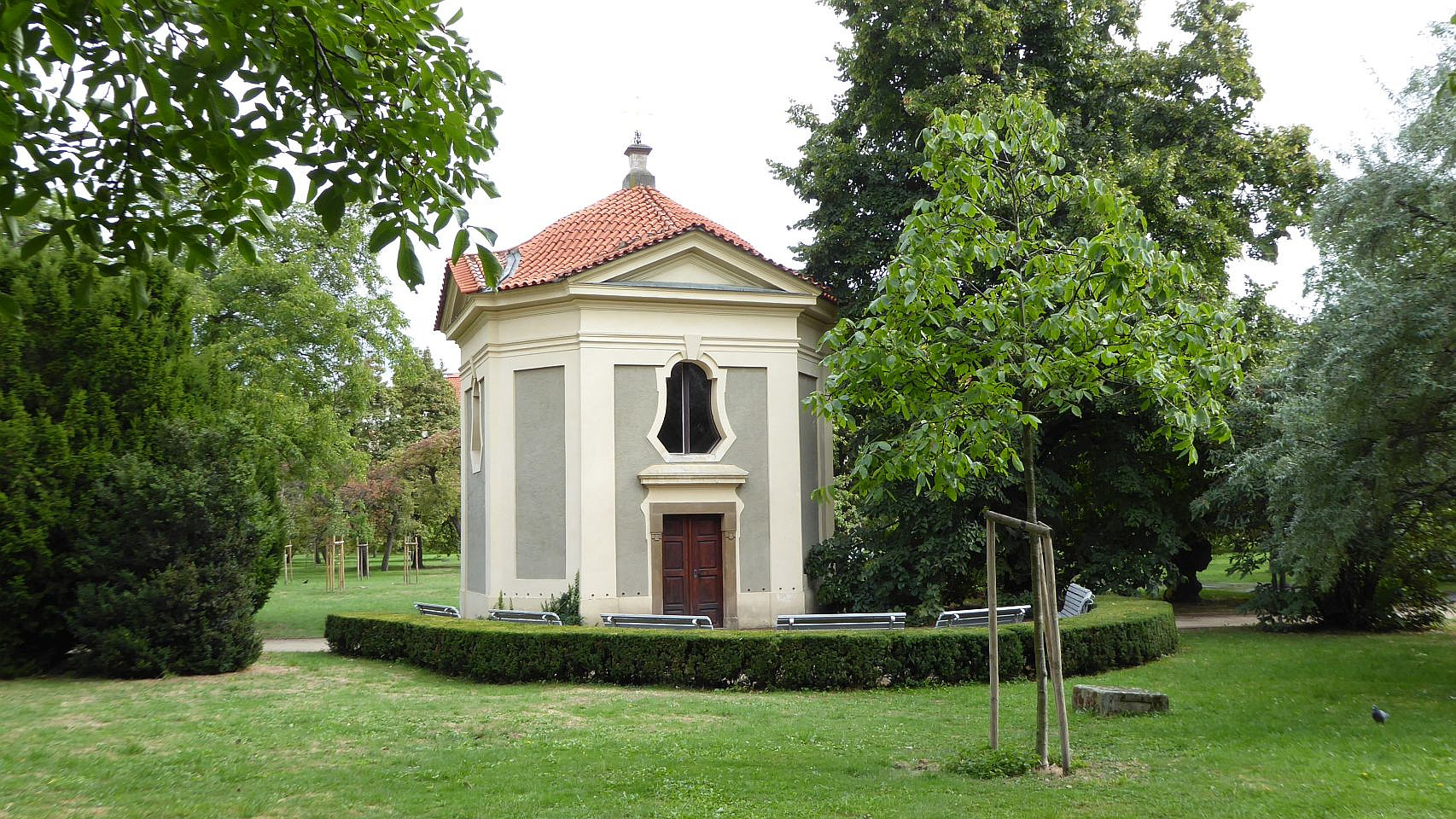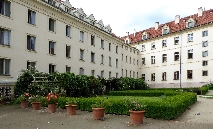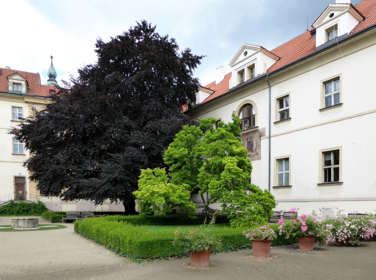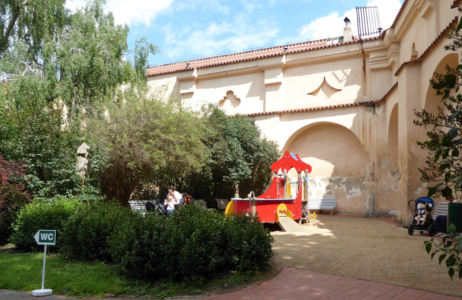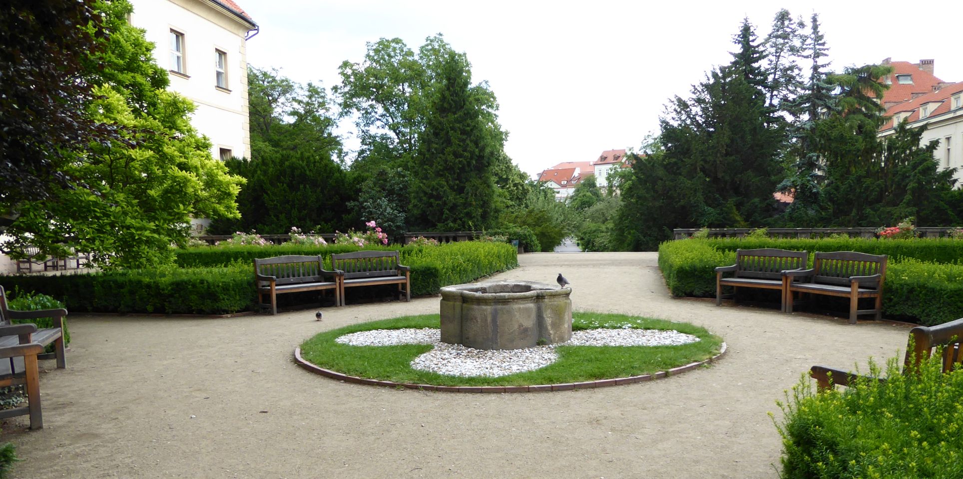 Wir gehen diesmal nicht in den Innenhof am Valdštejn-Reitstall, sondern nehmen den Ausgang zur Straße Klárov und überqueren die Straßenbahngleise. Ein kleiner Abstecher durch die Grünanlage in Richtung Moldau bringt uns zum Kosárkovo nábřeží - Kosárek-Ufer. Hier am Zaun entlang können wir einen Blick in den herrlichen Garten des früheren Palastes der Straka-Akademie, dem heutigen Sitz der tschechischen Regierung werfen. Der Garten ist leider nicht zugänglich und wir gehen zurück bis zu der Straßenbahnkreuzung und in die Straße Lužická
