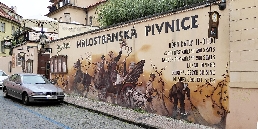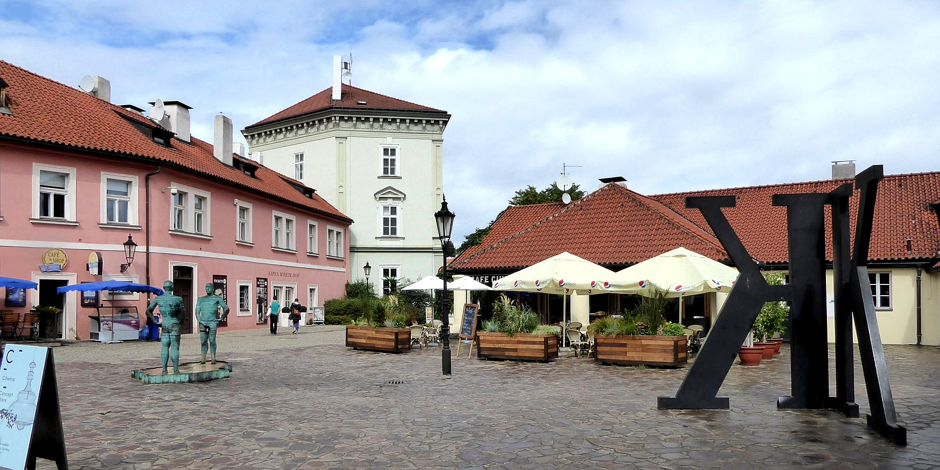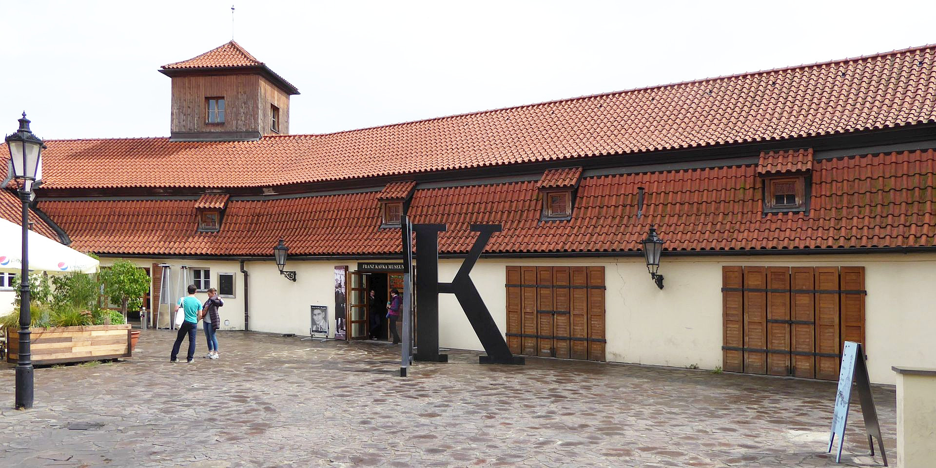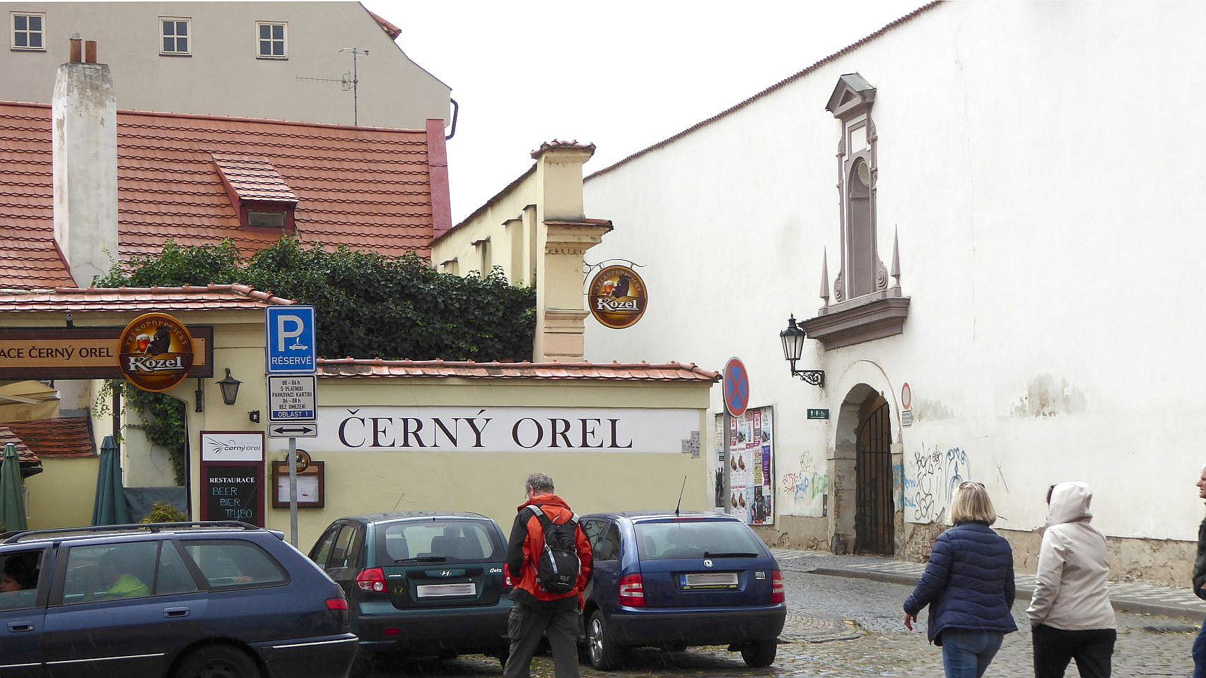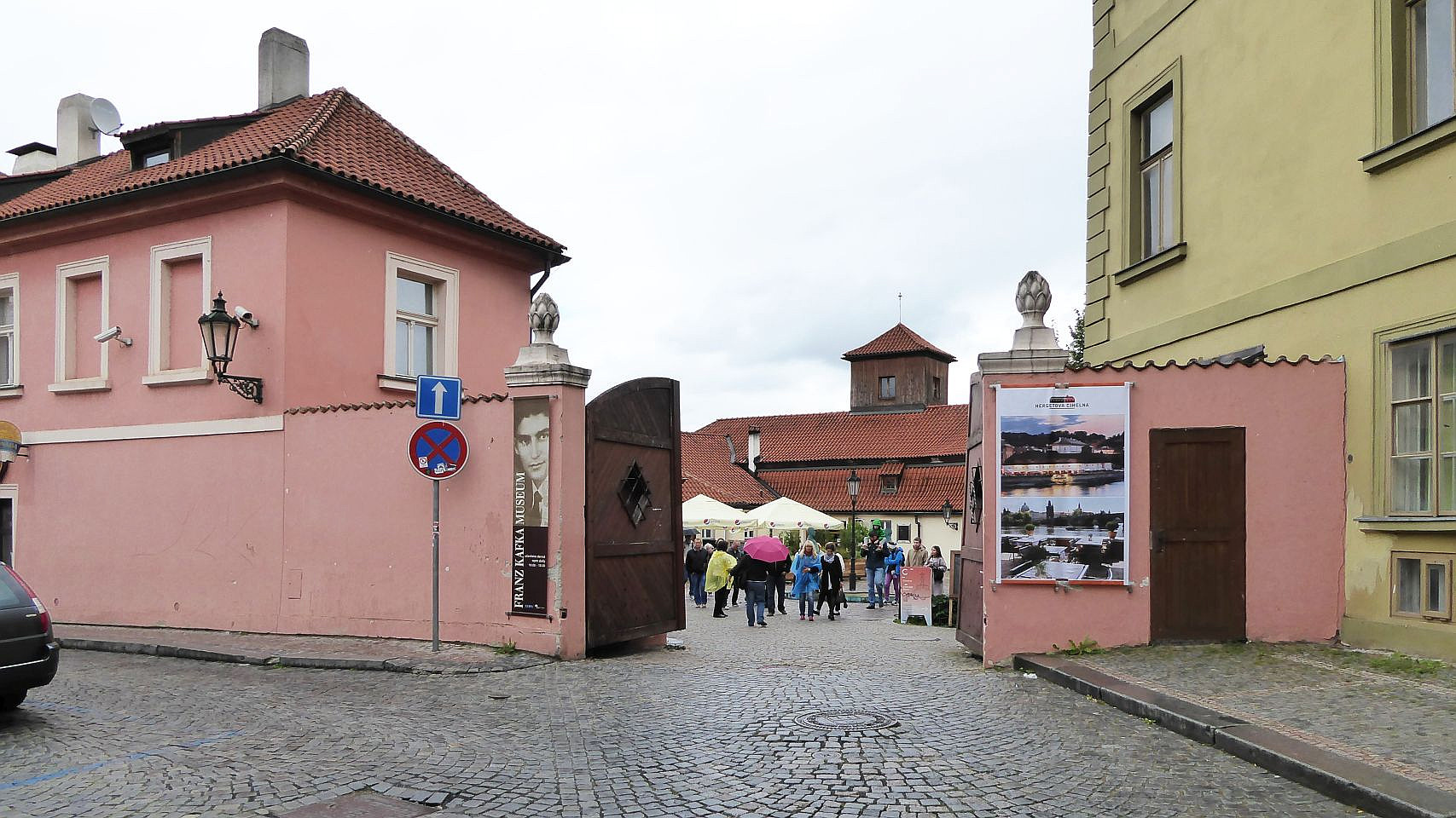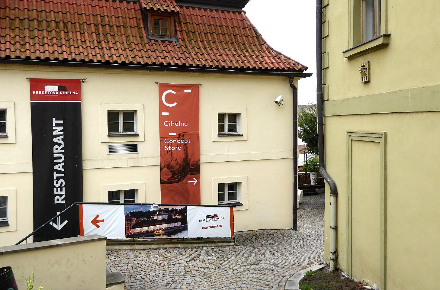 Wir gehen links und kommen an der Gabelung der Straßen U Lužického semináře - Zum Lausitzer Seminar und Cihelná - Ziegelei-Gasse zum Gartenrestaurant Černý orel - Schwarzer Adler und biegen rchts in die Cihelná ein. Nach ein paar Schritten stehen wir vor dem Tor zur früheren Herget-Ziegelei. Hier befindet sich das Franz Kafka-Museum.