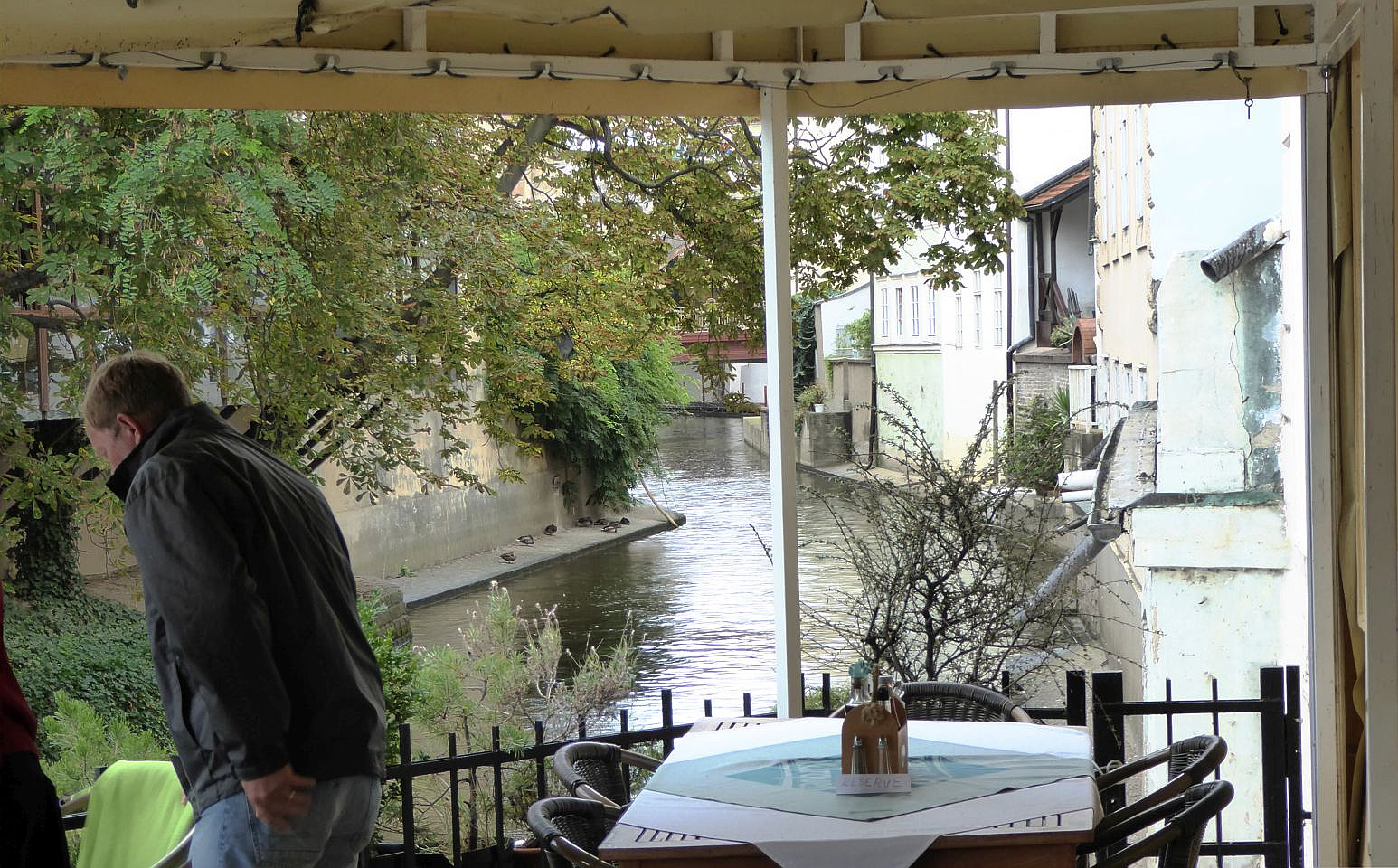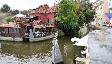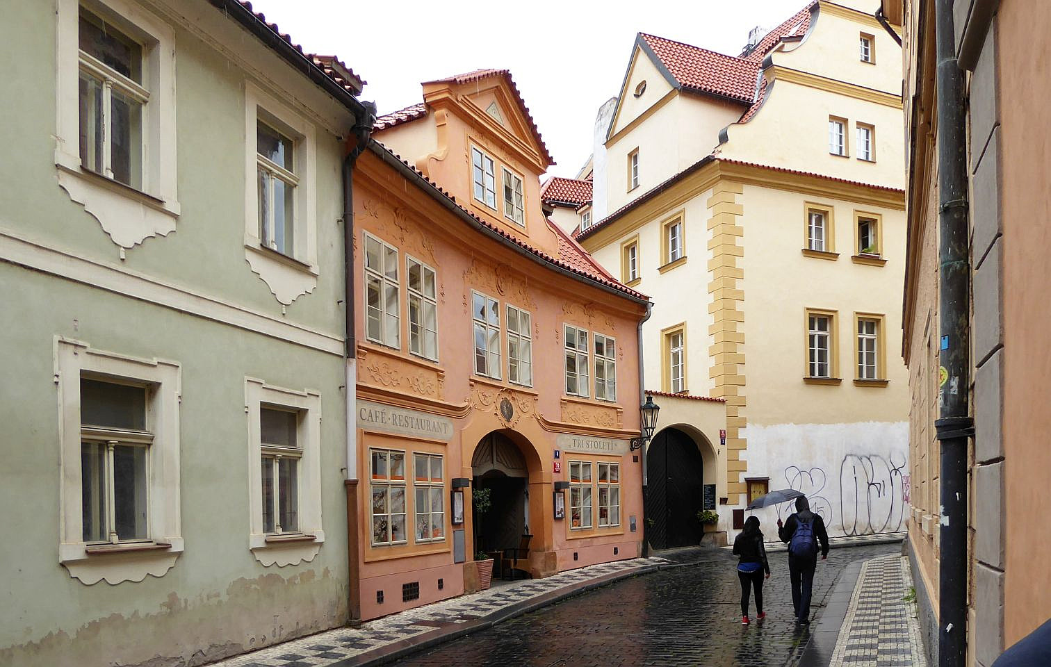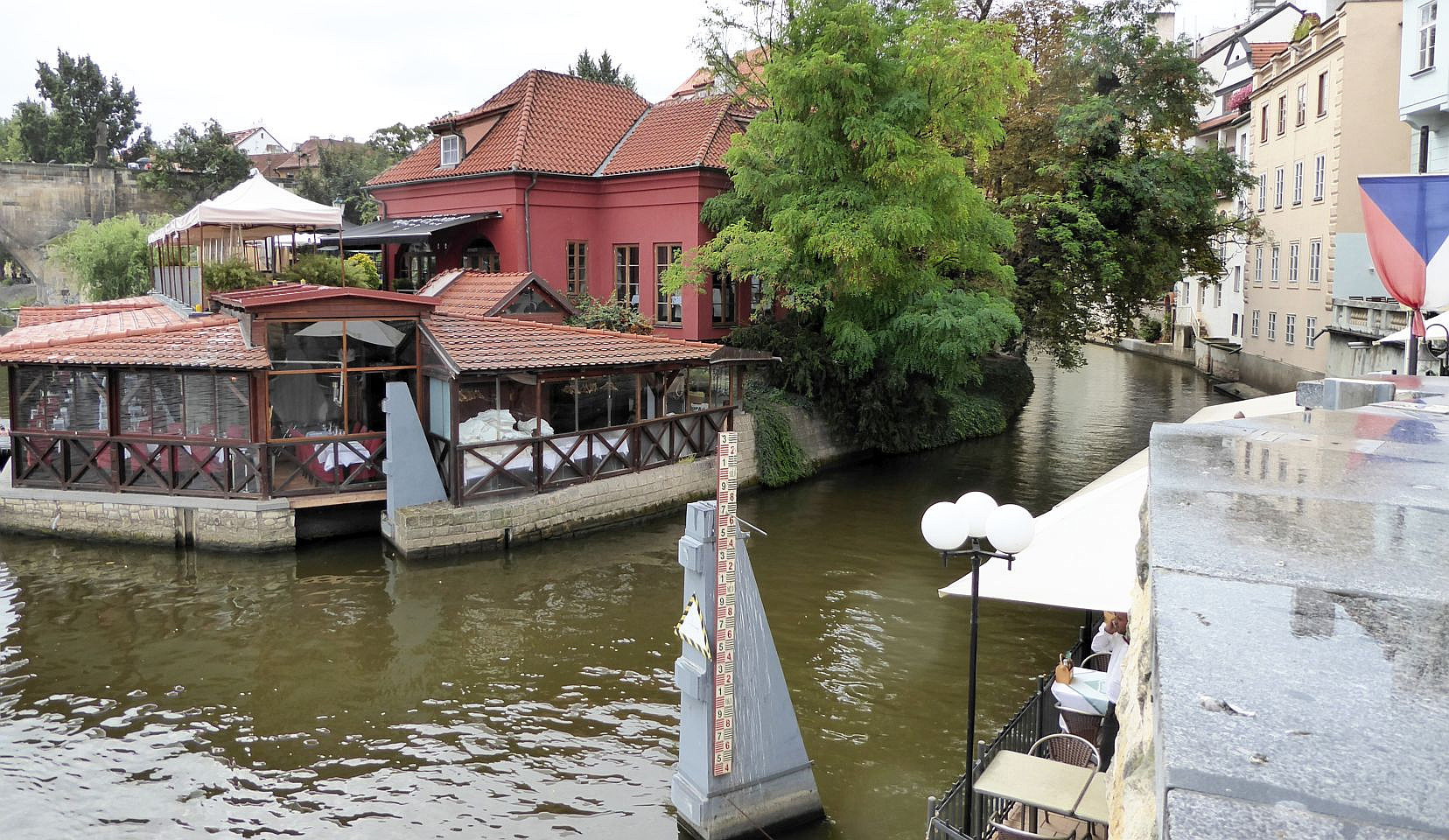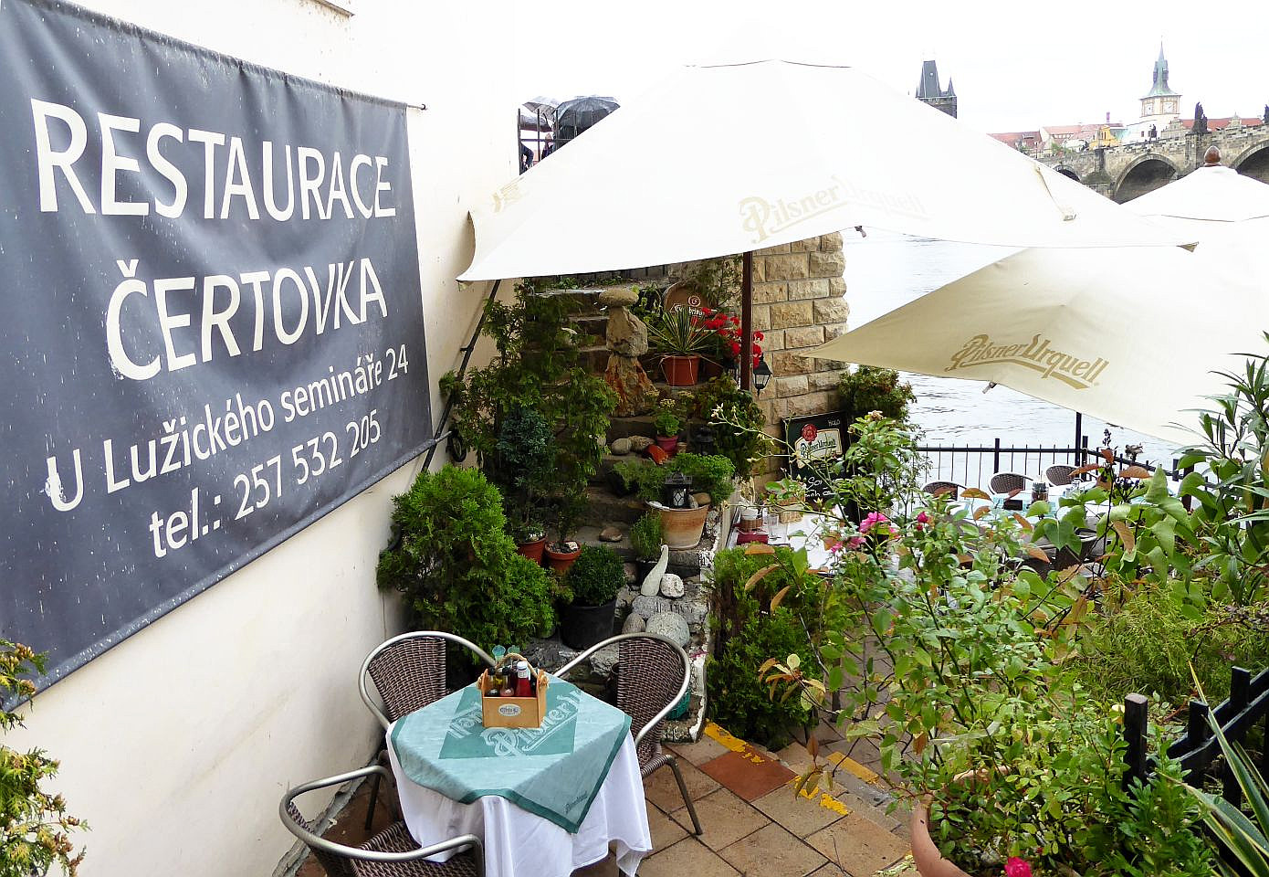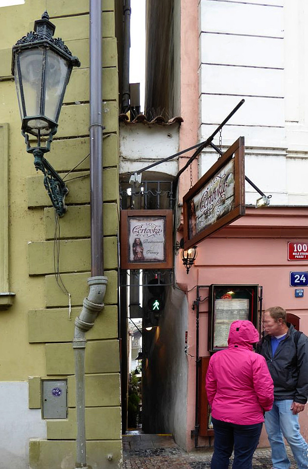 Weiter in der Cihelná erreichen wir auf der linken Straßenseite, neben der Haus-Nr.26, einen sehr schmalen, ampelgeregelten Treppendurchgang zur Moldau, zum Restaurant Čertovka mit dem schönen Blick in den Mühlbach Čertovka. Nach ein paar Schritten laufen hier die Straßen Cihelná und U Lužického semináře zusammen und wir kommen zu der Seitenstraße Míšenská.