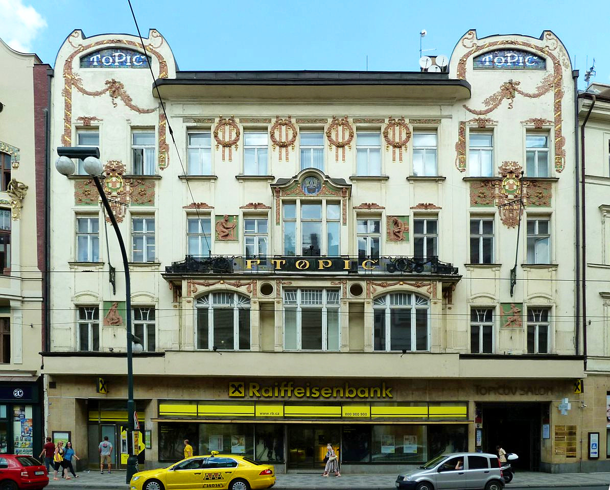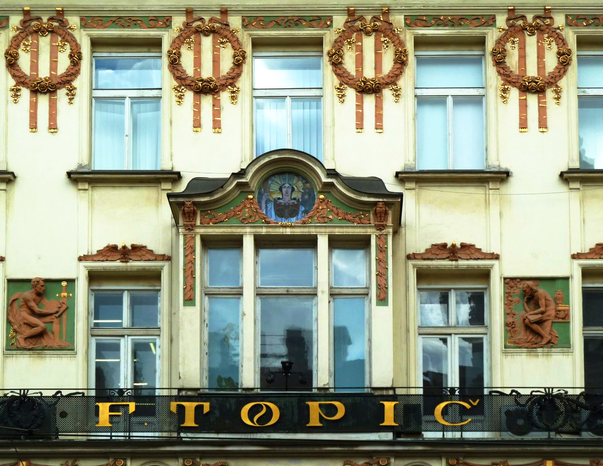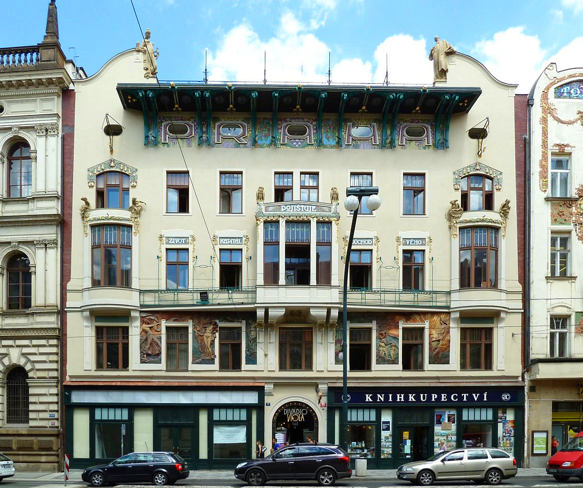 Gegenüber kommen wir zu zwei Häussern des damaligen Verlegers František Topič, die Anfang des 20Jh. im Secessions-Stil vom Architekten Osvald Polívka umgebaut wurden. In einem siedelte die Versicherungsanstalt PRAHA und im Nebenhaus der Verlag von František Topič.