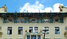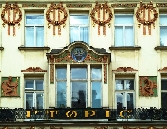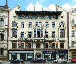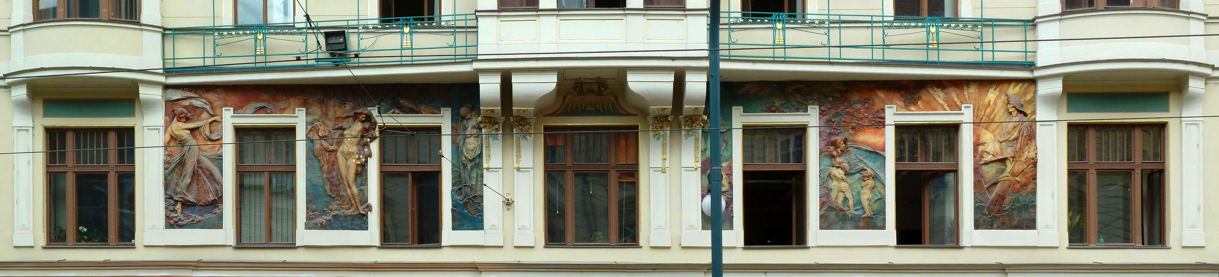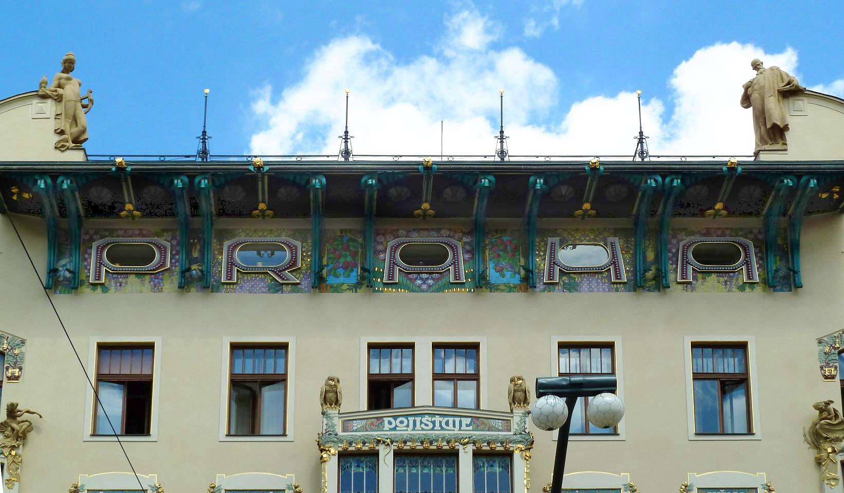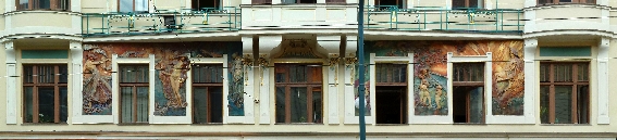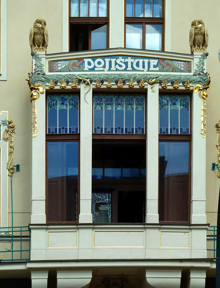 Gegenüber kommen wir zu zwei Häussern des damaligen Verlegers František Topič, die Anfang des 20Jh. im Secessions-Stil vom Architekten Osvald Polívka umgebaut wurden. In einem siedelte die Versicherungsanstalt PRAHA und im Nebenhaus der Verlag von František Topič.