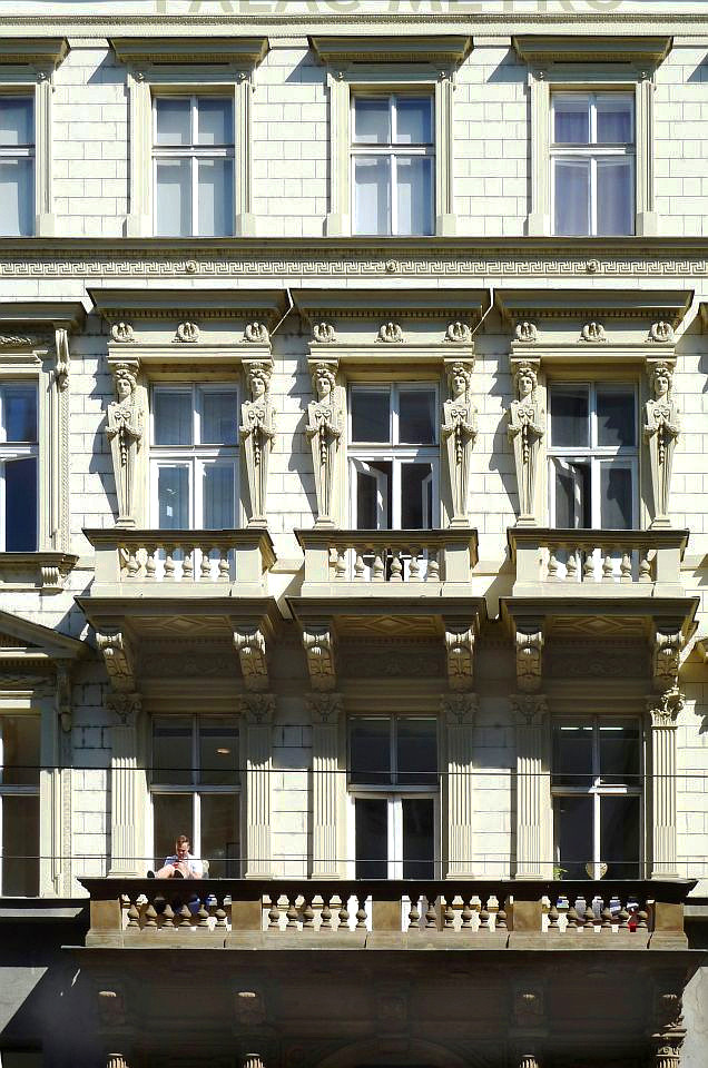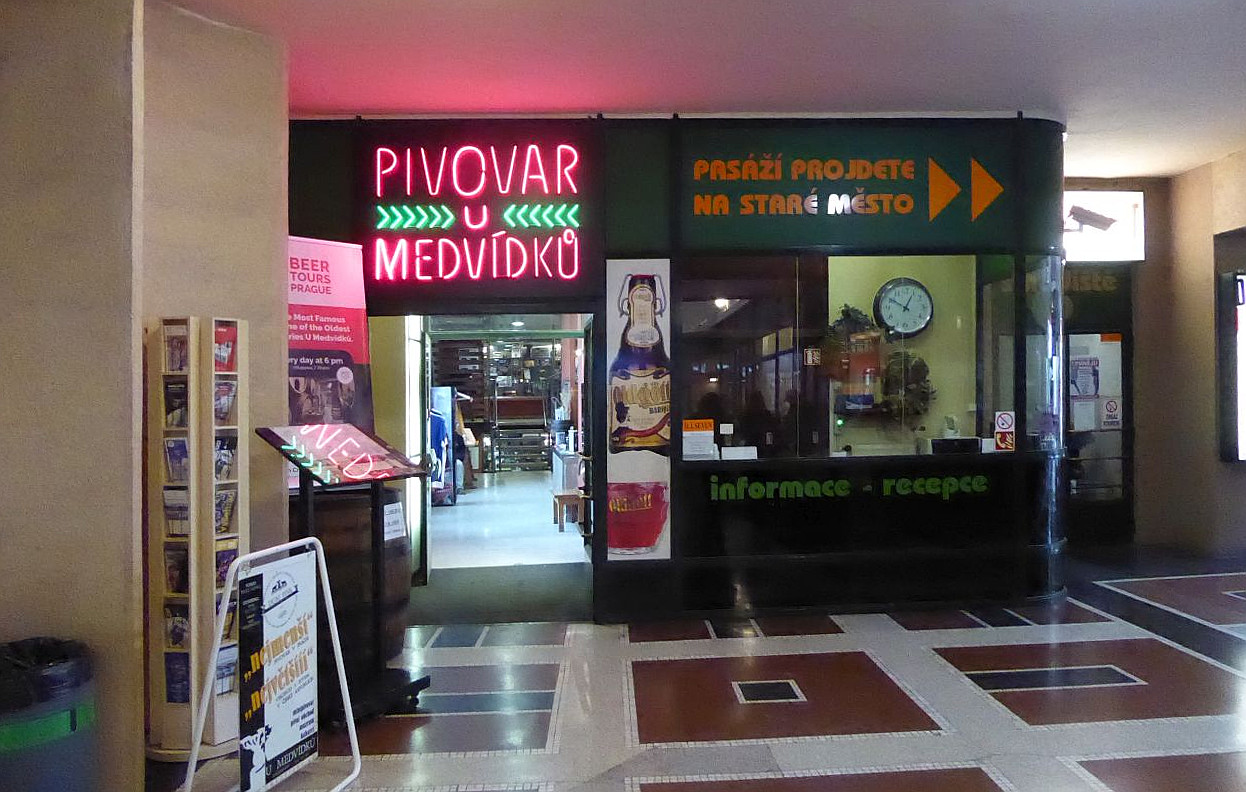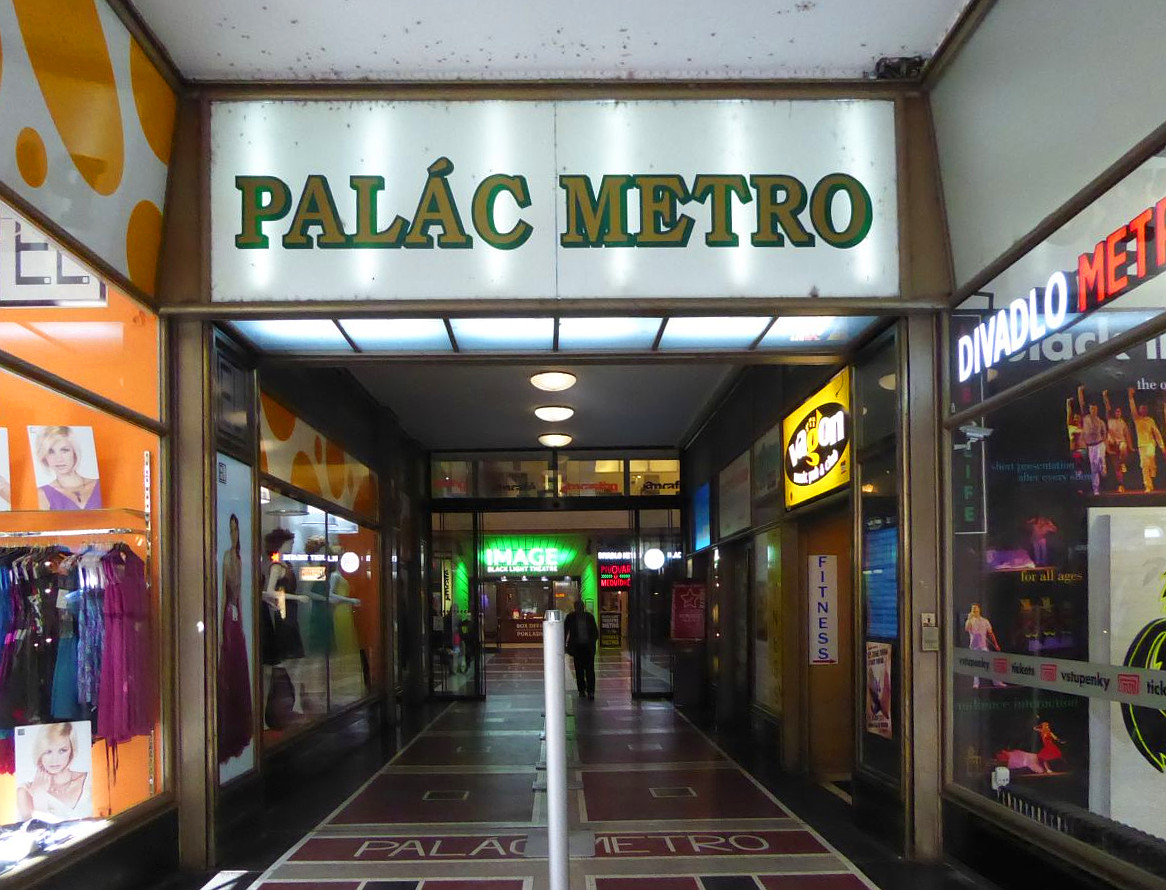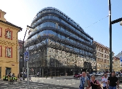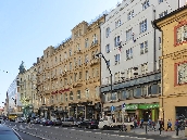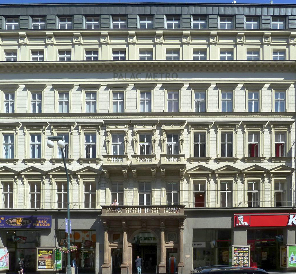 Gegenüber, durch den Palast Metro, ein Einkaufszentrum von 1928, können wir zum Brauhaus U Medvídků - Zu den Bärchen in der Altstadt gelangen. Der Haupteingang ist in der folgenden Nebenstraße Na Perštýně. Beschrieben ist das Brauhaus in dem Altstadt-Spaziergang - Anna- und Betlehem-Viertel.Zurück auf die rechte Straßenseite erreichen wir das Kaufhaus My der Handelskette Tesco. Gebaut wurde es 1972-75 und trug bis 1992 den Namen Máj (Mai) und damit zumindest phonetisch den Namen beibehalten. Hinter dem Kaufhaus entstand in der Nebenstraße Spálená ein neues Einkaufszentrum Quadrio, mit dem es Innen durchverbunden ist.