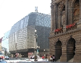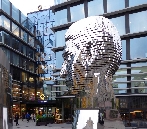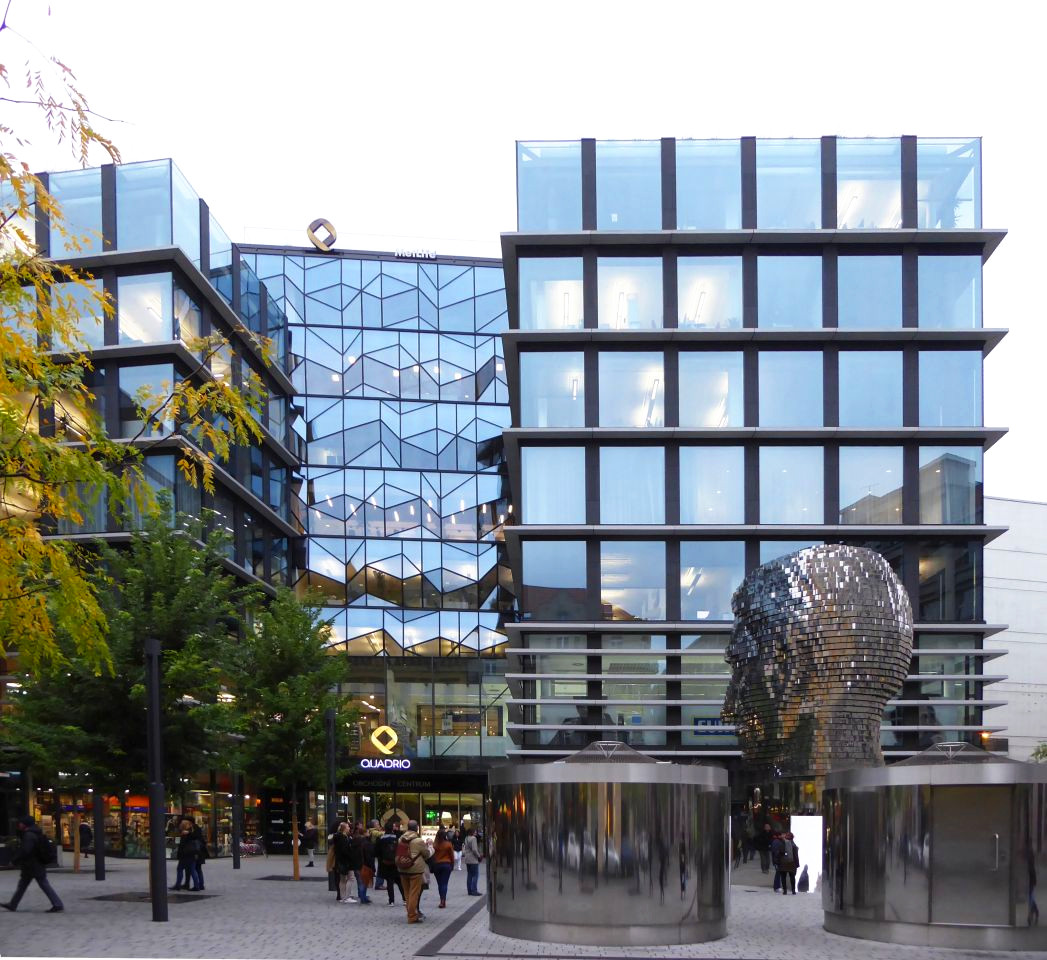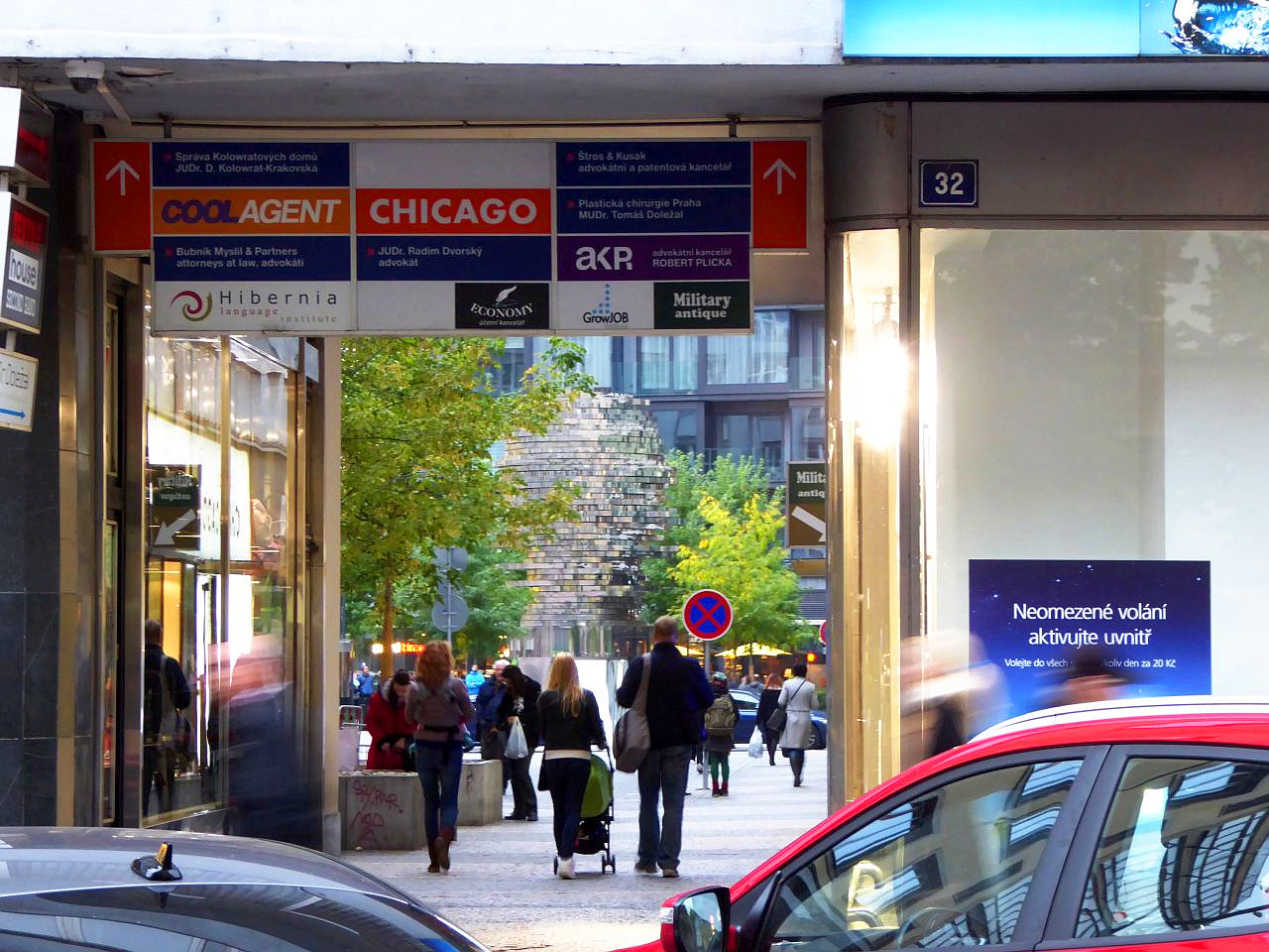 Weiter auf dieser Straßenseite kommen wir zum Palast Chicago, ähnlich dem Kaufhaus Baťa am Wenzelsplatz. Durch die Passage gelangen wir zum Vorplatz des Einkaufszentrums Quadrio. Hier steht eine weitere Atraktion des zeitgenössischen Bildhauers David Černý, Metalmorphosis, eine sich in sich drehende Büste des Schriftstellers Franz Kafka.