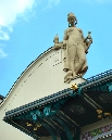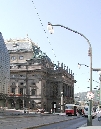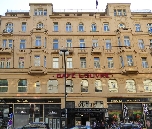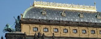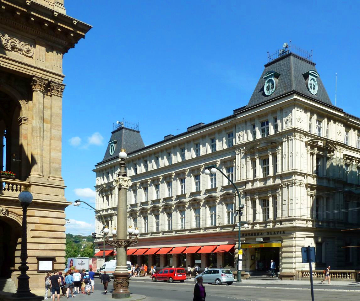 Von der Legionen-Brücke kommen wir in die Nationalstraße - Národní třída. Links an der Ecke mit der Smetana-Uferstraße steht der Lažanský-Palast, erbaut 1863, mit dem berühmten Kafeehaus Slavia. Das Café wurde 1884 als Theatercafé des gegenüber liegenden National-Theaters in einem, dem Grafen Leopold Lažanský z Bukové gehörigen Palast eingerichtet, war aber auch ein Künstler-Café. Zu den Stammgästen zählten Bedřich Smetana (der auch zeitweilig an dieser Adresse wohnte) und war auch Treffpunkt von Autoren wie Karel Čapek, Jaroslav Seifert oder später, zur Zeit des Kommunismus Václav Havel, dem späteren Präsidenten . Auch Egon Erwin Kisch (Der rasende Reporter) und die letzte deutschsprachige Erzählerin Prags Lenka Reinerová verkehrten hier.