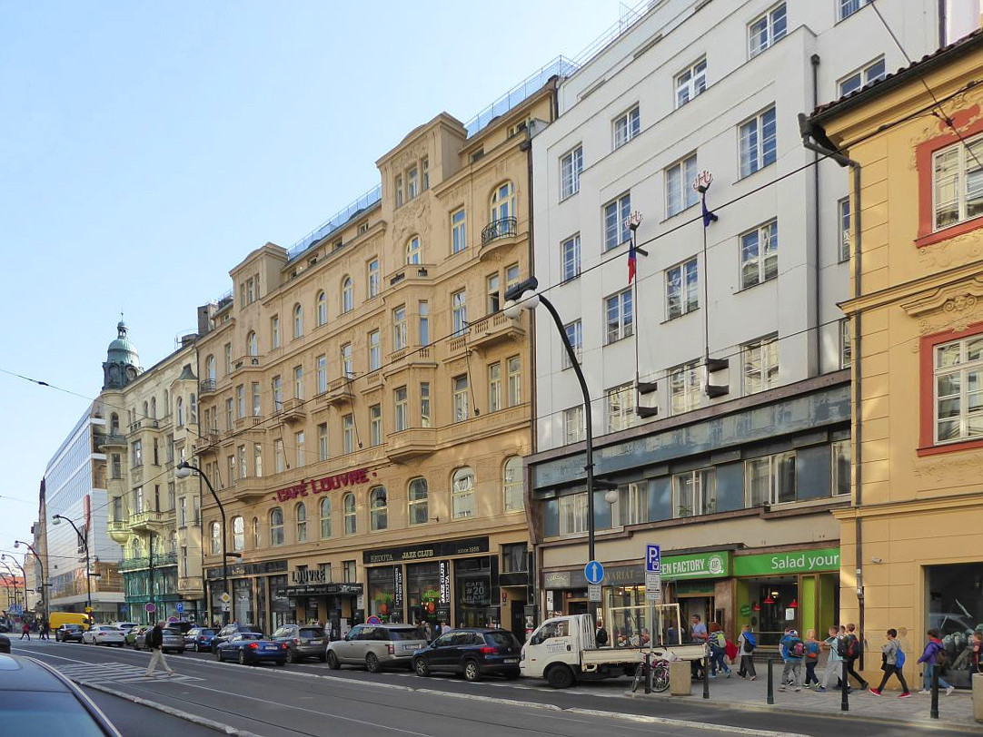 Das übernächste Gebäude ist ein traditionelles Kafeehaus Café Louvre von 1902. Zu den berühmten Gästen gehörten u.a. tschechische, deutsche und jüdische Schriftsteller, Reporter und Gelehrten. Dazu zählte auch Albert Einstein während seiner Tätigkeit in Prag.