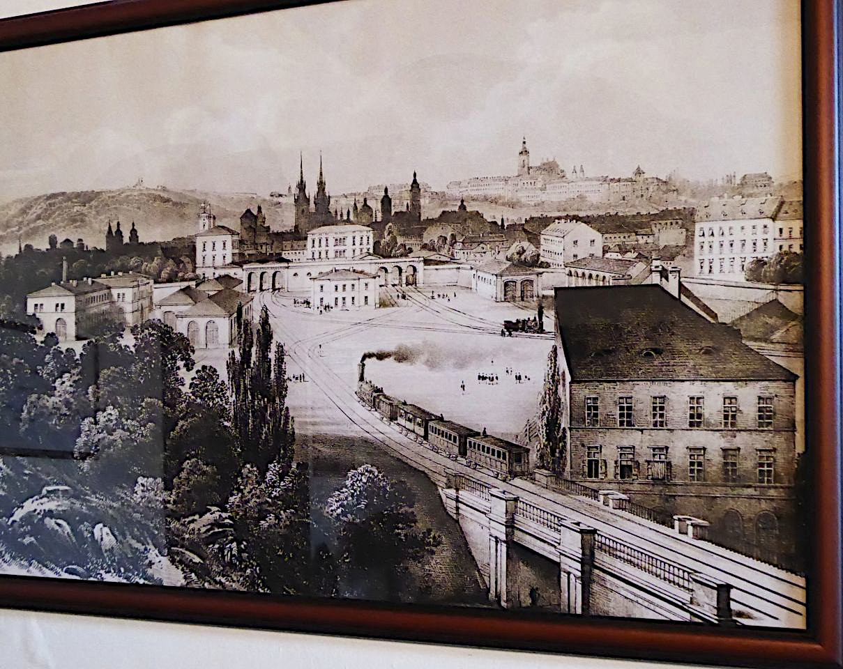Der Masaryk-Bahnhof ist der erste Dampfeisenbahn-Bahnhof in Prag, 1844-45 als Kopfbahnhof erbaut am Kilometerstein 409,8 von Wien der K.u.K-Staatsbahn. (Bahn der Königlichen und Kaiserlichen Monarchie Österreich-Ungarn). Am 1.Juni 1850 wurde ein neuer Abschnitt der Bahntrasse Richtung Norden über die Negrelli-Brücke über die Moldau eröffnet. Der Bahnhof trug erst den Namen Praha, während der deutschen Okkupation Hybernerbahnhof danach nach der Gründung der Tschechoslowakei den Namen des ersten Präsidenten Masaryk-Bahnhof. Währen der kommunistischen Herrschaft in Praha střed (Prag Mitte) umbenannt und ab 1990 wieder in Masaryk-Bahnhof.